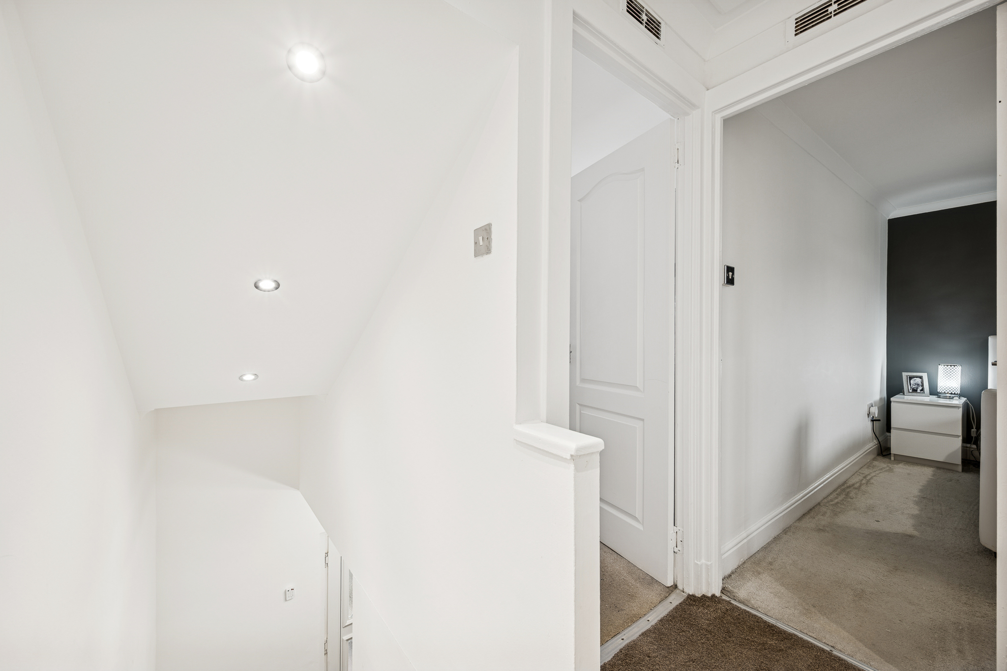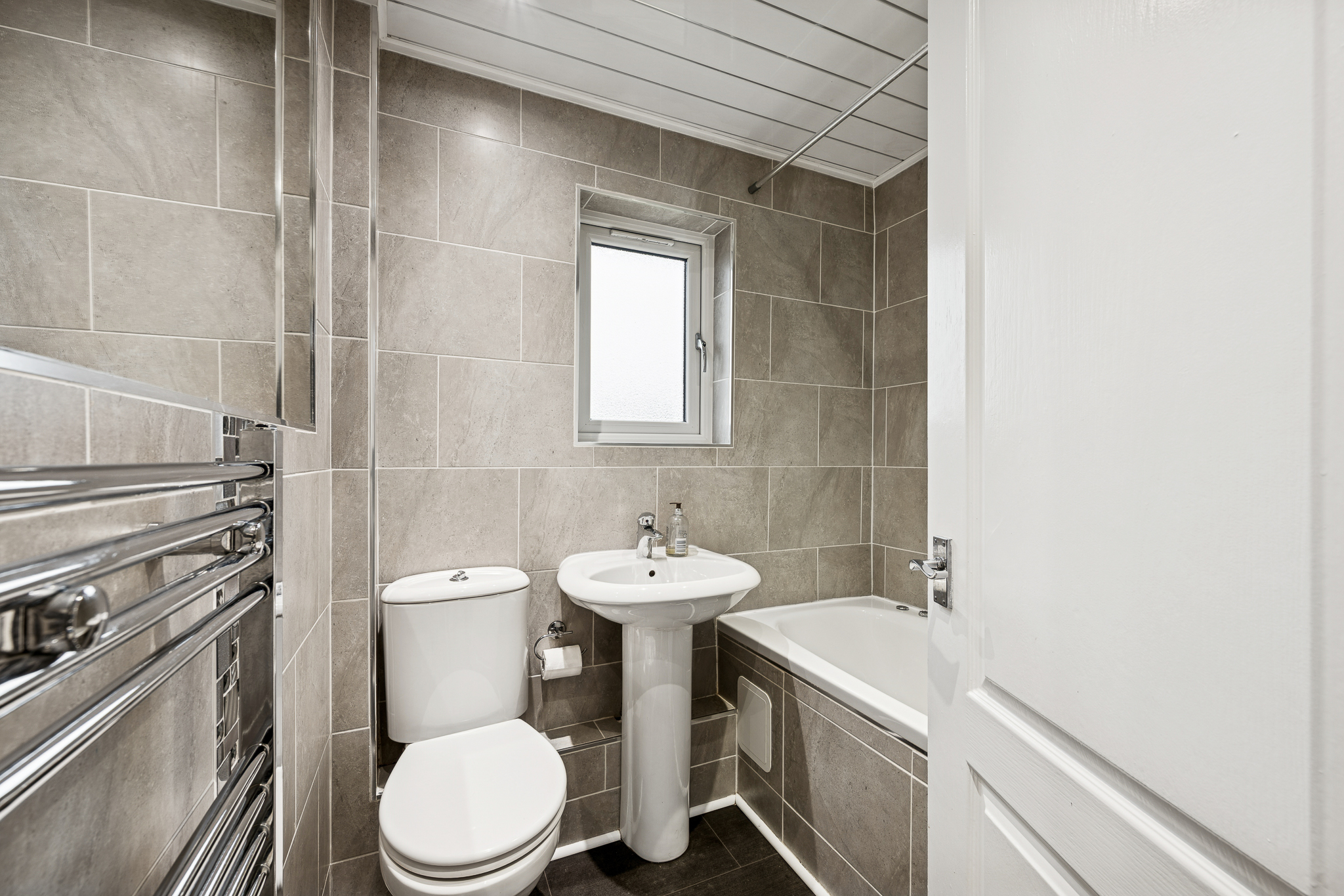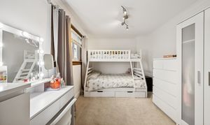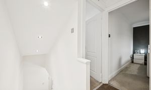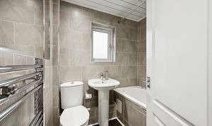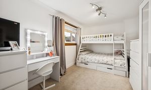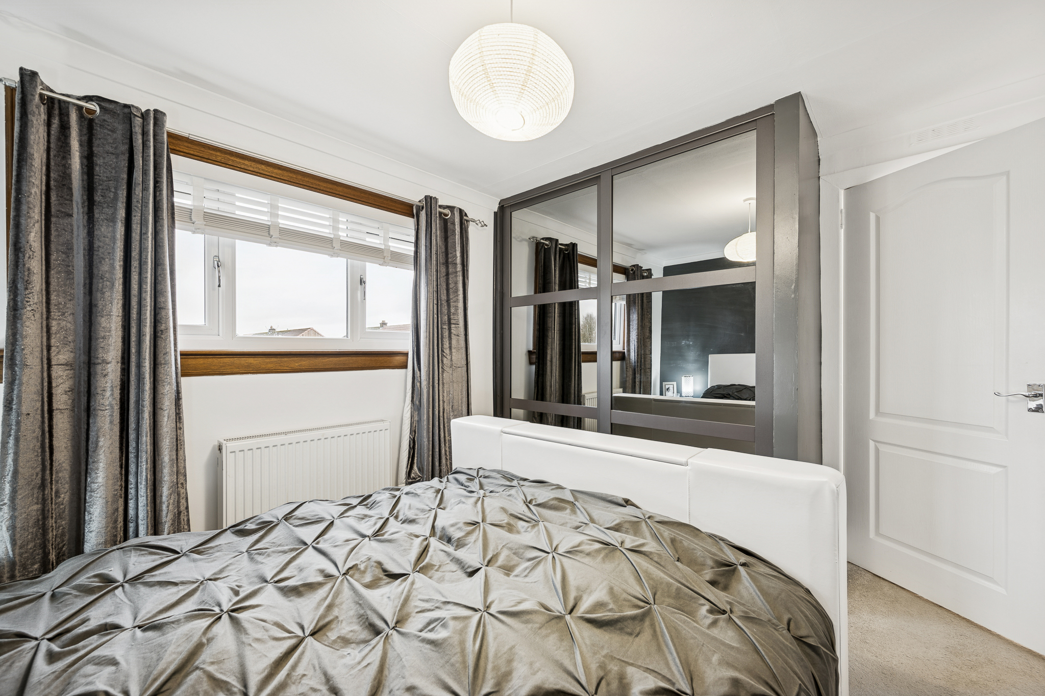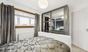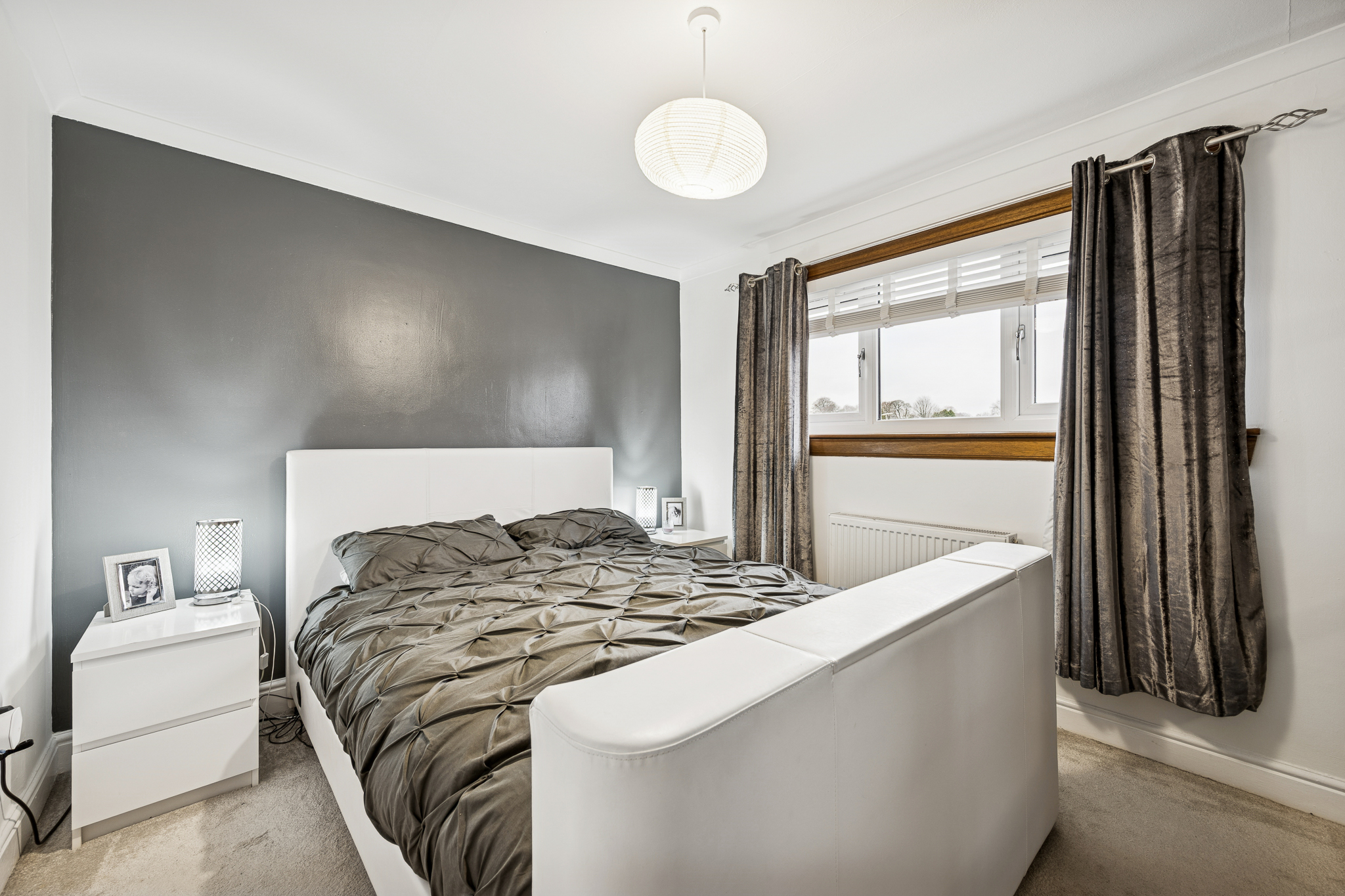 Upstairs, the landing introduces two spacious double bedrooms. The principal bedroom comfortably accommodates a king-size bed, with bedside cabinets and a fitted wardrobe offering excellent built-in storage. Bedroom two can also host a king-size bed and includes a fitted cupboard along with space for additional wardrobes or furniture, making it a flexible room for guests, children, or a home office setup. The family bathroom is fully tiled and finished to a move-in-ready standard, featuring a three-piece suite with a standing shower, overhead shower head, chrome heated towel rail and a made to-measure mirror.