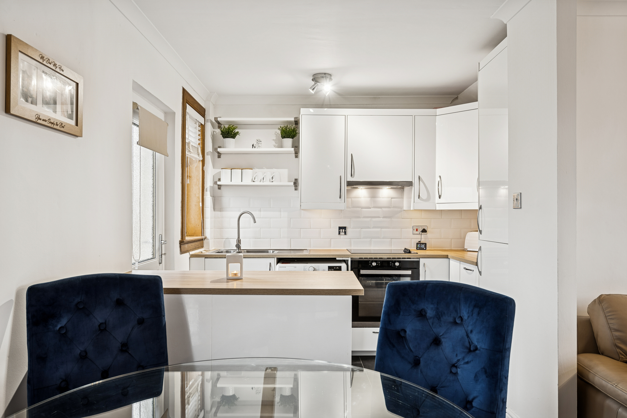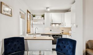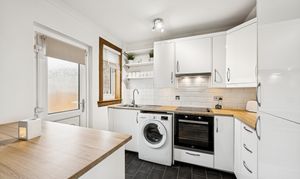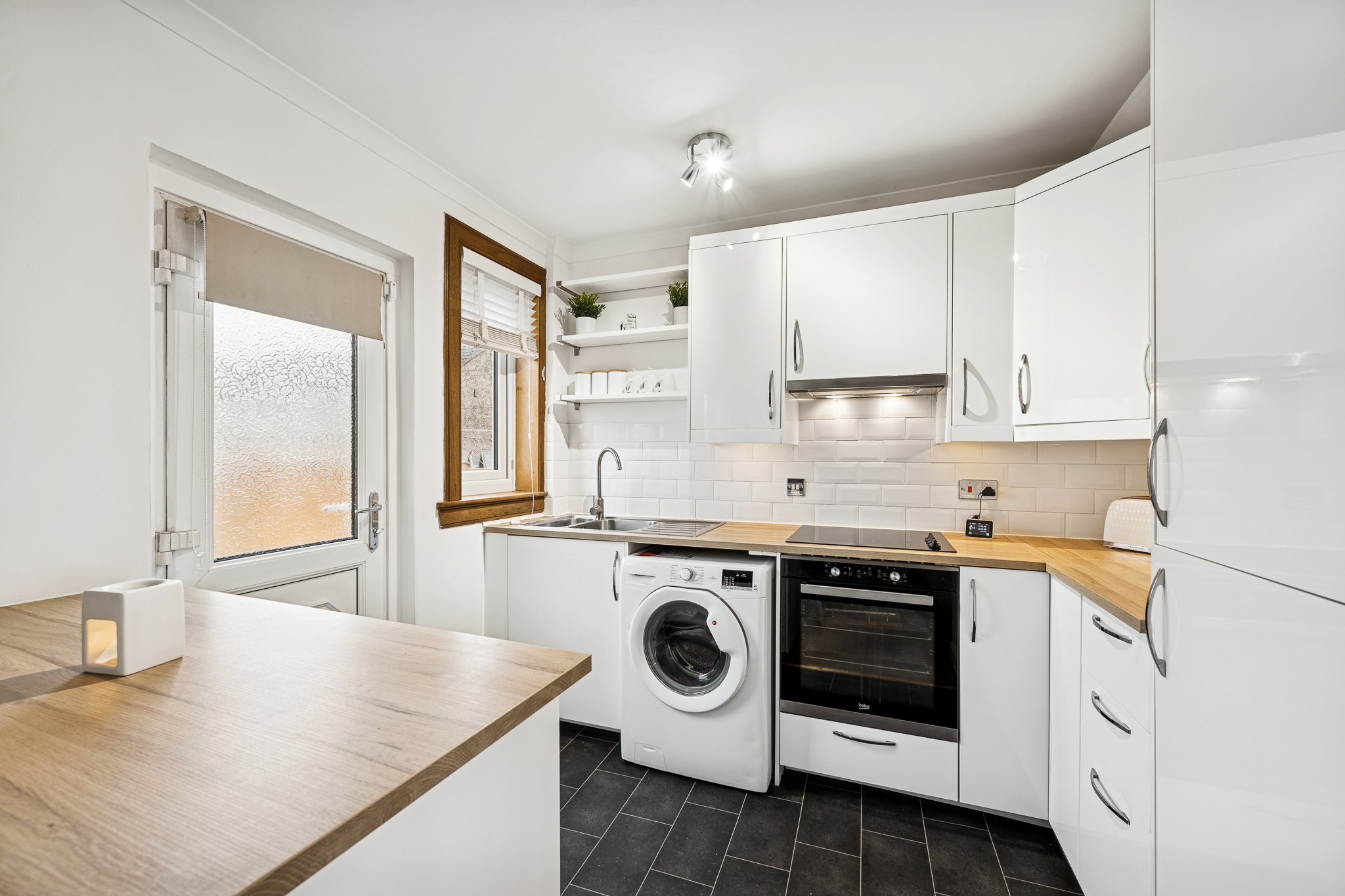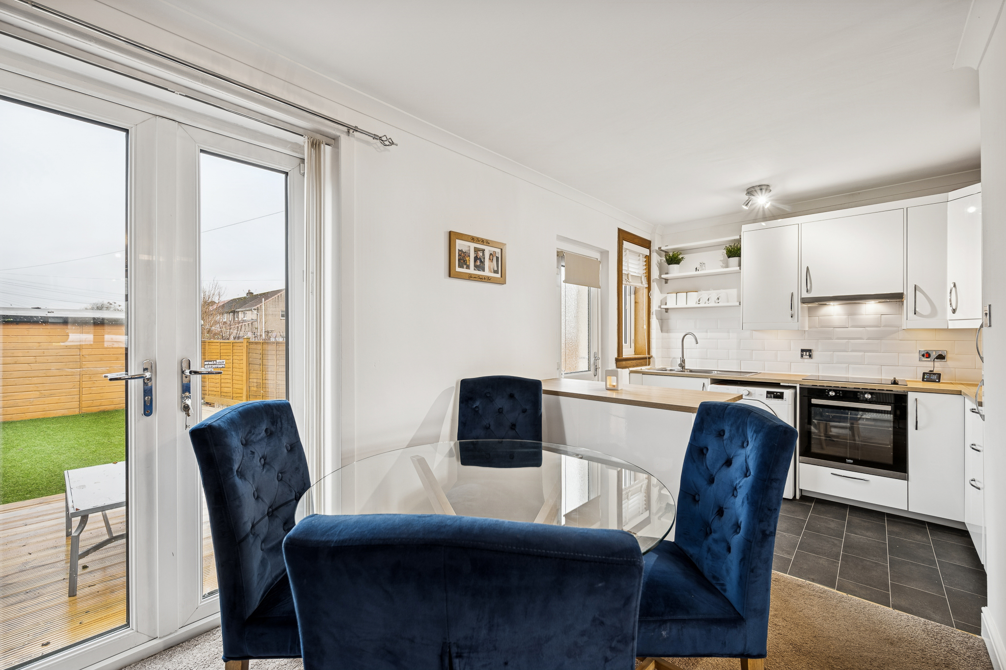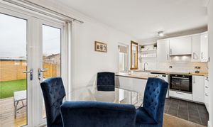 Patio doors from the dining area lead directly into the rear garden, while the adjacent kitchen adds another layer of convenience. Finished with sleek white-gloss cabinetry and wooden-style worktops, the kitchen offers a modern and functional layout with an integrated oven, a four-point induction hob, splashback tiling, chrome fittings, integrated fridge freezer and space for a washing machine. A rear door provides seamless access to the garden, ideal for everyday living.