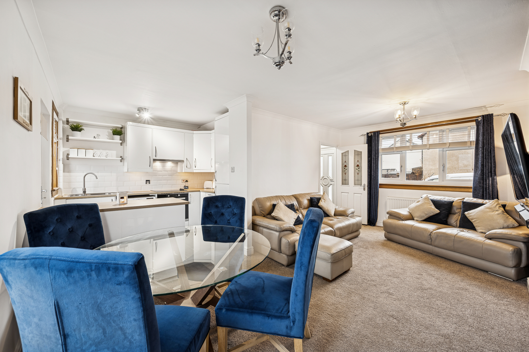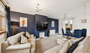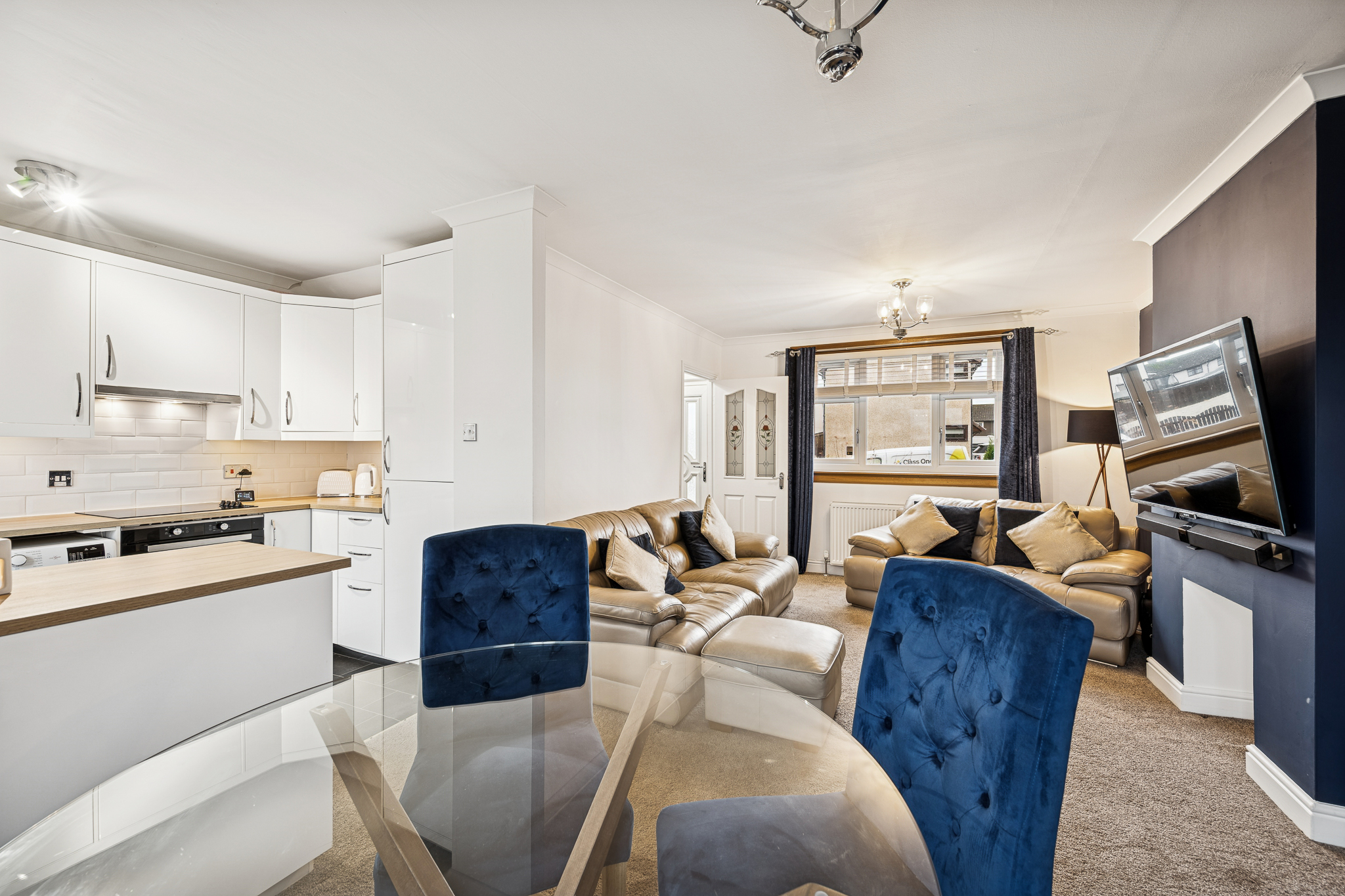 As you enter, you are welcomed into a bright hallway with useful storage beneath the stairs and a handy alcove ideal for shoes and everyday essentials. To the left, the open plan lounge and dining area spans the full length of the home, creating a spacious and inviting setting for relaxing or hosting. A large front-facing window floods the room with natural light, while the layout easily accommodates two sofas, a media wall and even a future log-burning stove or fireplace if desired. The dining area comfortably fits a four to six seater table, making this a fantastic social space.