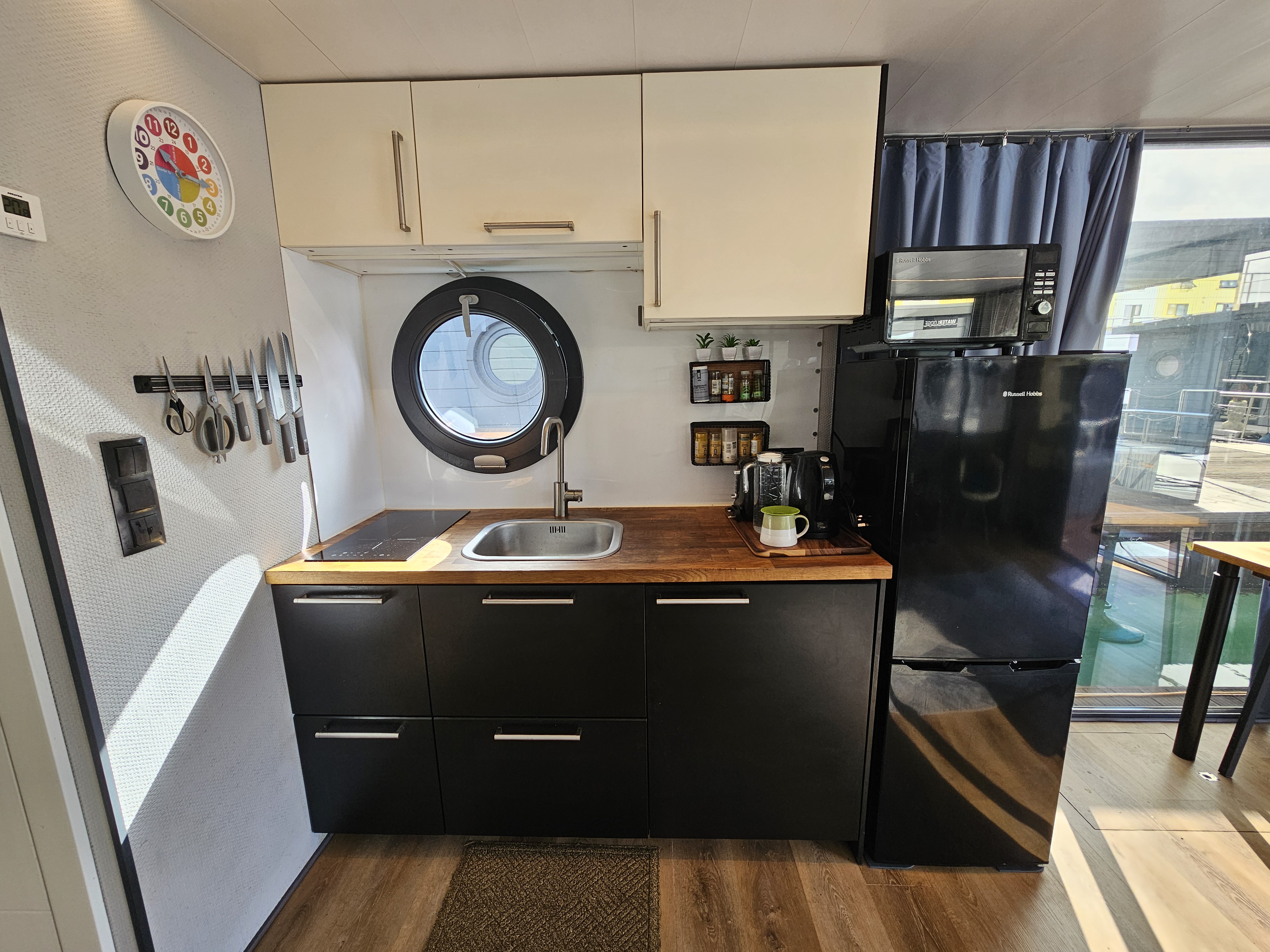 Bespoke kitchen with IKEA black-and-white units, oak worktop, induction hob, and integrated fridge/freezer.