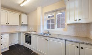 There is a bright reception room to the left, with large windows overlooking the front garden and it is a good space for a small dining area. There is also an open under-stairs nook suitable for a lounge or reading area. The kitchen is arranged in an L shape and features a mixture of base and wall units, with an integrated hob, oven and washing machine, plus space for a fridge.