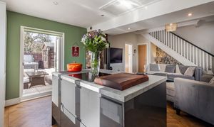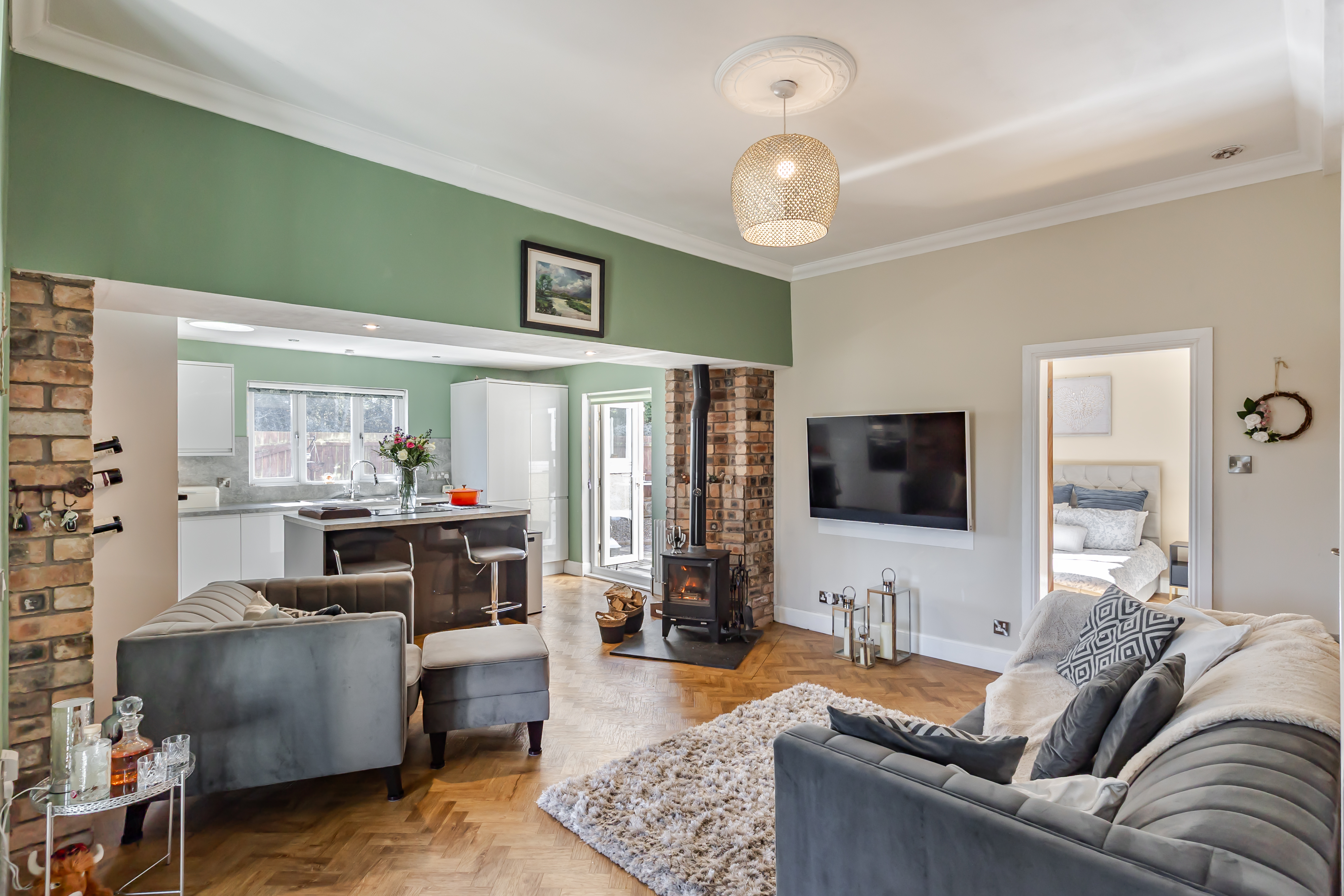 The open-plan Kitchen Lounge area is undoubtedly the heart of the home, a true masterpiece designed for both comfort and entertaining. The sleek wooden flooring and neutral décor are enhanced by a striking brick-effect feature wall, creating a space that's both stylish and inviting. With plenty of room for multiple sofas and free-standing furniture, this area offers versatility for all types of gatherings. A fully functional log burner adds to the charm, providing a homely and relaxing touch. The kitchen itself is a chef’s dream, featuring expansive white cabinetry, excellent storage solutions, and a range of integrated appliances, including a fridge/freezer, microwave, and dishwasher. A standout feature of the kitchen is the dark island which contrasts beautifully with the lighter tones of the kitchen, creating a pleasing visual focal point. French doors lead to the garden, flooding the space with natural light and offering picturesque views of the outdoor area.