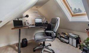 The second bedroom has been thoughtfully upgraded and offers fantastic potential as a second double bedroom, home office, or dressing room. Fresh carpets and neutral tones further enhance the space, while the large windows and skylight fill the room with natural light and offer scenic views.