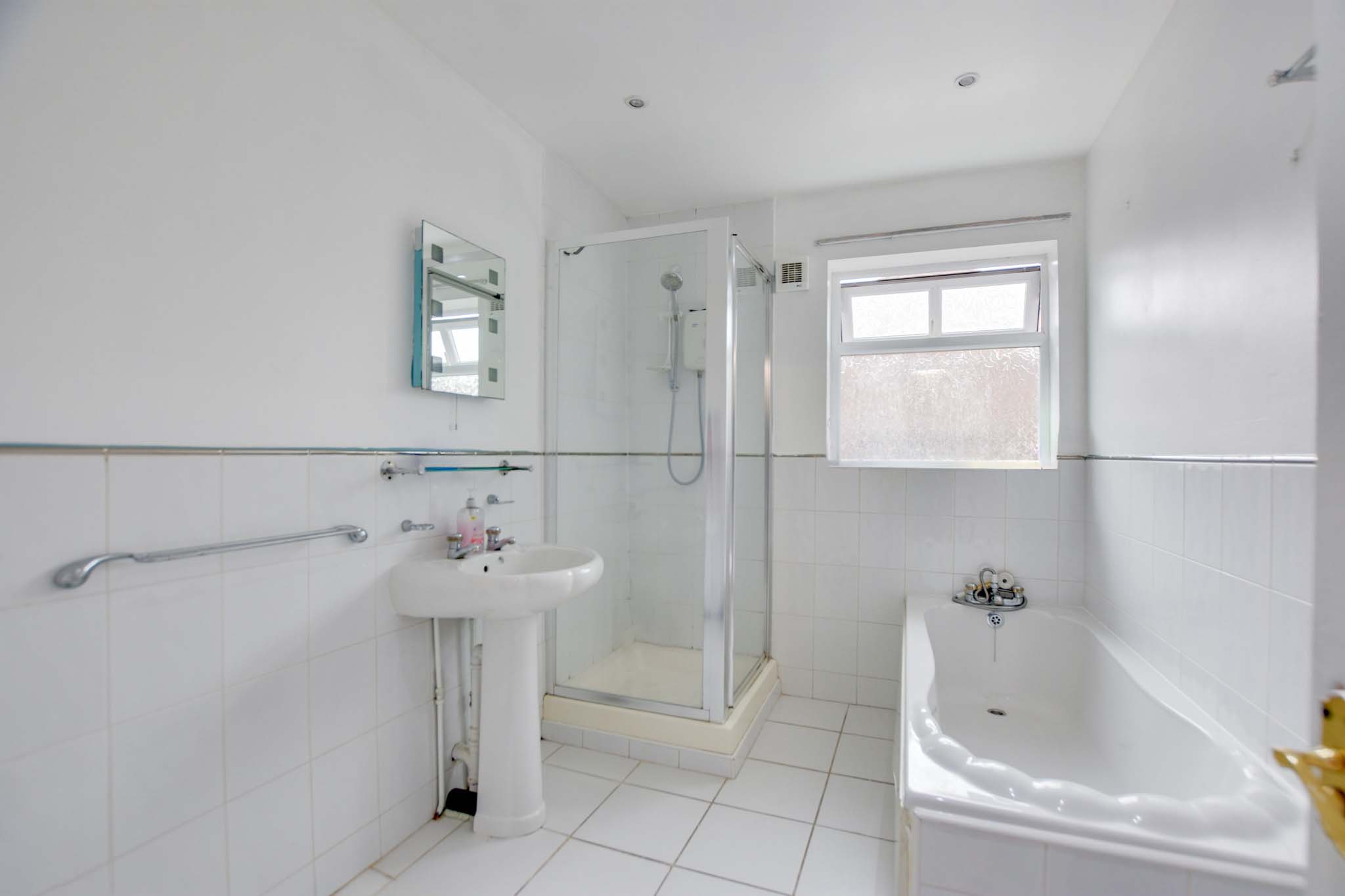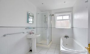 Double-glazed window to side elevation, bath with mixer tap/shower attachment, separate shower cubicle, low-level WC, wash hand basin, partly tiled walls, tiled flooring and a heated chrome towel rail.