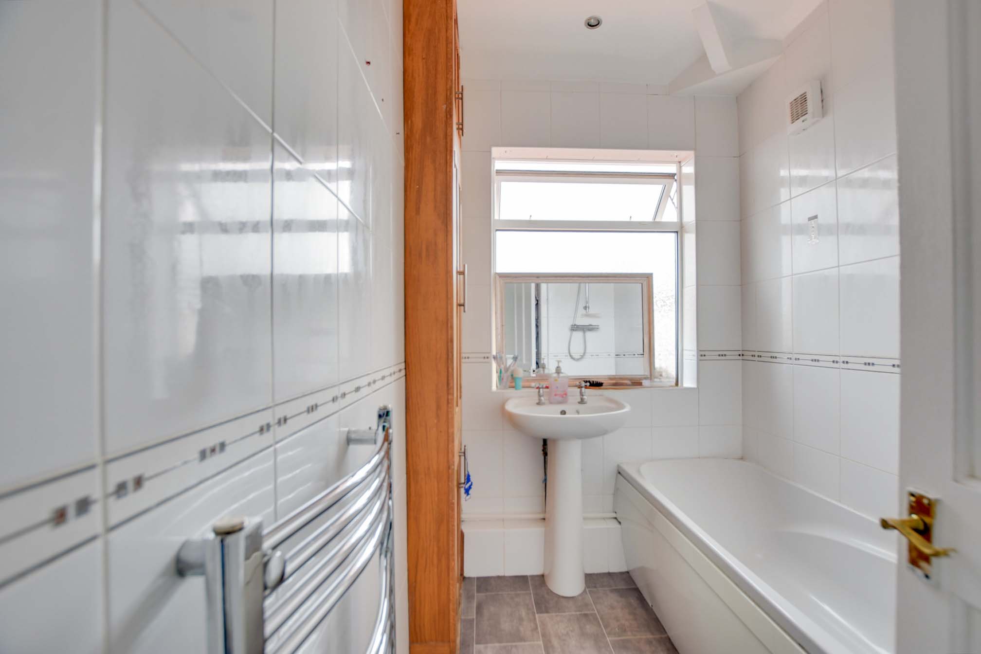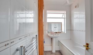 Double-glazed window to rear elevation, bath with shower over, low-level WC, wash hand basin, built-in cupboard, partly tiled walls, tiled flooring and a heated chrome towel rail.
