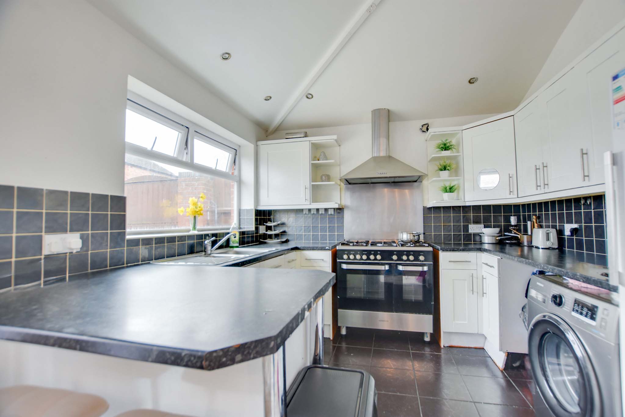 Double-glazed window to the rear elevation, inset ceiling spotlights, stainless steel sink and drainer unit, wall and base units with work surfaces, breakfast bar, gas cooker point with extractor hood, plumbing for dishwasher and washing machine, space for fridge freezer, partly tiled walls and tiled flooring.