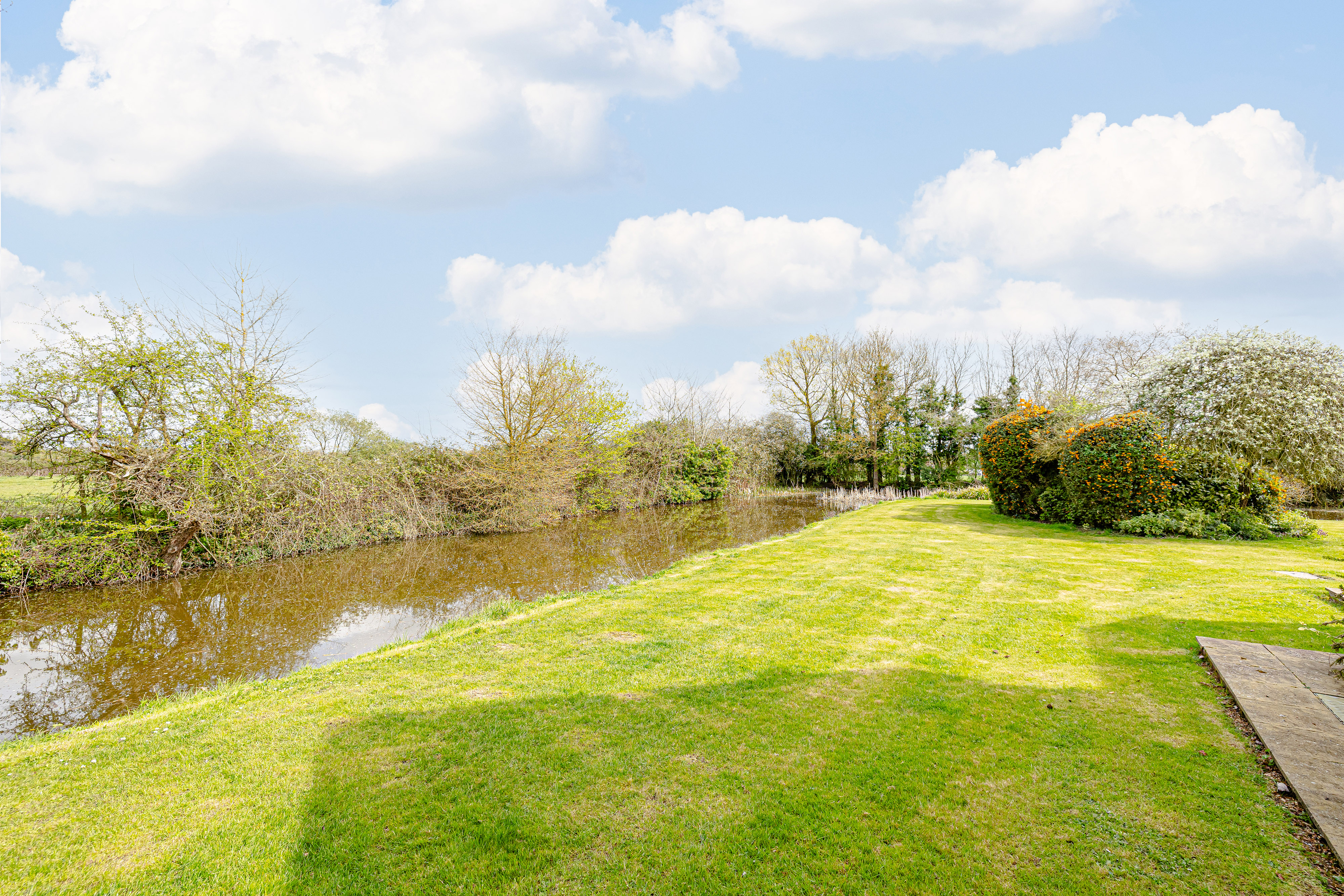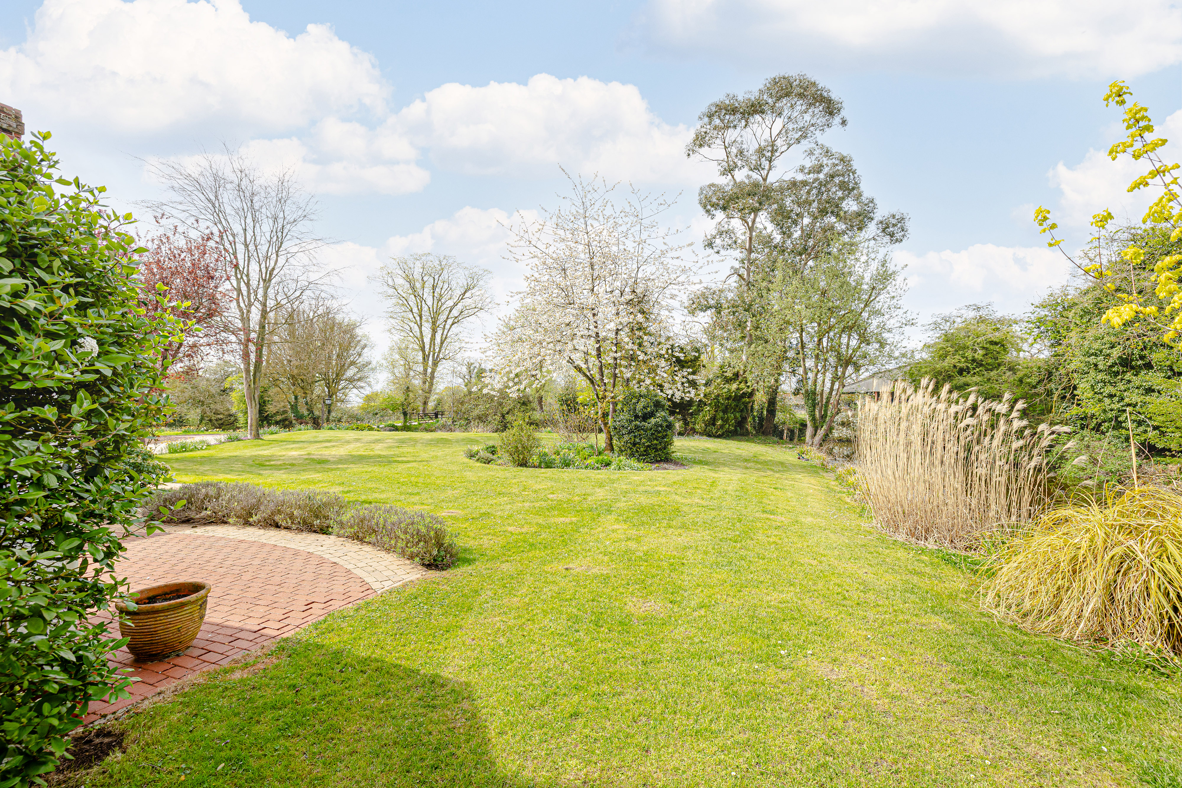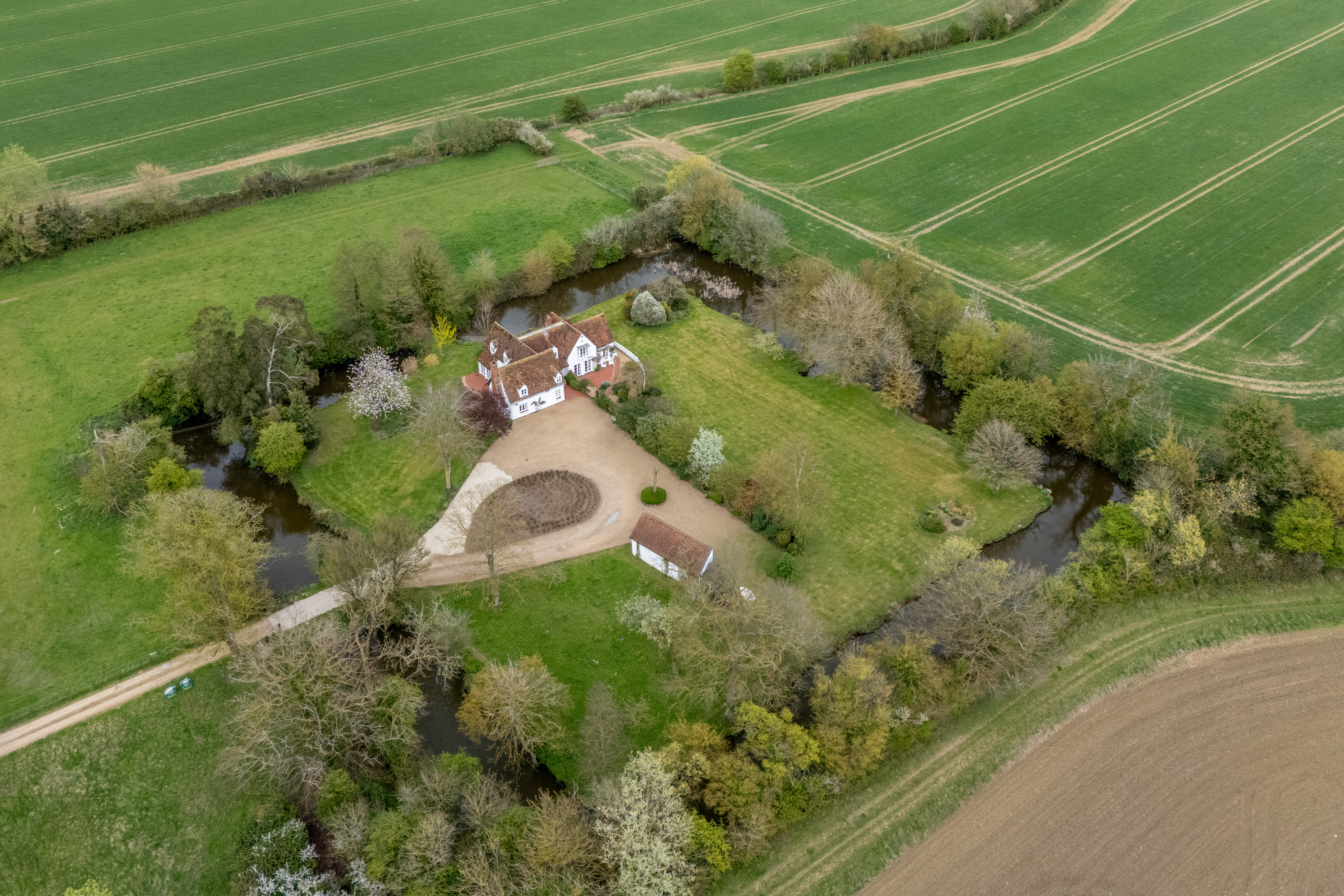 Approached via a sweeping gravel driveway and set beautifully within its moated grounds, the house immediately creates a lasting impression. The surrounding landscape is both dramatic and peaceful, with broad lawns, mature trees, established planting and far-reaching countryside views combining to give the property an extraordinary sense of privacy and beauty. The moat frames the house in unforgettable fashion, elevating the setting into something rarely found and impossible to recreate.