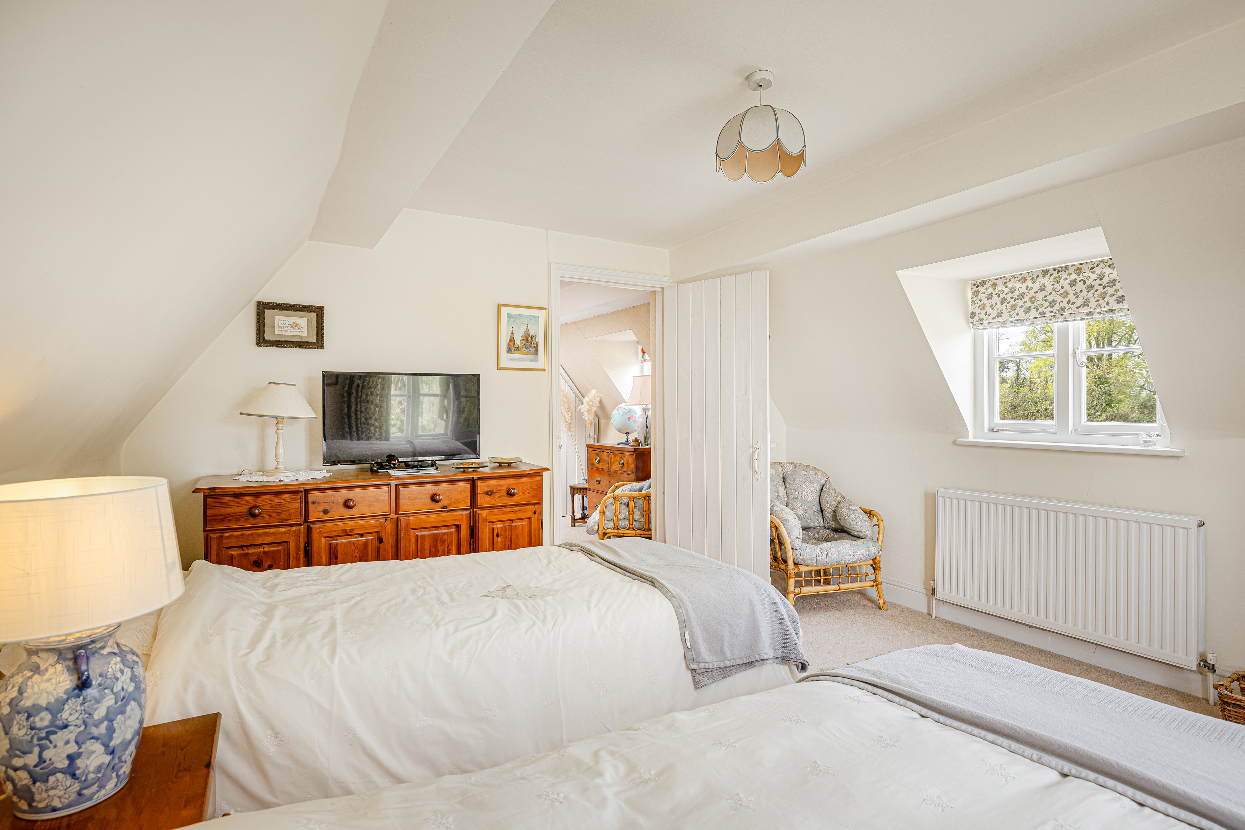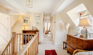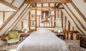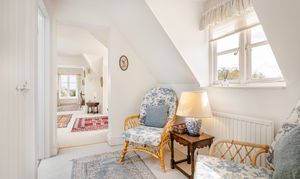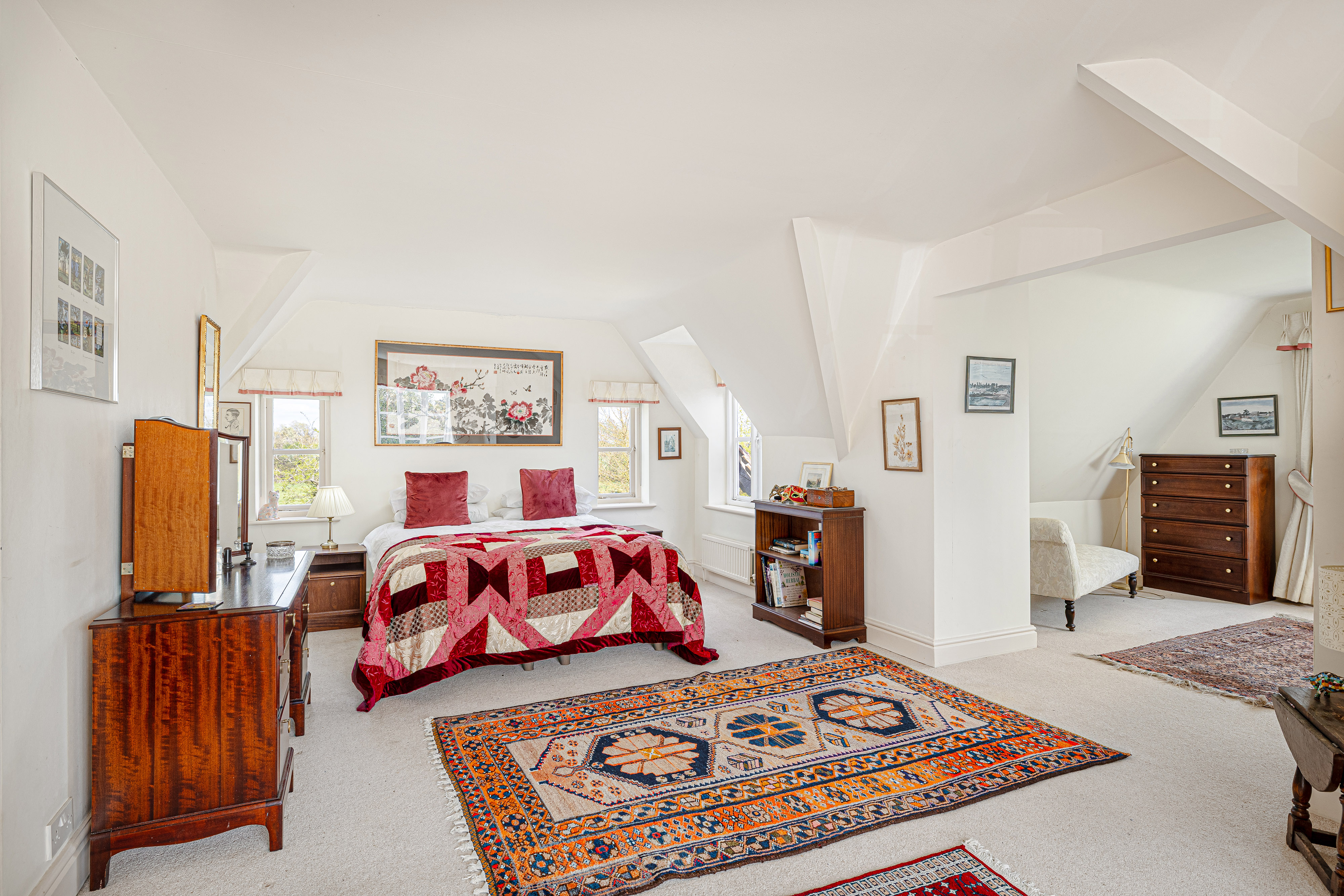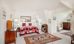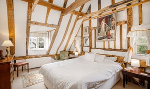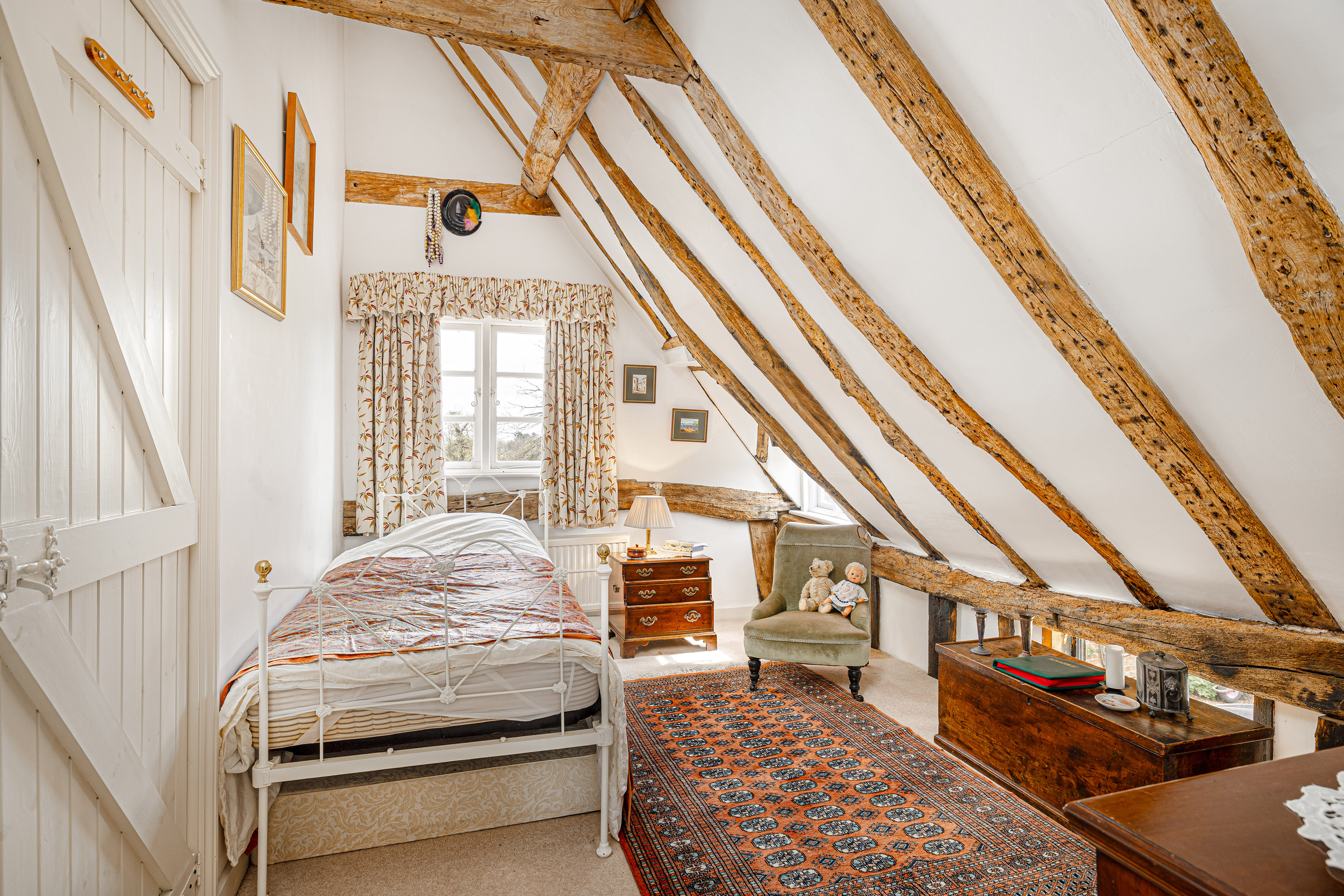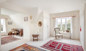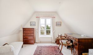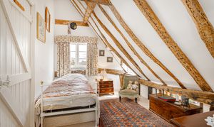 Upstairs, the bedroom accommodation is full of charm and individuality. The principal bedroom suite is particularly impressive, with a large bedroom leading through to an extensive dressing room and a spacious en suite bathroom, creating a private and luxurious retreat. Of the remaining bedrooms, one is especially notable for its exposed timber framing, which gives the room remarkable character and a strong sense of the house’s heritage. A further double bedroom and an additional generous bedroom, currently arranged in two sections, provide flexible accommodation for family and guests, all served by a family bathroom.