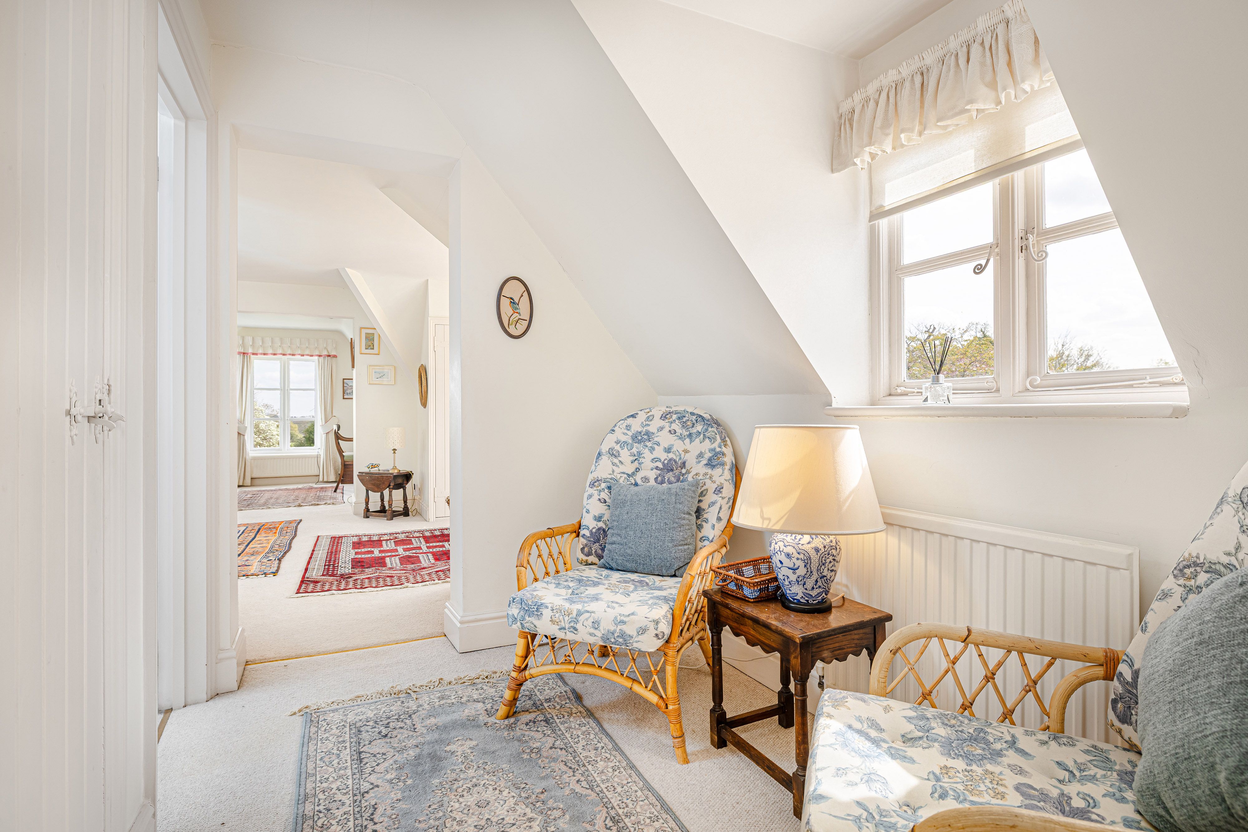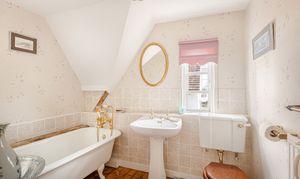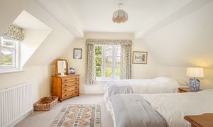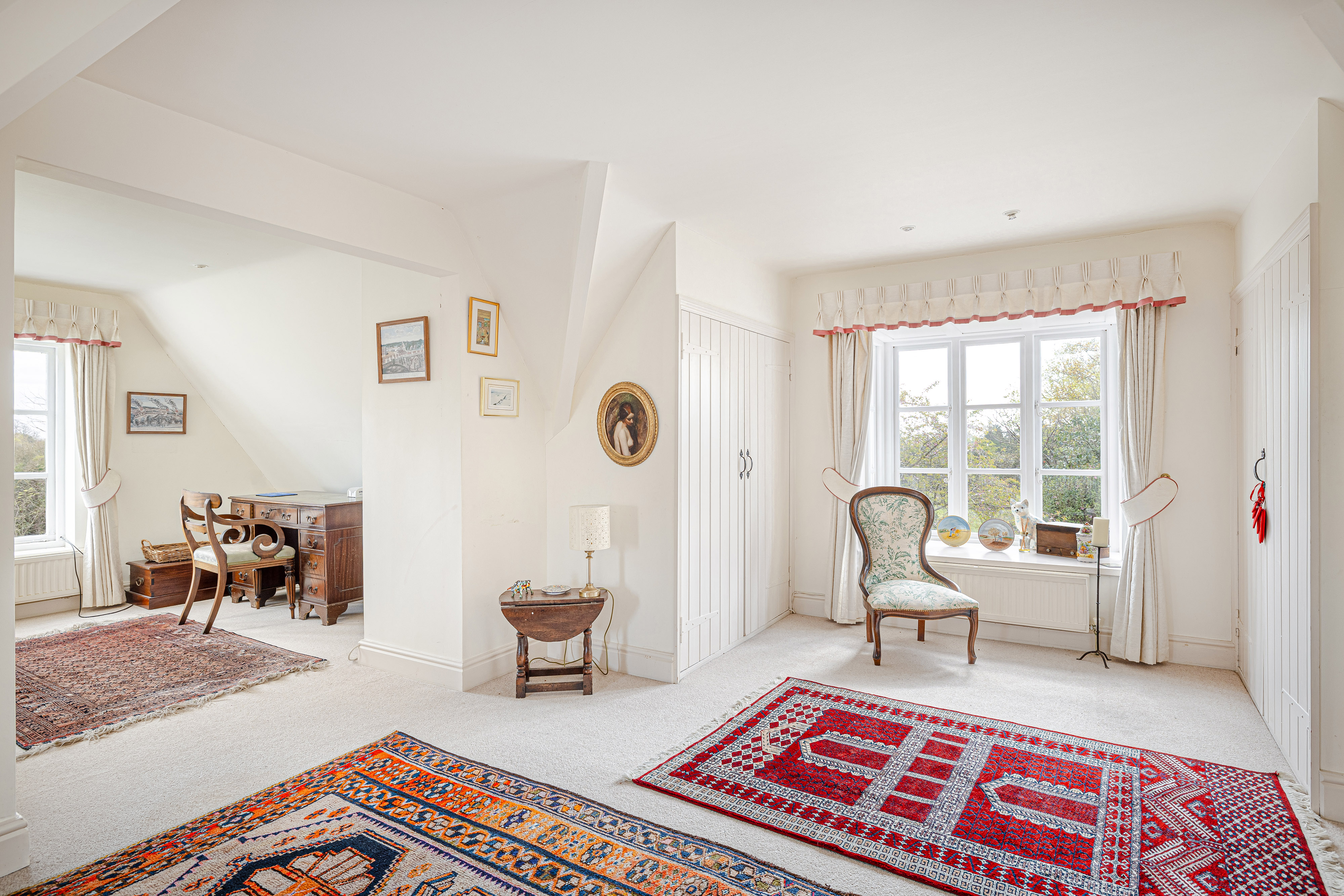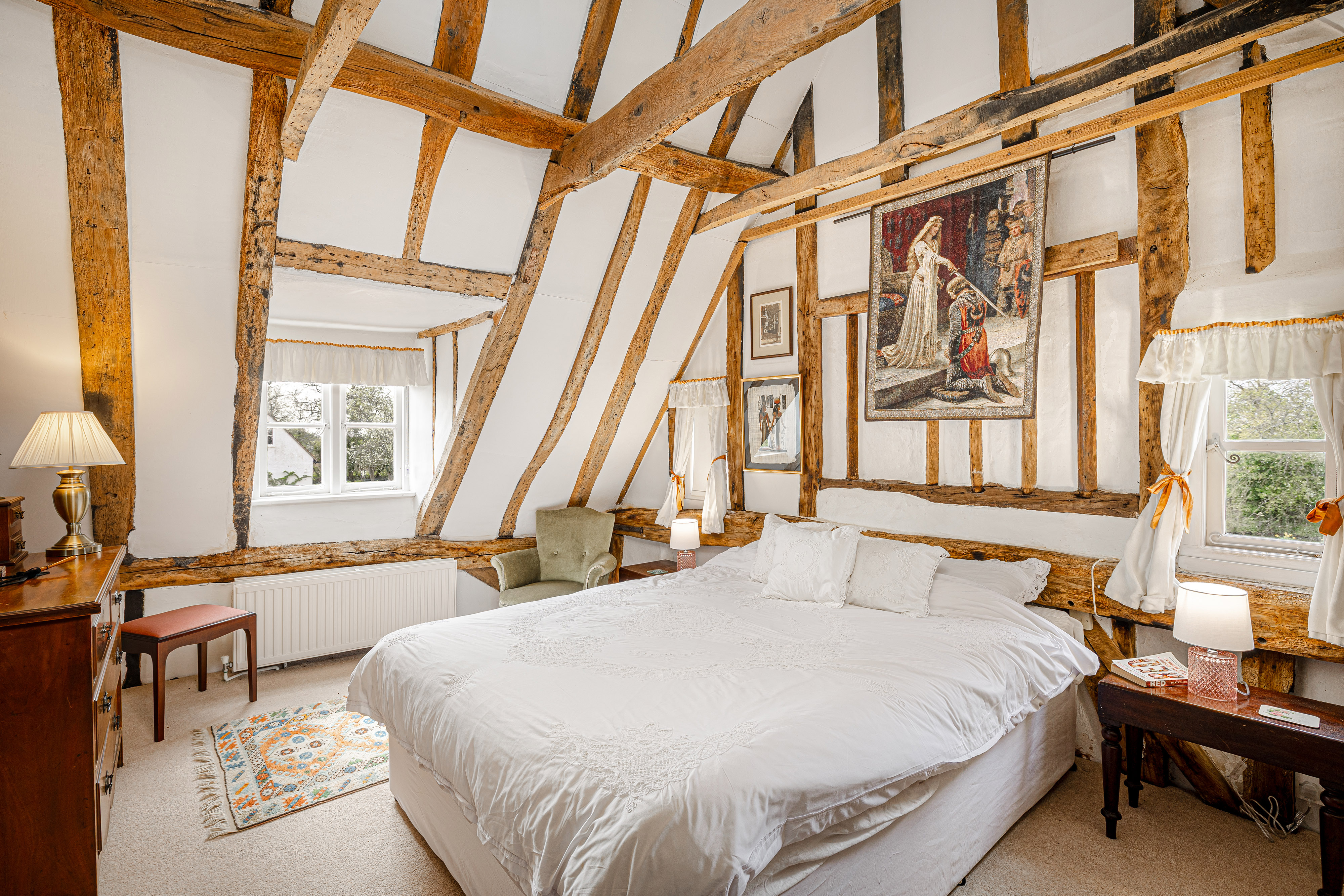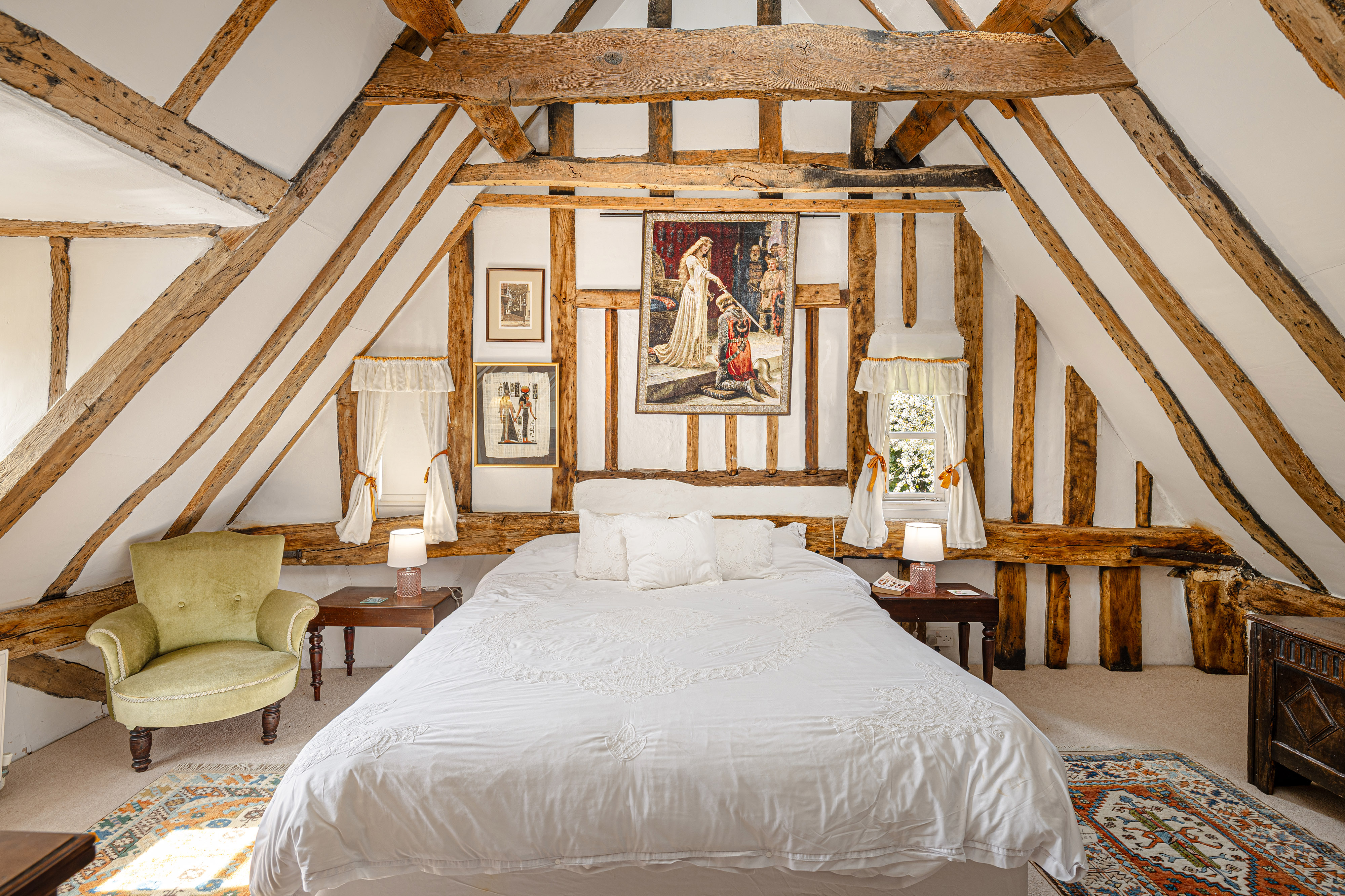 Upstairs, the bedroom accommodation is full of charm and individuality. The principal bedroom suite is particularly impressive, with a large bedroom leading through to an extensive dressing room and a spacious en suite bathroom, creating a private and luxurious retreat. Of the remaining bedrooms, one is especially notable for its exposed timber framing, which gives the room remarkable character and a strong sense of the house’s heritage. A further double bedroom and an additional generous bedroom, currently arranged in two sections, provide flexible accommodation for family and guests, all served by a family bathroom.