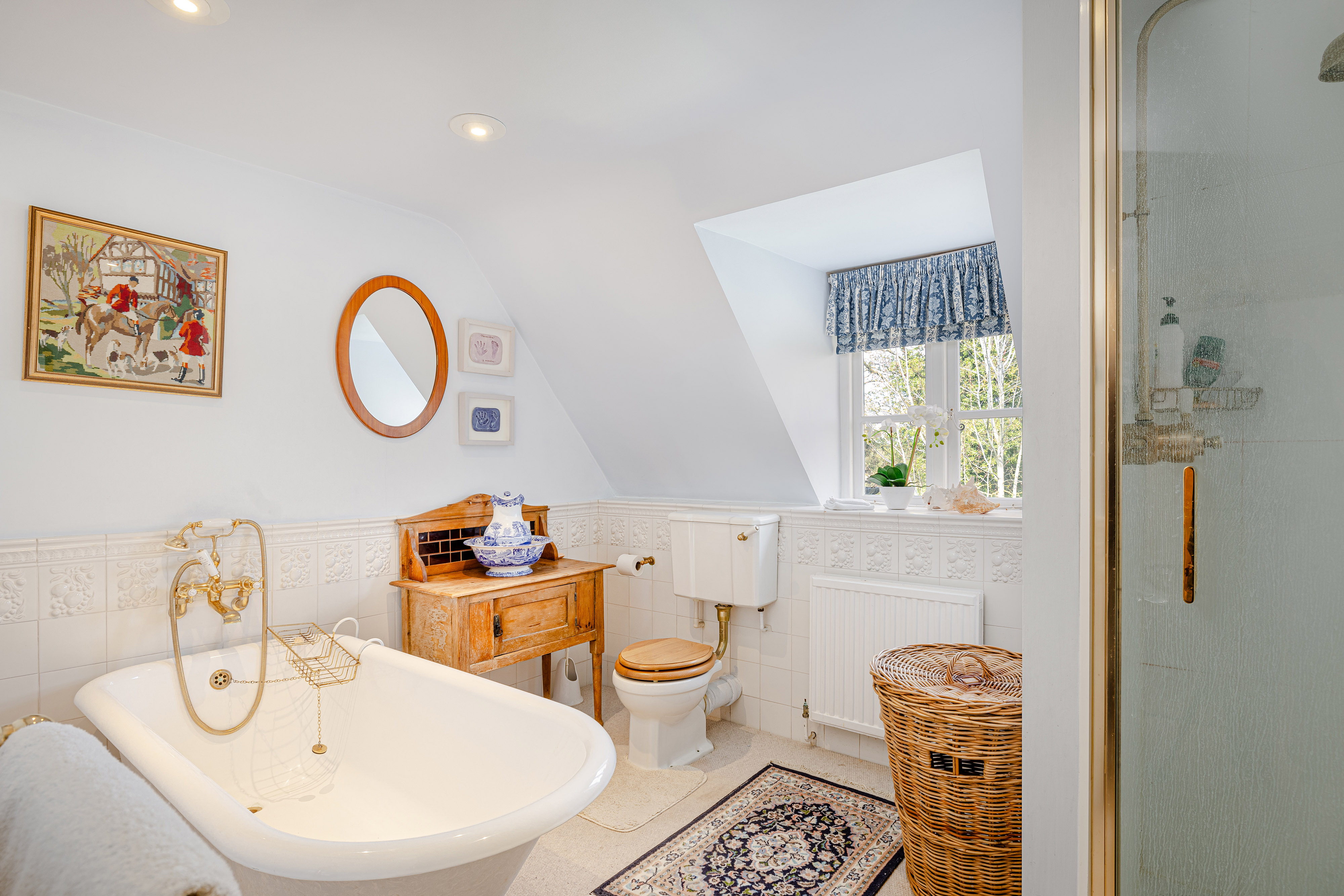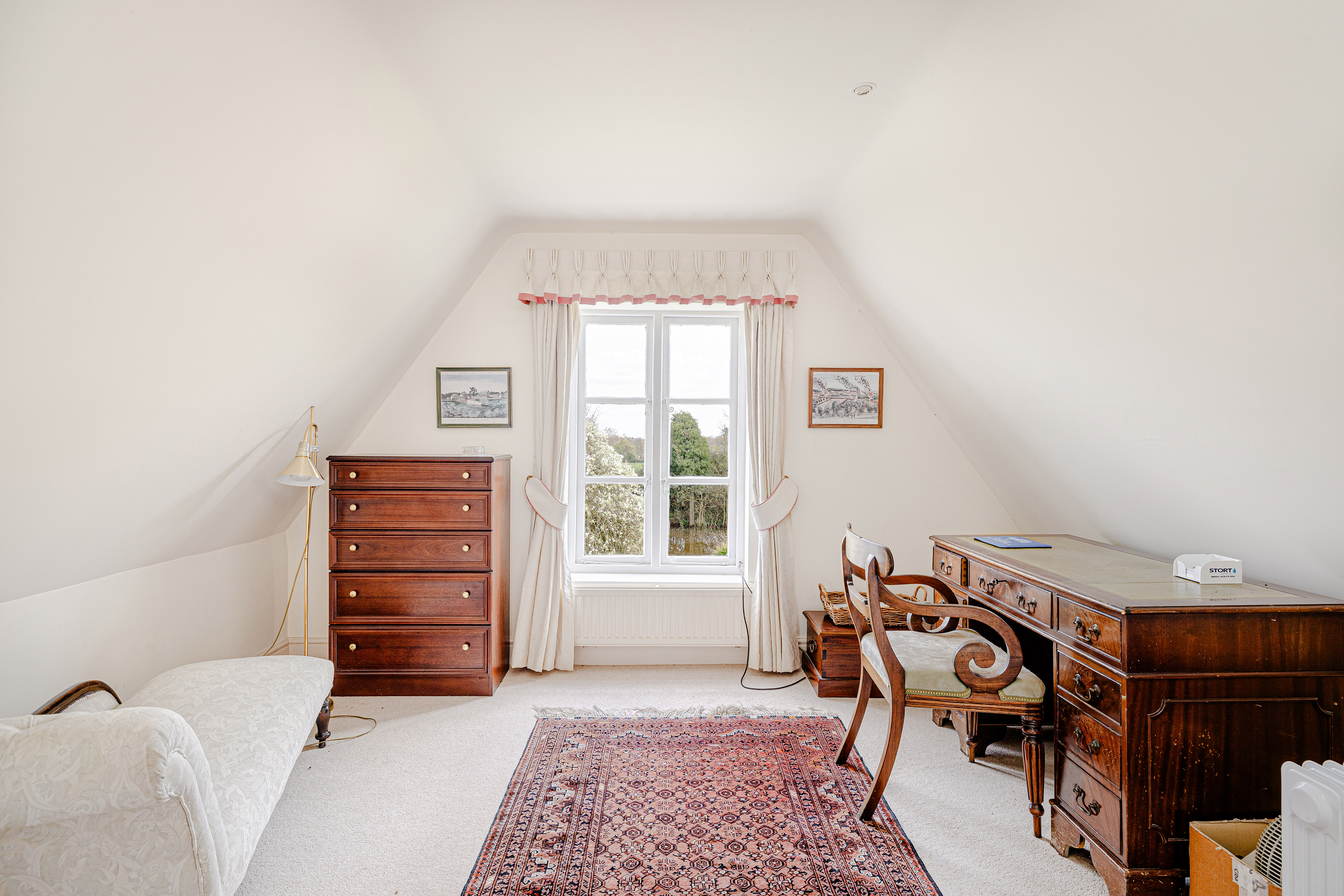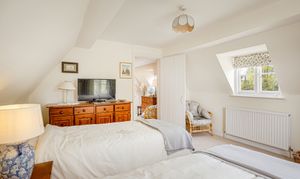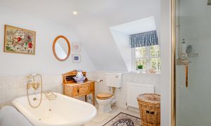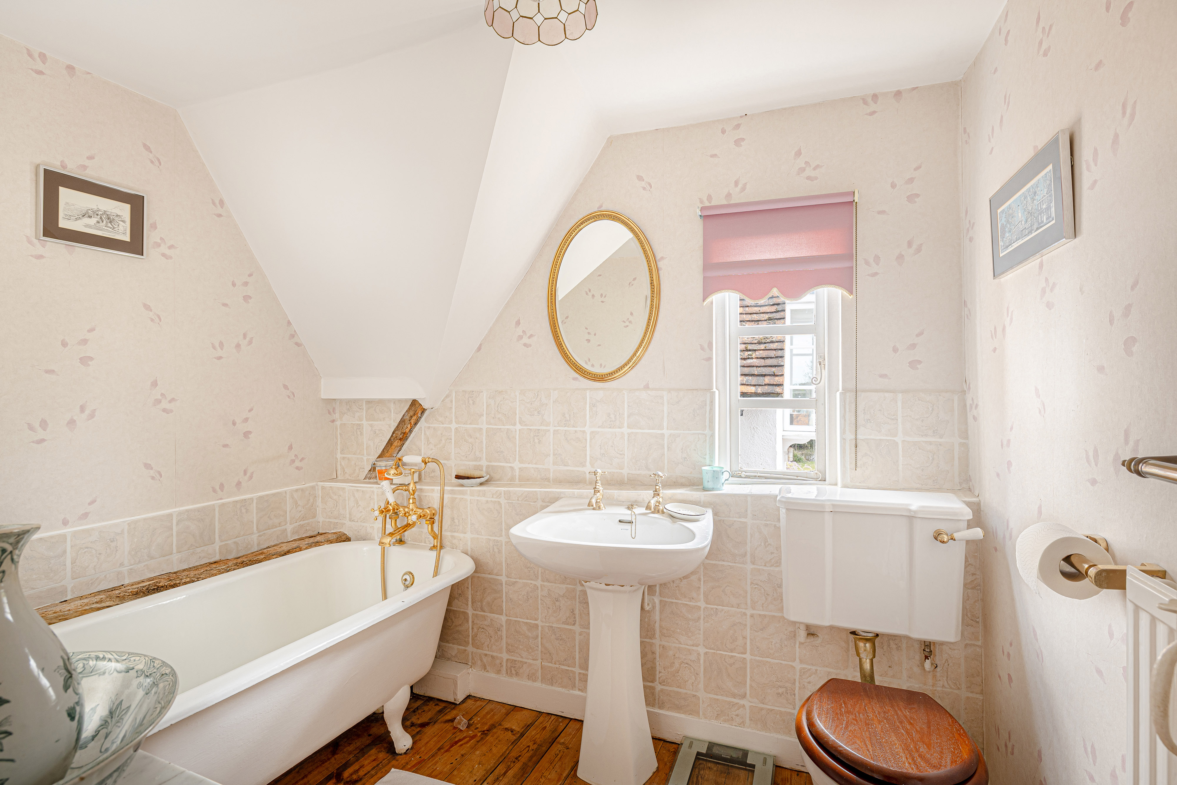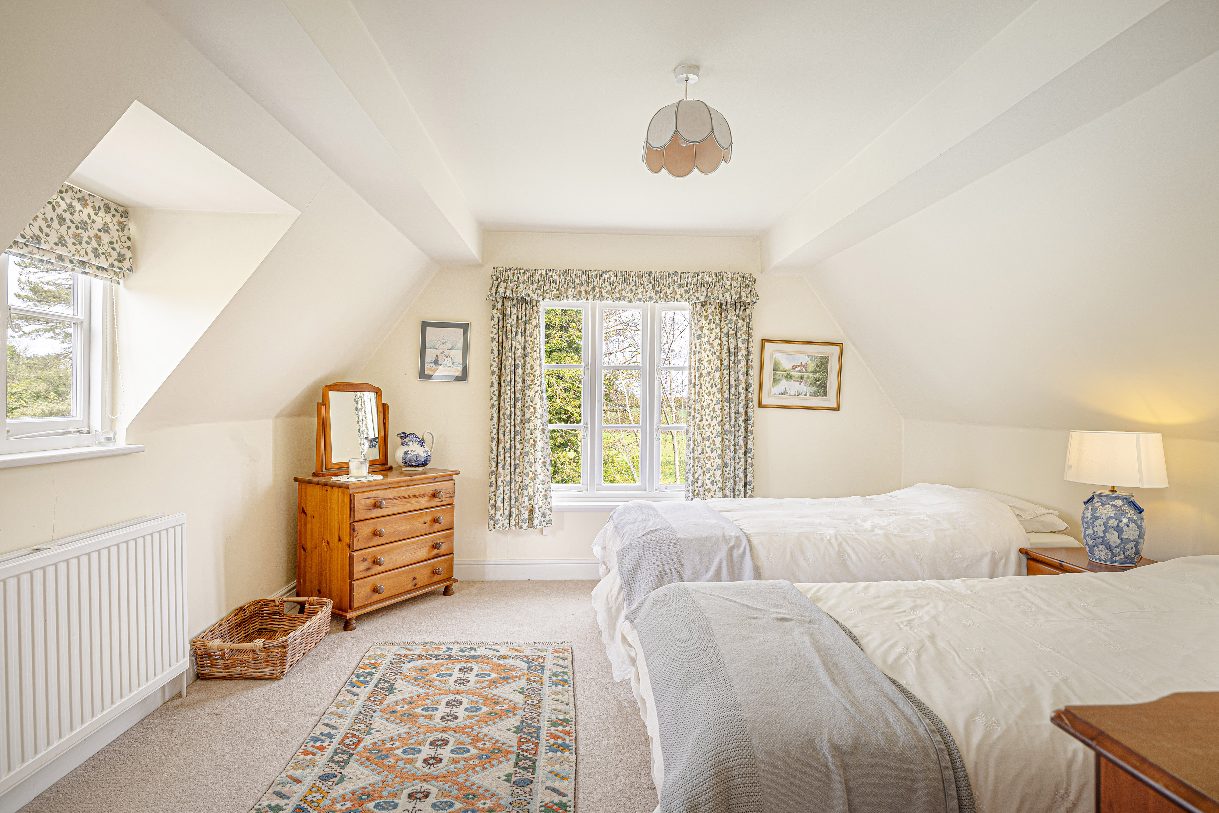 Upstairs, the bedroom accommodation is full of charm and individuality. The principal bedroom suite is particularly impressive, with a large bedroom leading through to an extensive dressing room and a spacious en suite bathroom, creating a private and luxurious retreat. Of the remaining bedrooms, one is especially notable for its exposed timber framing, which gives the room remarkable character and a strong sense of the house’s heritage. A further double bedroom and an additional generous bedroom, currently arranged in two sections, provide flexible accommodation for family and guests, all served by a family bathroom.