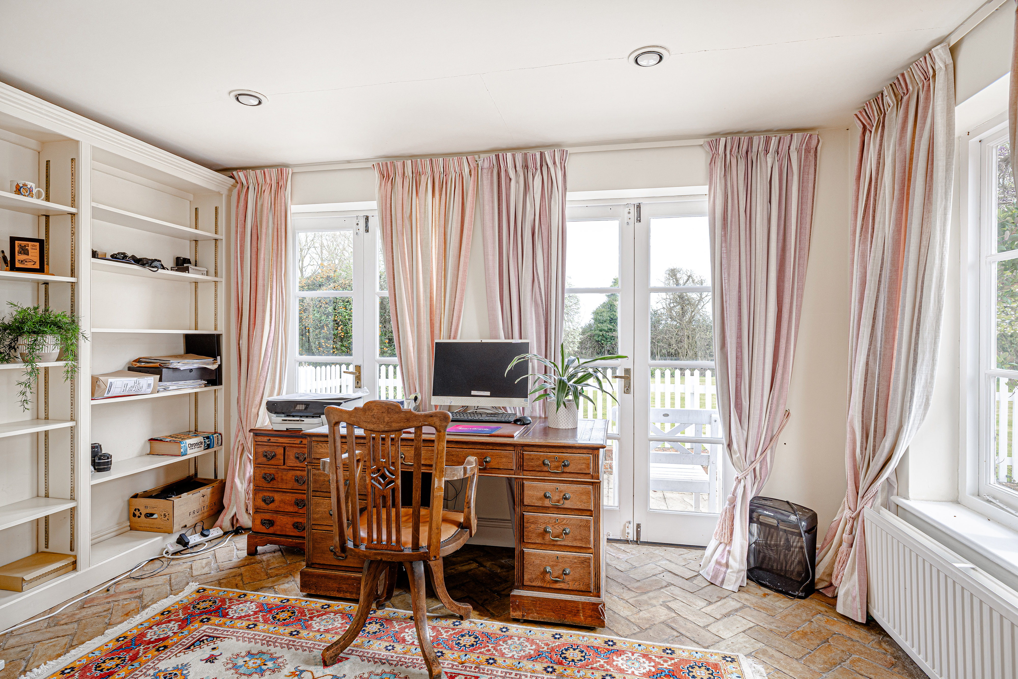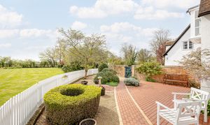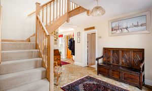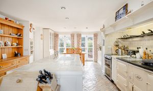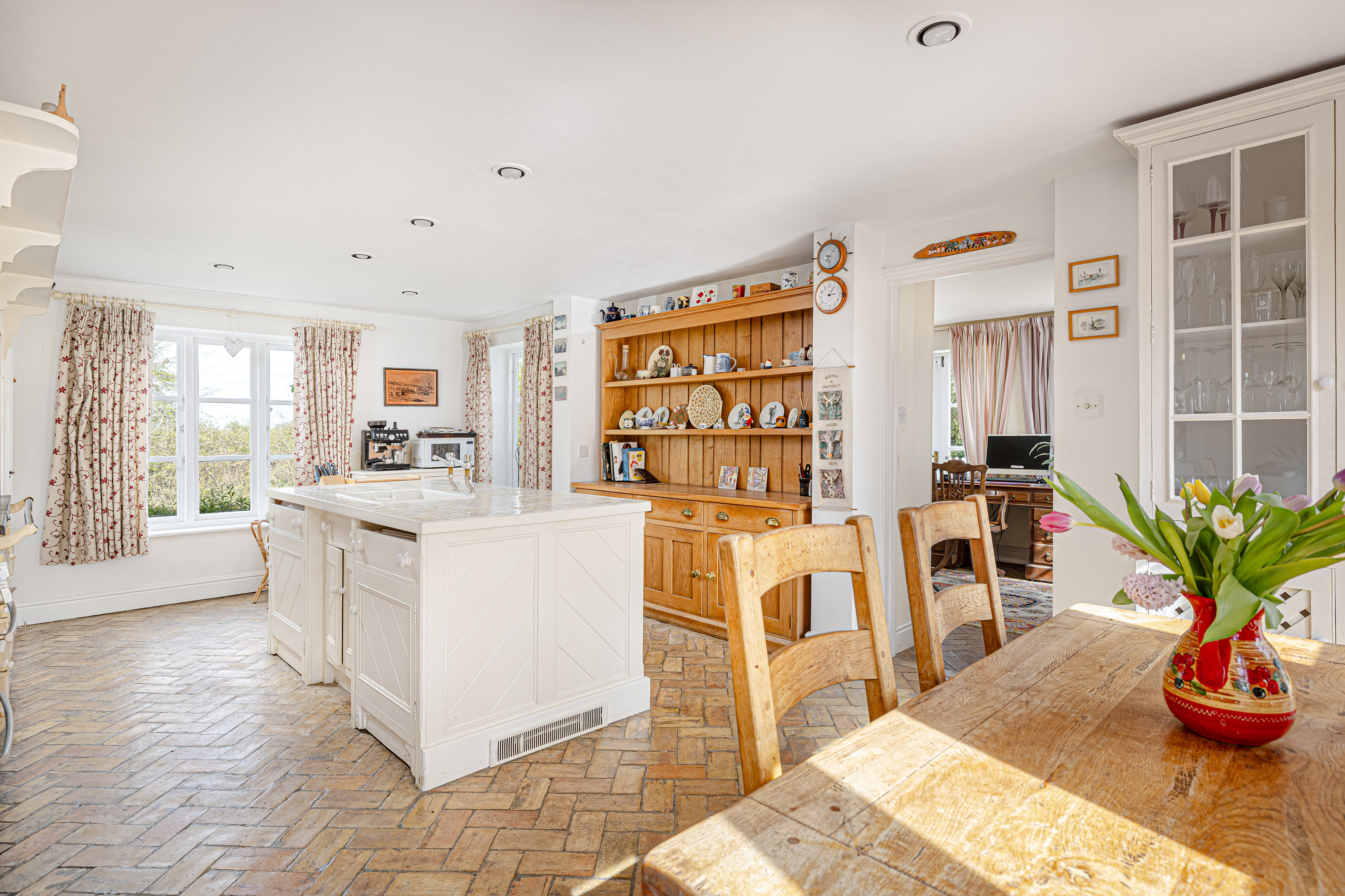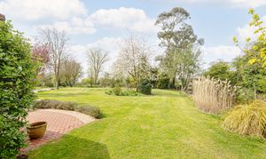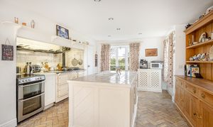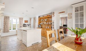 At the heart of the ground floor lies the generous kitchen/breakfast room, a wonderfully sociable space with a central island, oil-fired AGA, traditional cabinetry and ample room for informal dining. French doors and large windows draw in natural light and connect the room beautifully to the outside, while the brick flooring adds further texture and character. Adjoining the kitchen is a useful utility room and cloakroom, while the separate study provides an ideal work-from-home space, enjoying its own lovely garden outlook and doors opening outside.