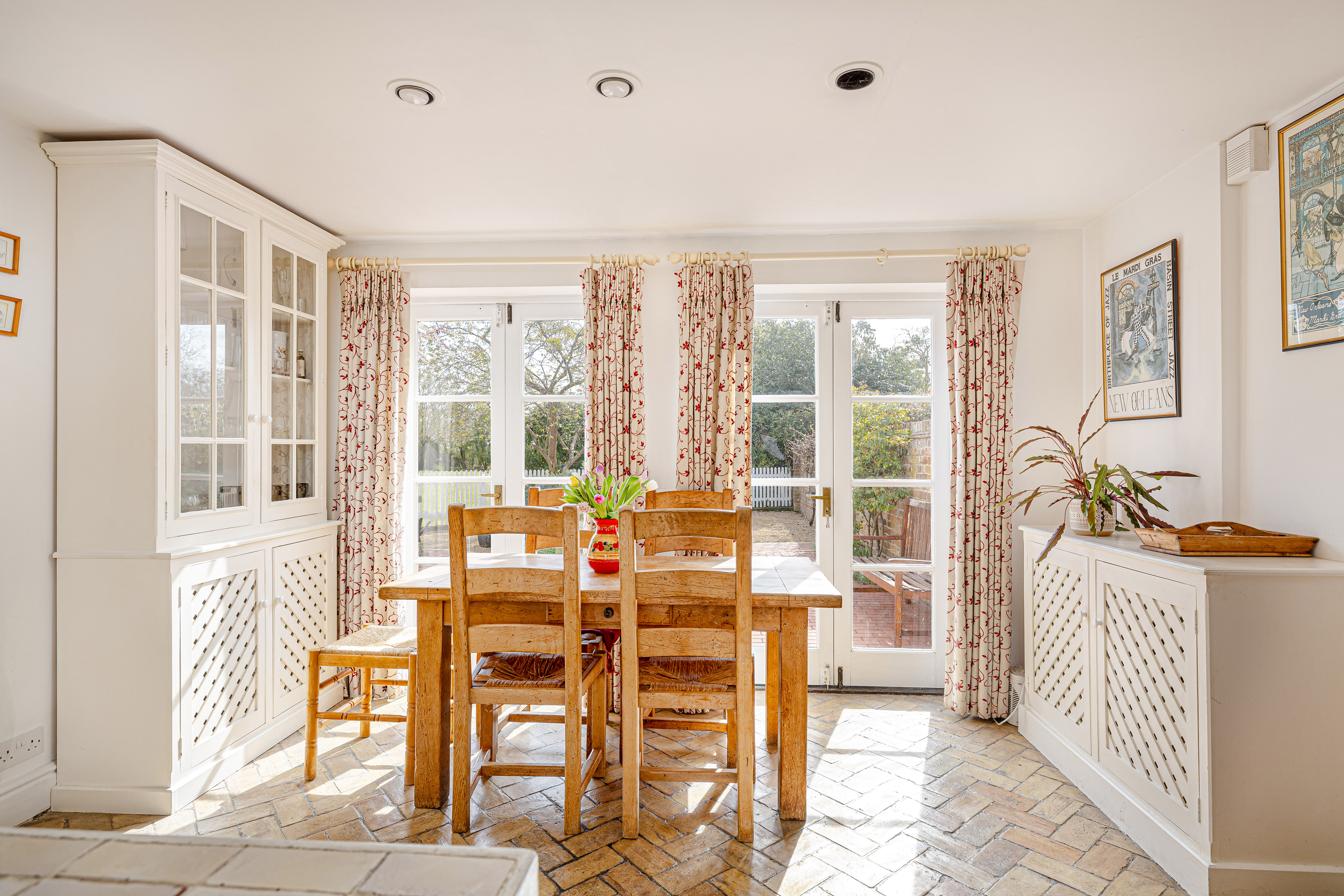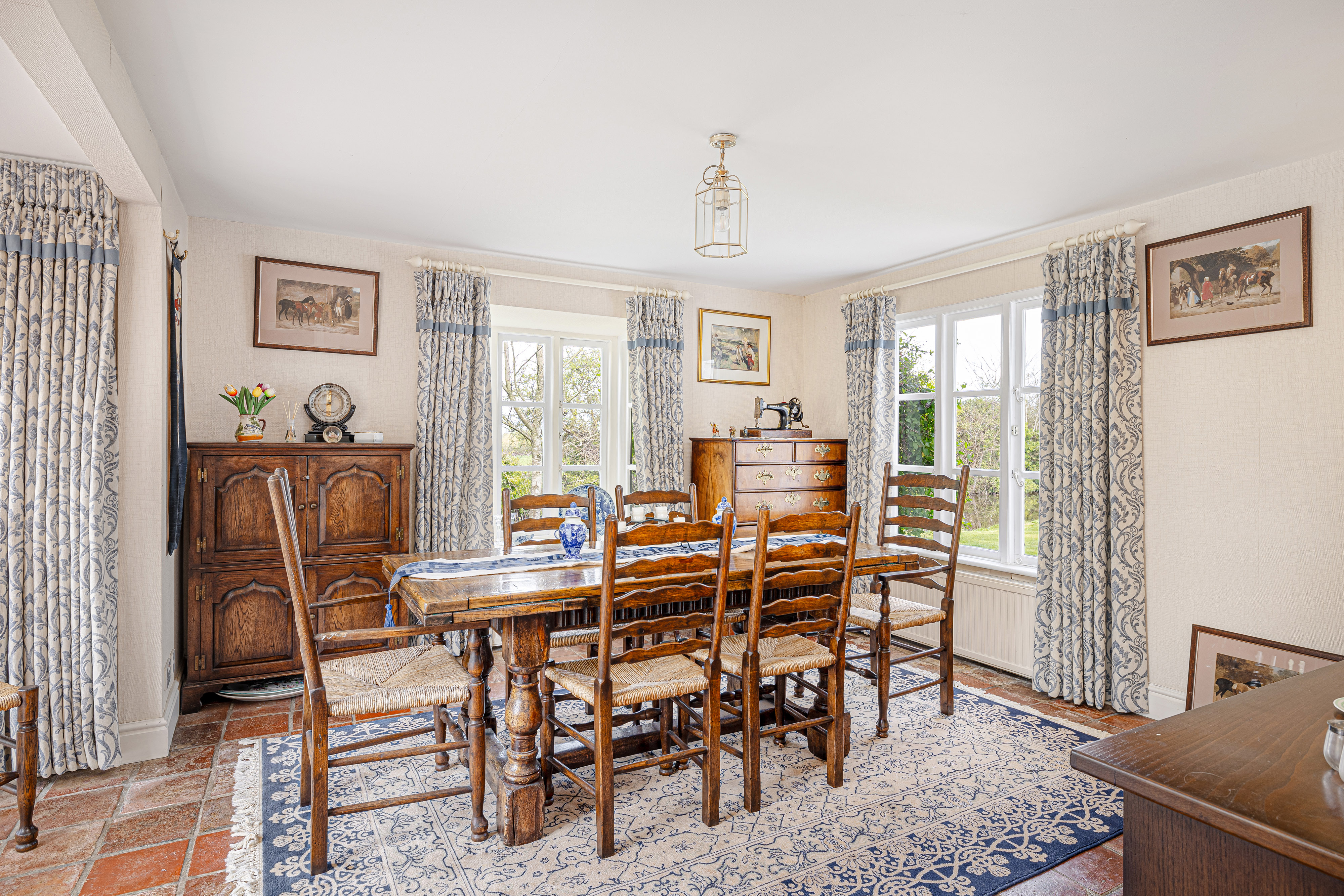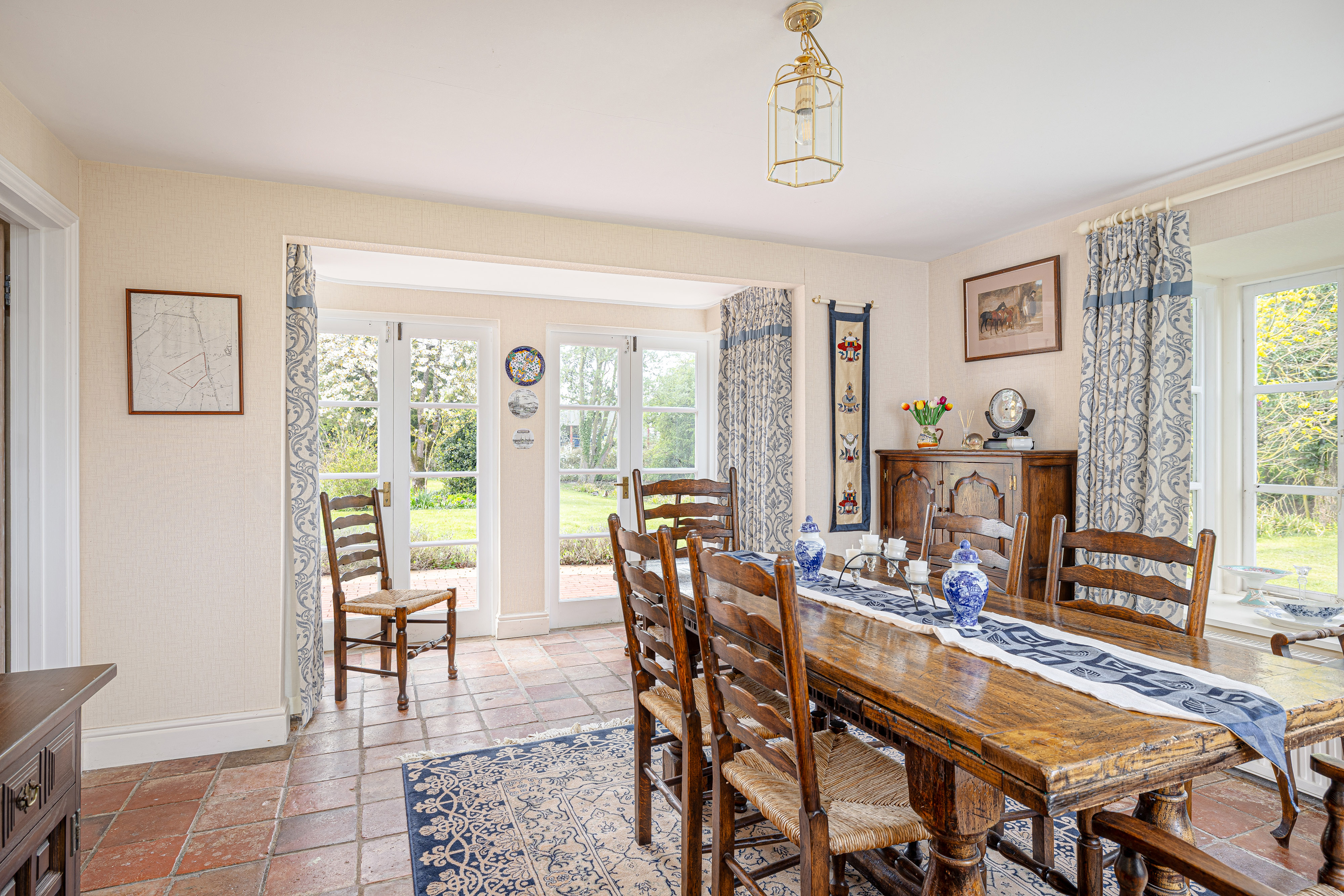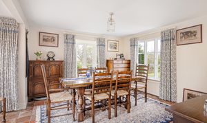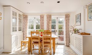 A separate dining room offers a more formal setting for hosting, with French doors opening onto the terrace and grounds beyond. Elegant yet welcoming, it is a room that would serve equally well for family occasions, entertaining or as an additional reception room, depending on a buyer’s needs. The entrance hall and inner hall provide a natural flow through the house, linking the principal rooms with ease.