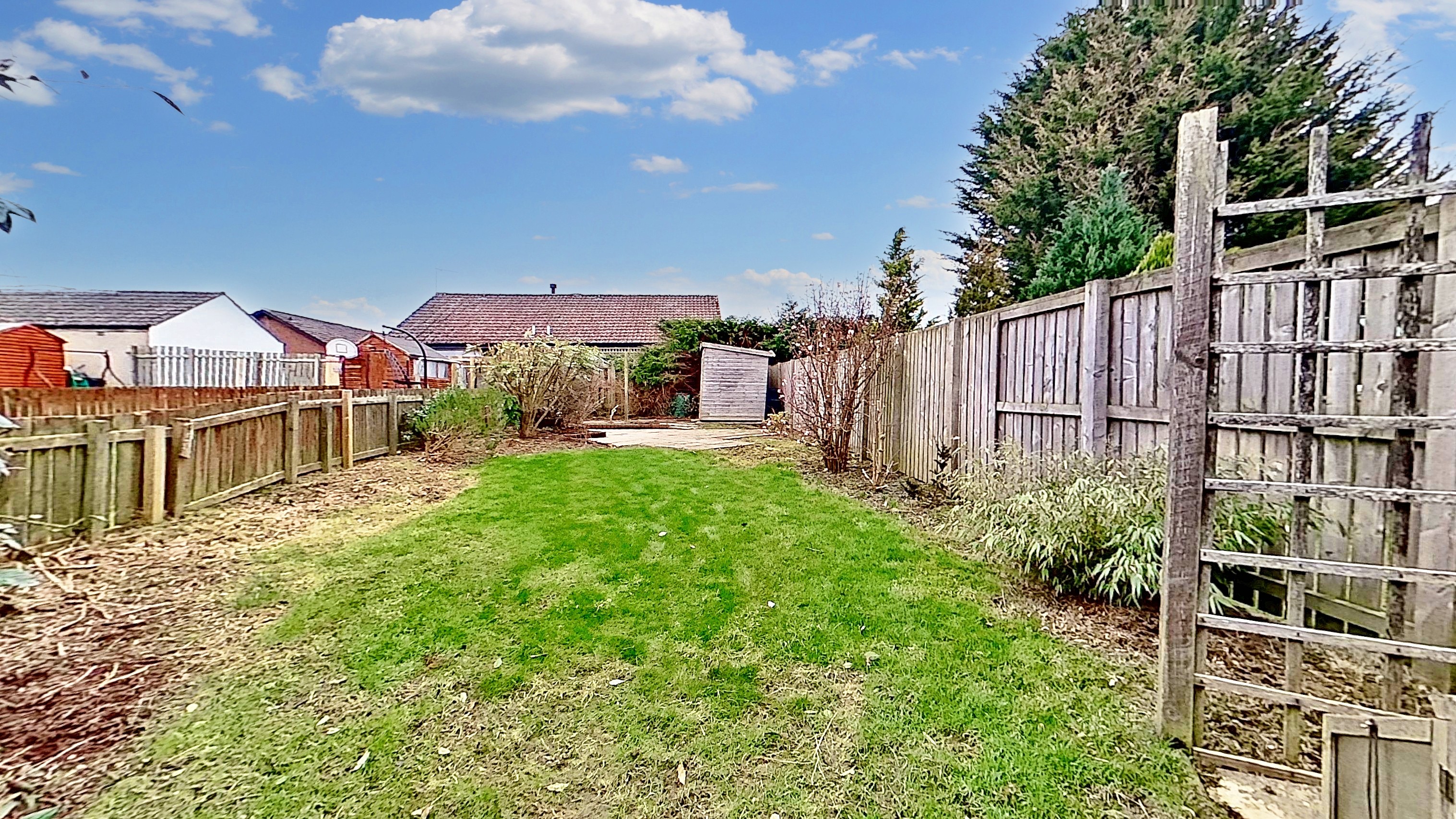 Gardens to front and rear. The rear garden is partly laid to grass, slabbed patio and shrubs. Garden hut.