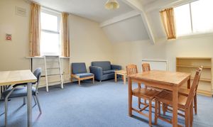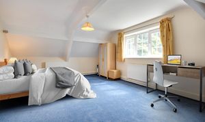 A good-sized bedroom at the top of the impressive Old Rectory building with views out across the countryside. Fully furnished with a double bed, bedside table, chest of drawers, desk, desk chair and wardrobe.