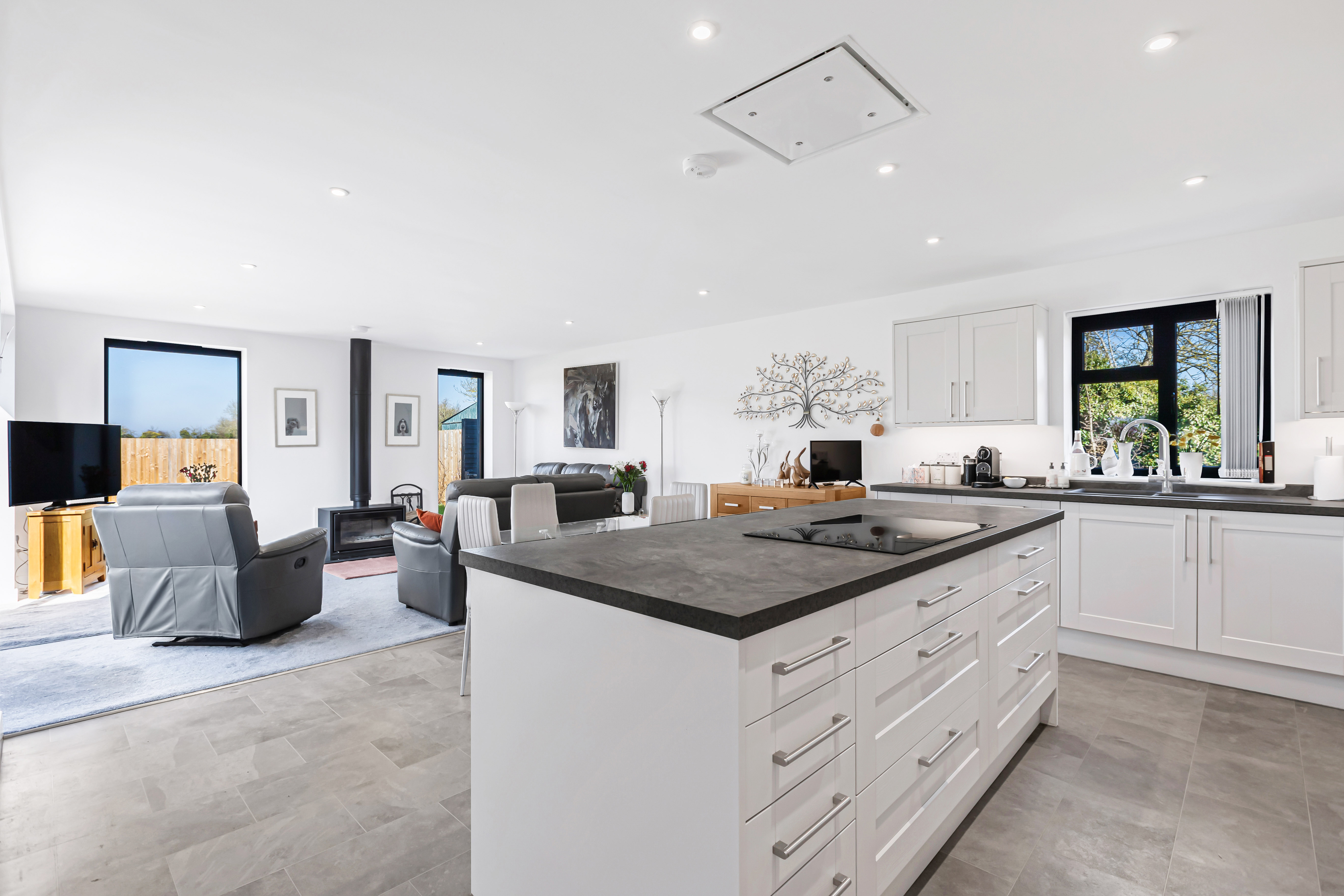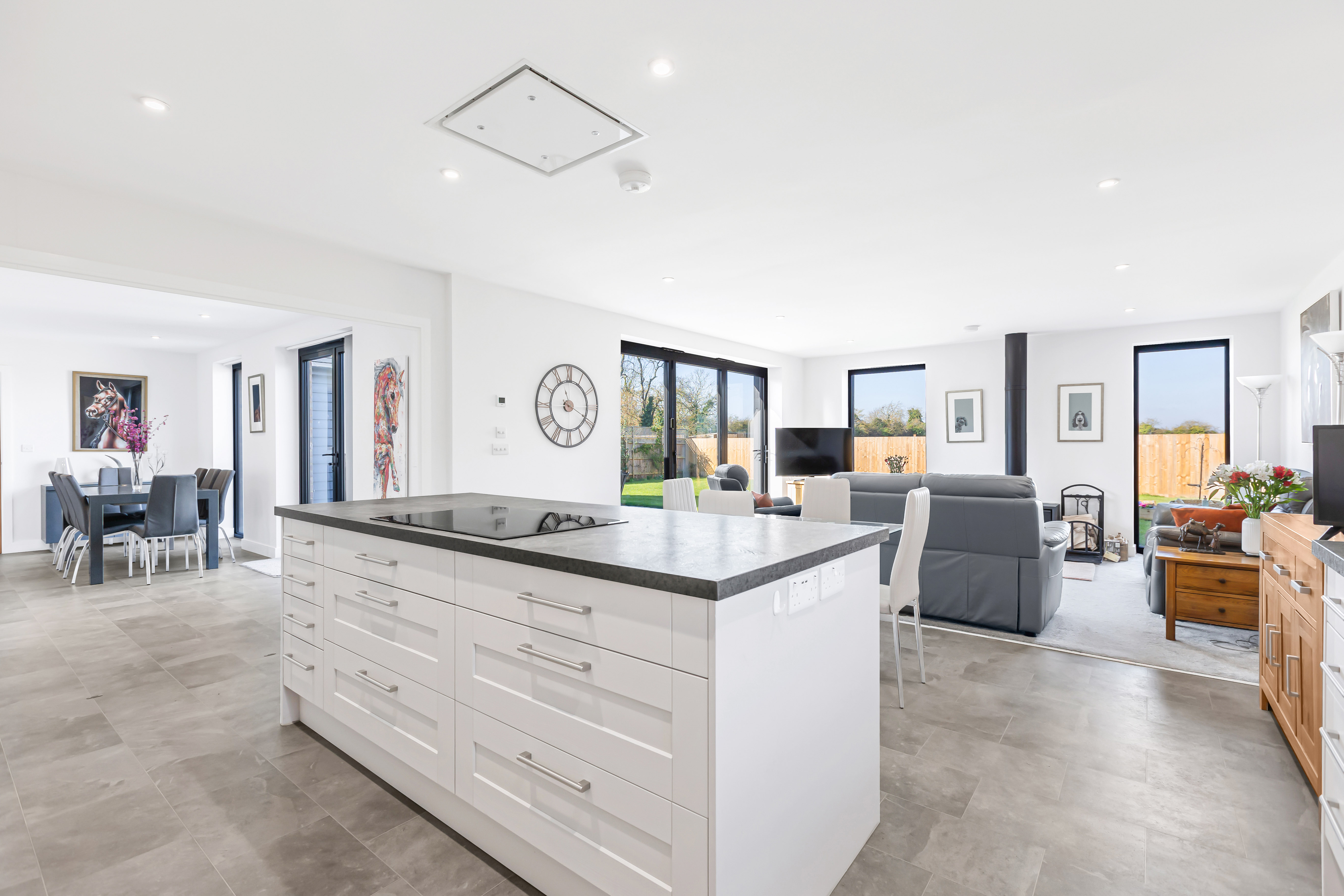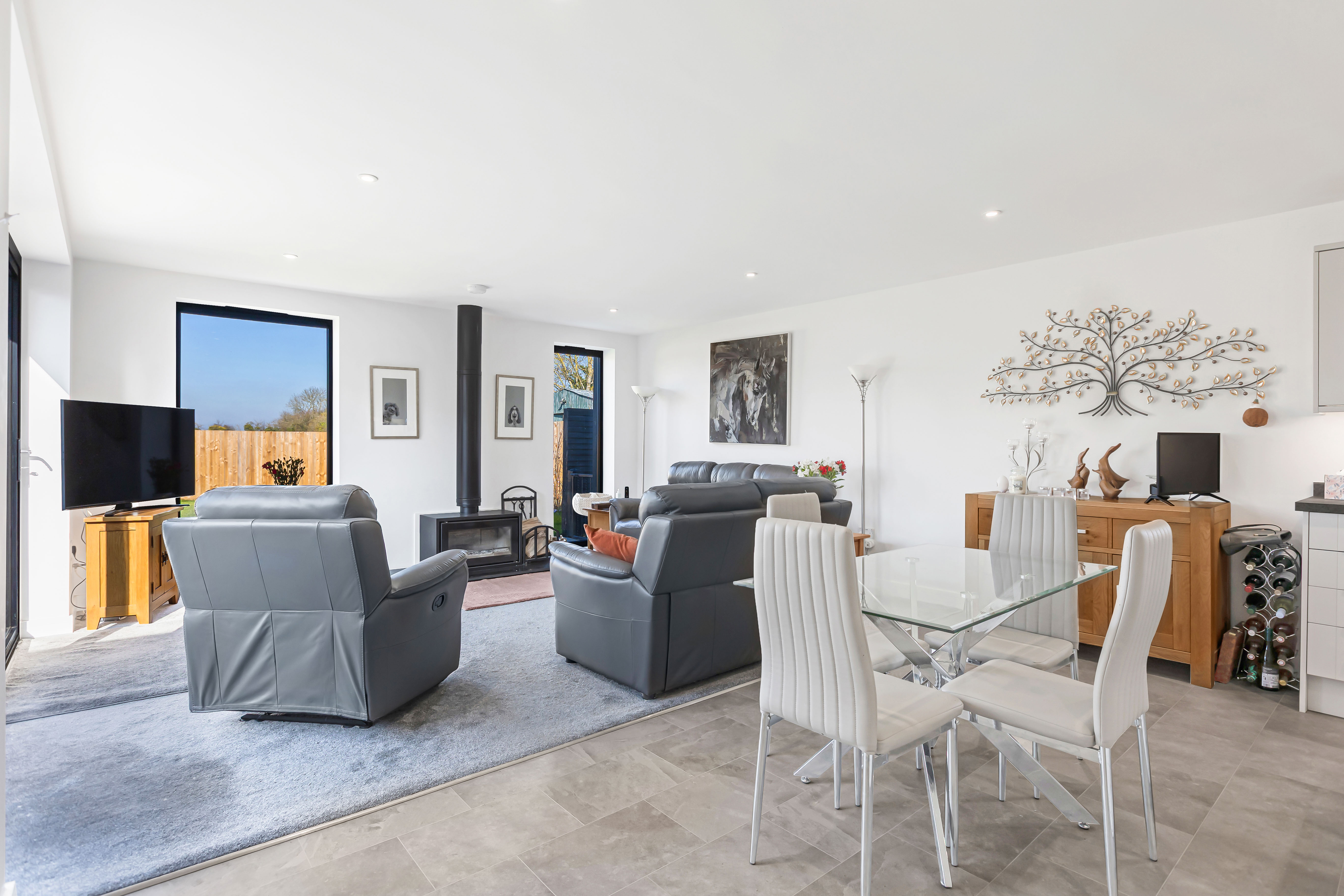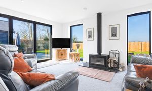 The kitchen/breakfast/living room is wonderfully open-plan, enjoying windows and bi-fold doors to a triple aspect, tiled flooring and carpet, inset lighting, a stunning garden outlook, a feature wood-burning stove, and ample space for a variety of lounge, dining and storage furniture. The kitchen area enjoys a range of modern base and wall units, composite worktops, a large island, an integrated double oven, dishwasher, hob, extractor unit, fridge/freezer, and space for other small kitchen appliances. The utility room provides further storage, access to the side of the property, and space for large laundry appliances.