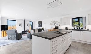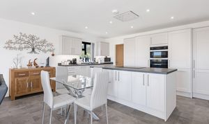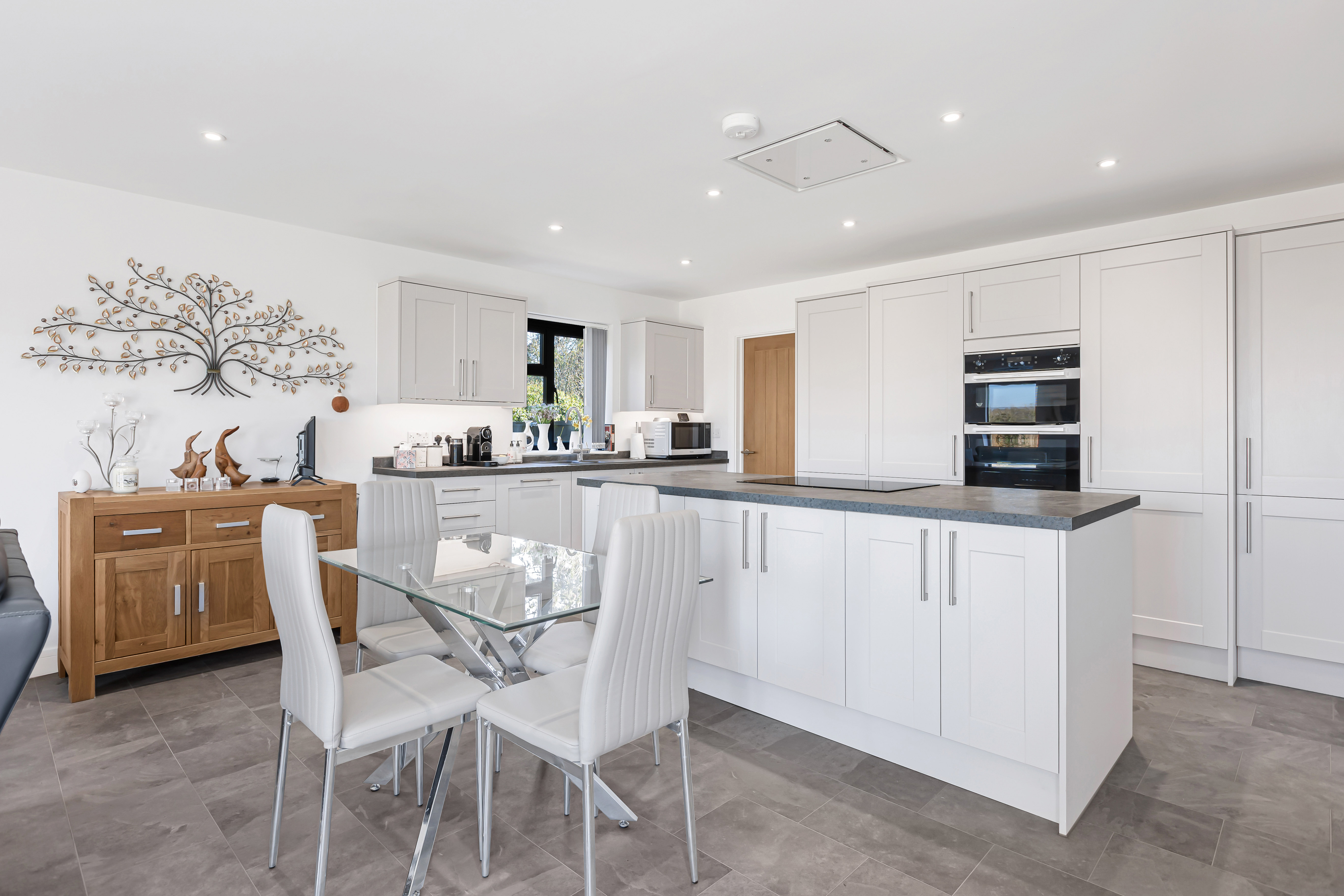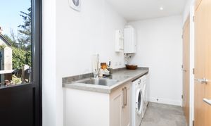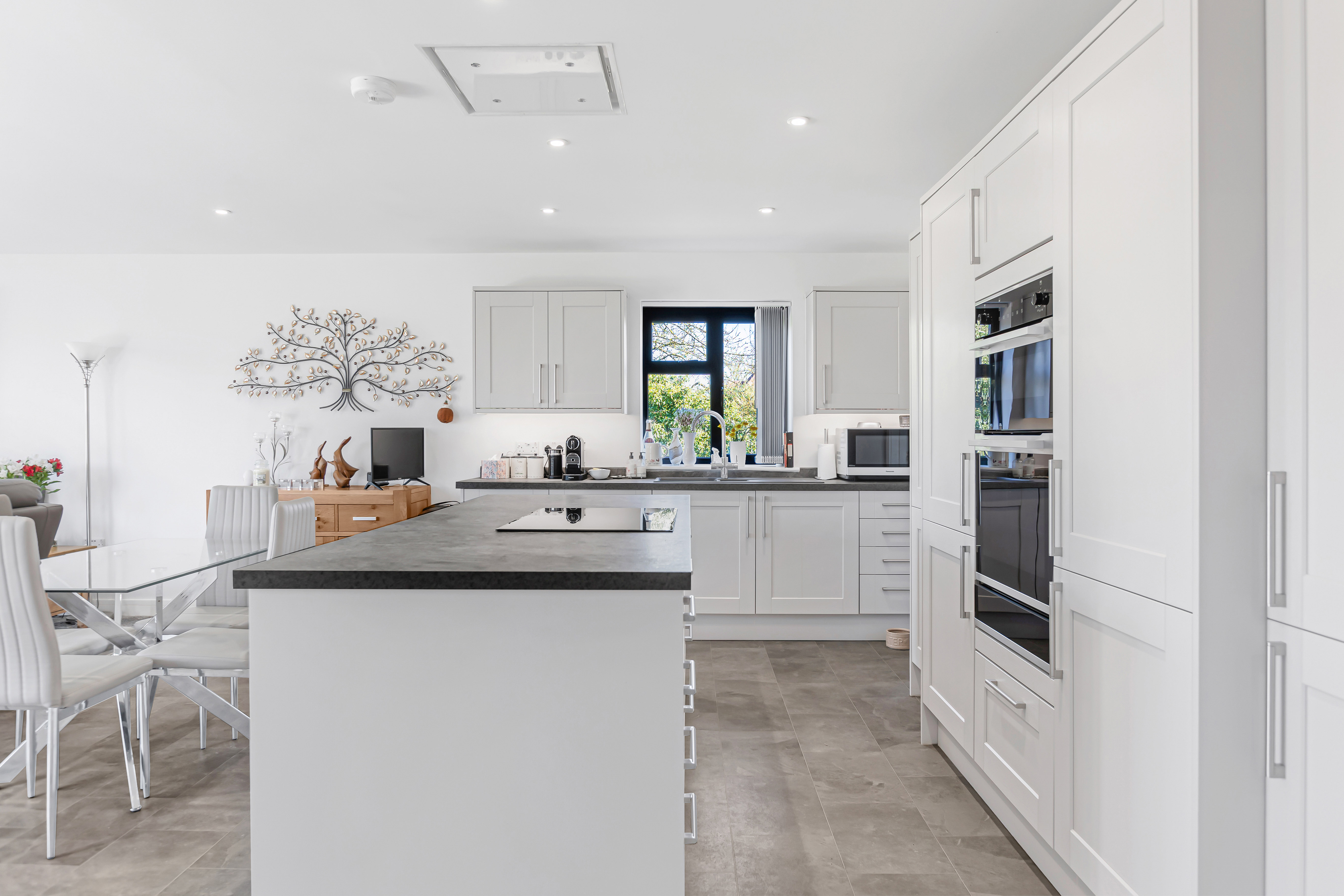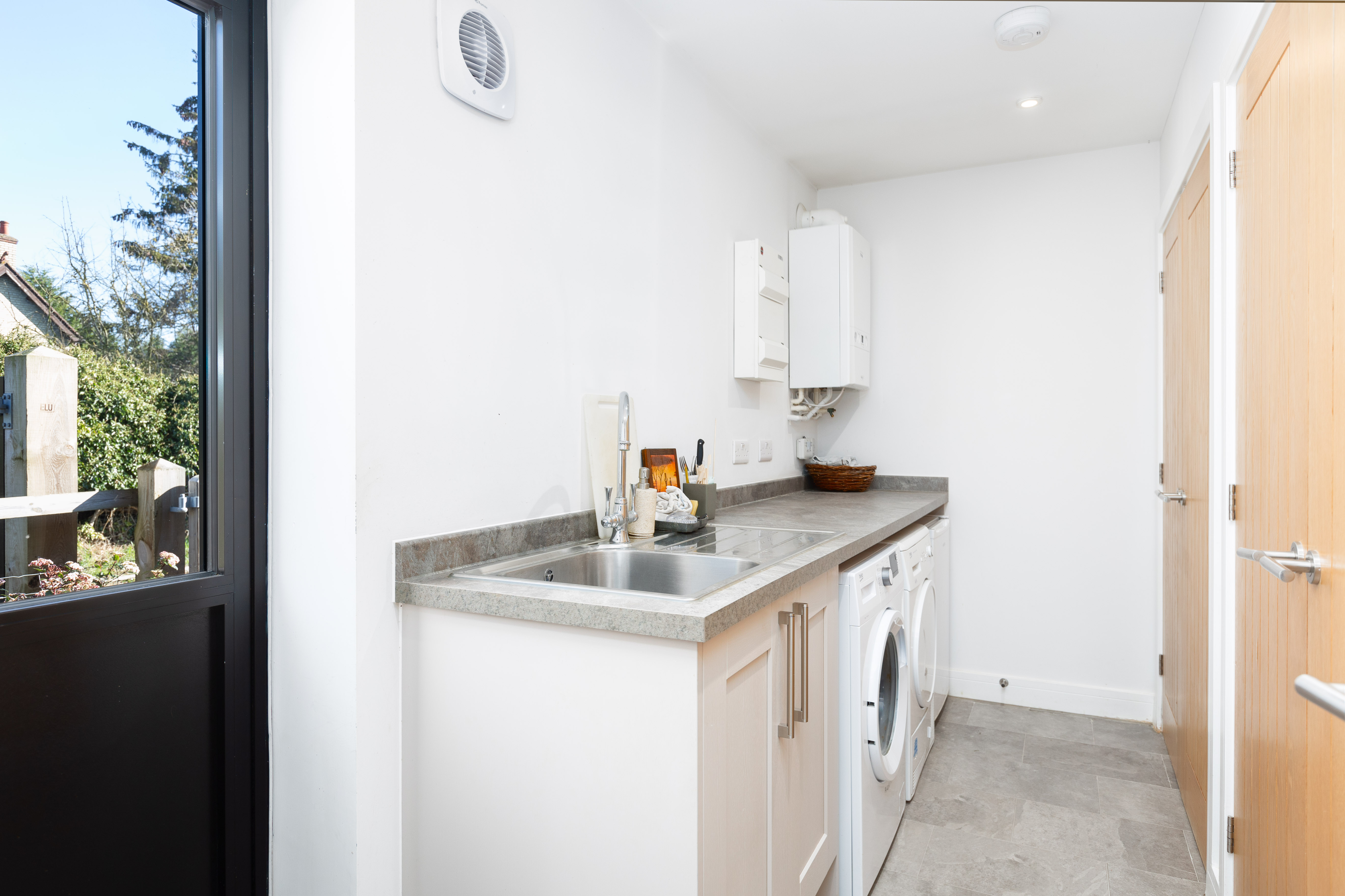 The kitchen/breakfast/living room is wonderfully open-plan, enjoying windows and bi-fold doors to a triple aspect, tiled flooring and carpet, inset lighting, a stunning garden outlook, a feature wood-burning stove, and ample space for a variety of lounge, dining and storage furniture. The kitchen area enjoys a range of modern base and wall units, composite worktops, a large island, an integrated double oven, dishwasher, hob, extractor unit, fridge/freezer, and space for other small kitchen appliances. The utility room provides further storage, access to the side of the property, and space for large laundry appliances.