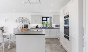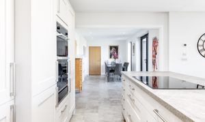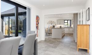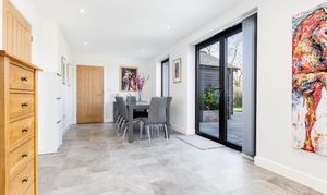 The formal dining space is an excellent size, enjoying windows and double French doors to a garden aspect, tiled flooring, inset lighting, and bi-fold doors into the kitchen area, allowing it to be an even larger open-plan space, if desired.