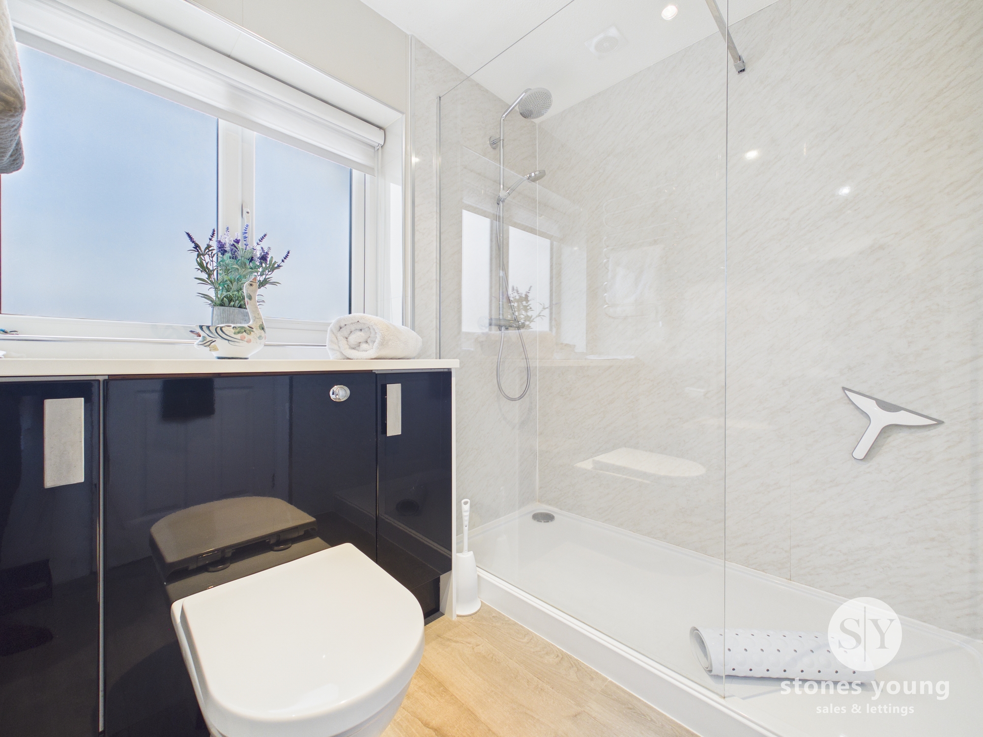 Three piece suite with walk in shower, wc and vanity unit housing sink, fitted storage, heated towel rail, laminate flooring, upvc double glazed frosted window
