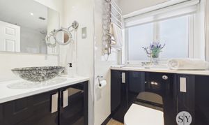 Upstairs, the luxurious master bedroom benefits from high quality fitted furniture and a private en-suite shower room, while three further well-proportioned bedrooms provide ample space for family or guests. The family shower room is finished to a high standard and includes useful storage solutions, ensuring practicality as well as style.