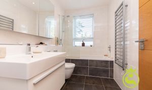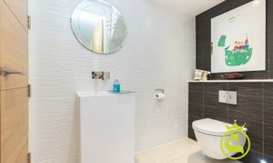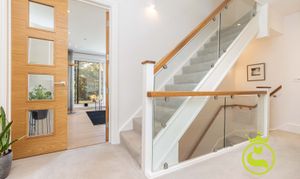 As soon as you walk through the door you are drawn to the impressive galleried mezzanine framed by a dramatic floor-to-ceiling picture window which floods the entrance hall with natural light, immediately creating a sense of space and occasion. Here you will find a cloakroom and door to the integral garage. Stairs lead down to the lower ground floor where you will find a generous reception room opening onto to the landscaped private garden, with its tranquil wooded backdrop, making it ideal for entertaining, hobbies or teenage retreat. A separate utility room keeps practicalities neatly tucked away.