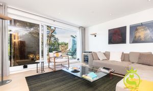 Moving from the entrance, stairs lead to the first floor. The stylish & bespoke kitchen/dining room at the front of the house is a sociable space with stone worktops, top of the range integrated appliances and a sleek mirrored breakfast bar. To the rear, a welcoming living room flows effortlessly onto a spacious terrace, where west-facing views create the perfect setting for enjoying sunsets with friends and family with glimpses of the harbour through the trees.