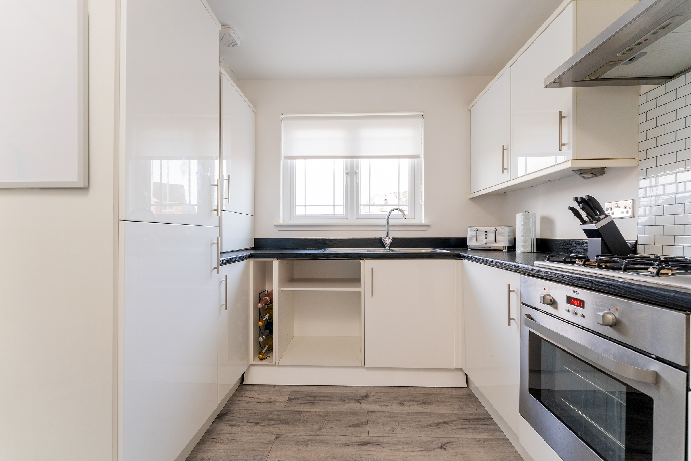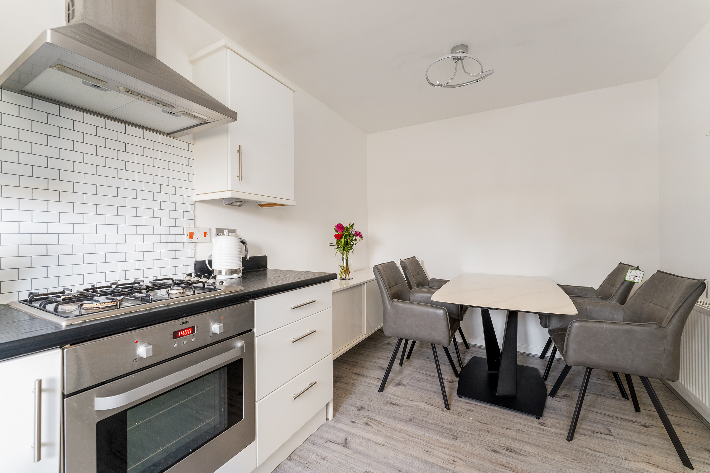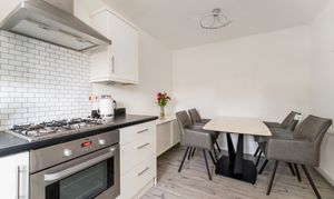 The fitted kitchen features modern, high gloss units, and plenty of cupboard space. There is a single electric oven, gas hob, extractor hood, and an integrated fridge/freezer, with space for a standalone washing machine. The spacious dining area currently hosts a dining table with four chairs and a sideboard.