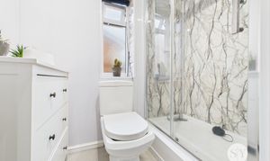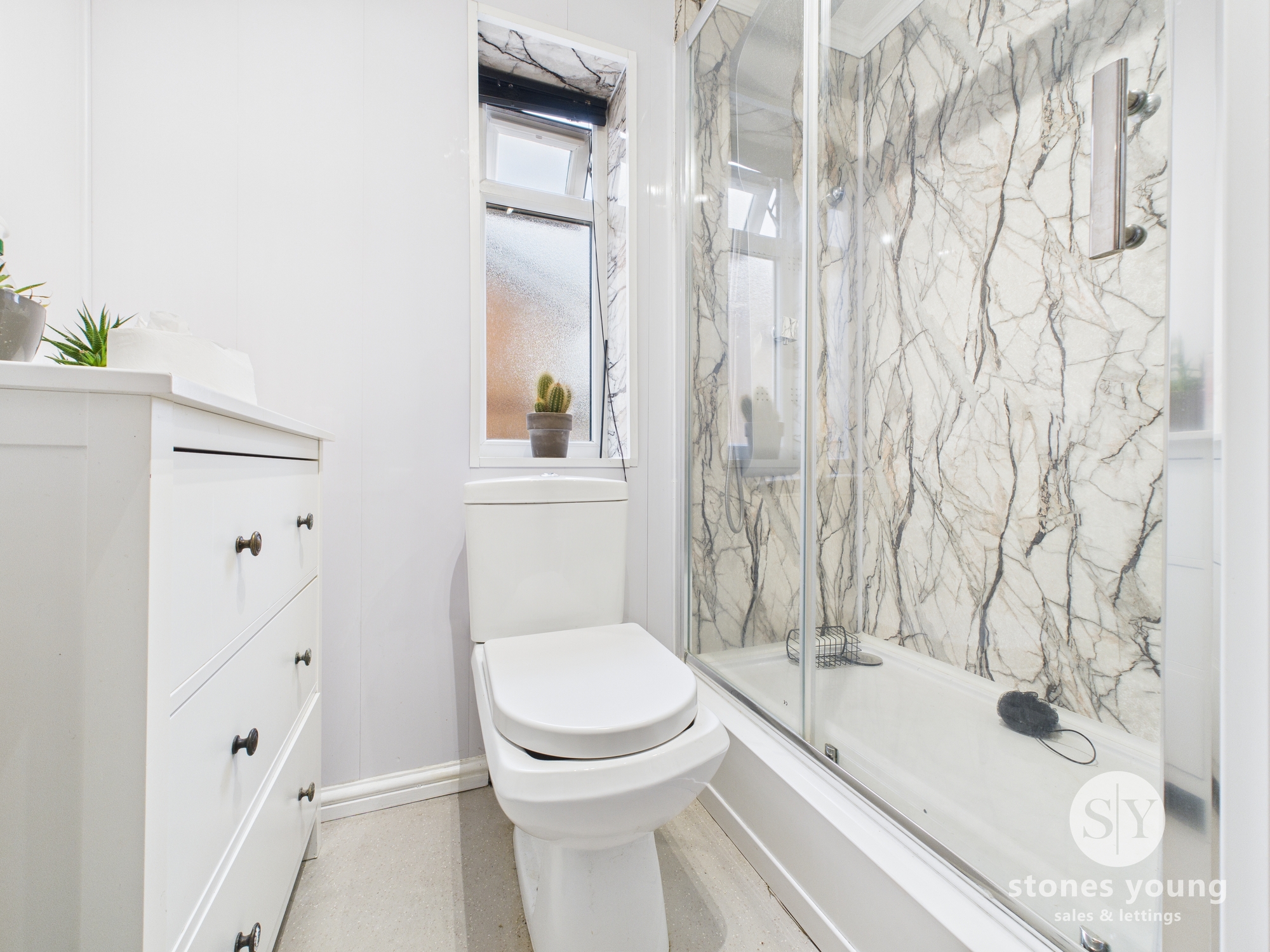 vinyl flooring, three piece in white comprising of shower enclosure with main fed shower, wc, basin, upvc double glazed frosted window