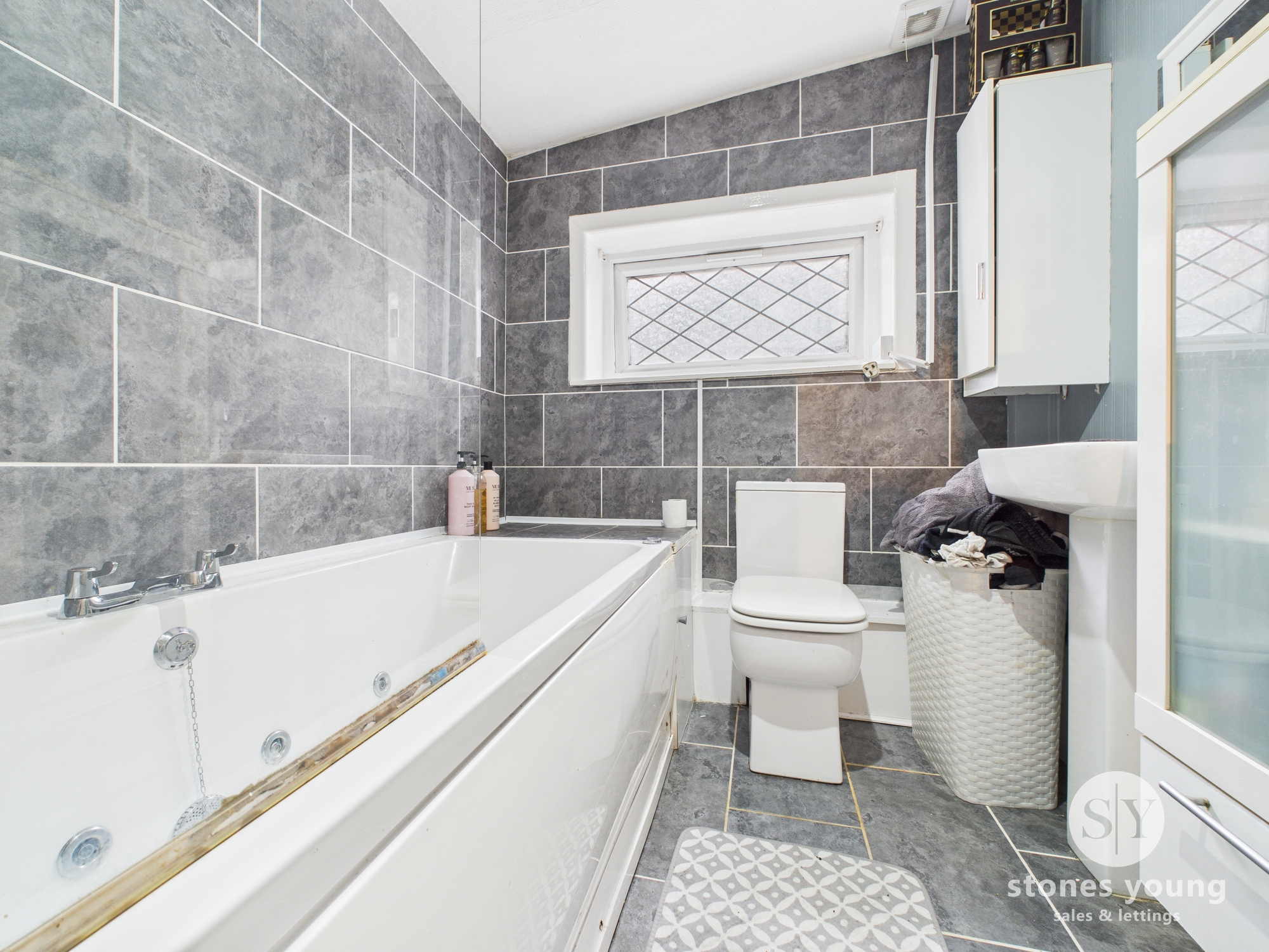 tiled flooring, three piece in white comprising of jacuzzi bathtub with electric shower, wc, basin, upvc double glazed frosted window