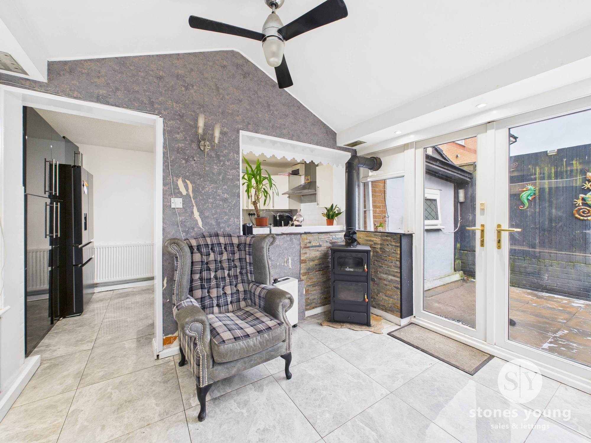 tiled flooring, panel radiator, log burner, ceiling fan, uPVC double glazed windows, uPVC double glazed French doors