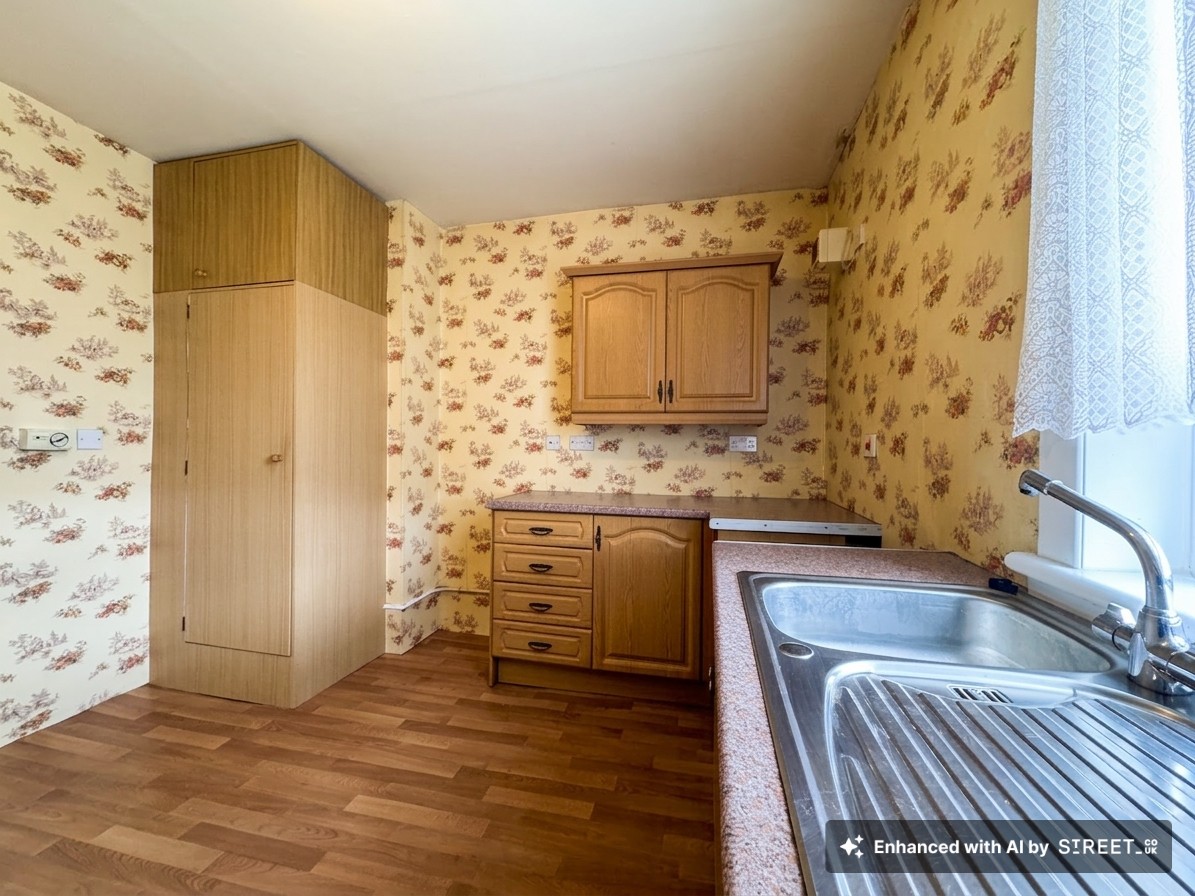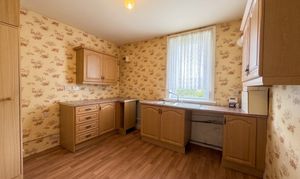 The kitchen is fitted with a range of wall and floor mounted units complemented by worktop surfaces, offering ample storage and preparation space.