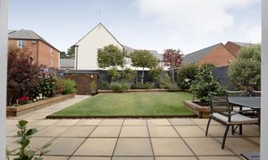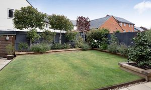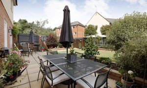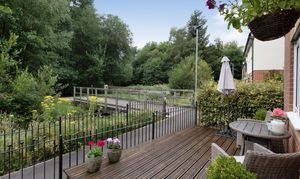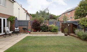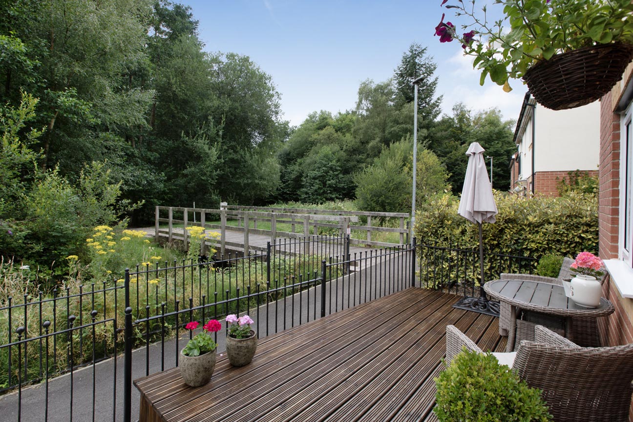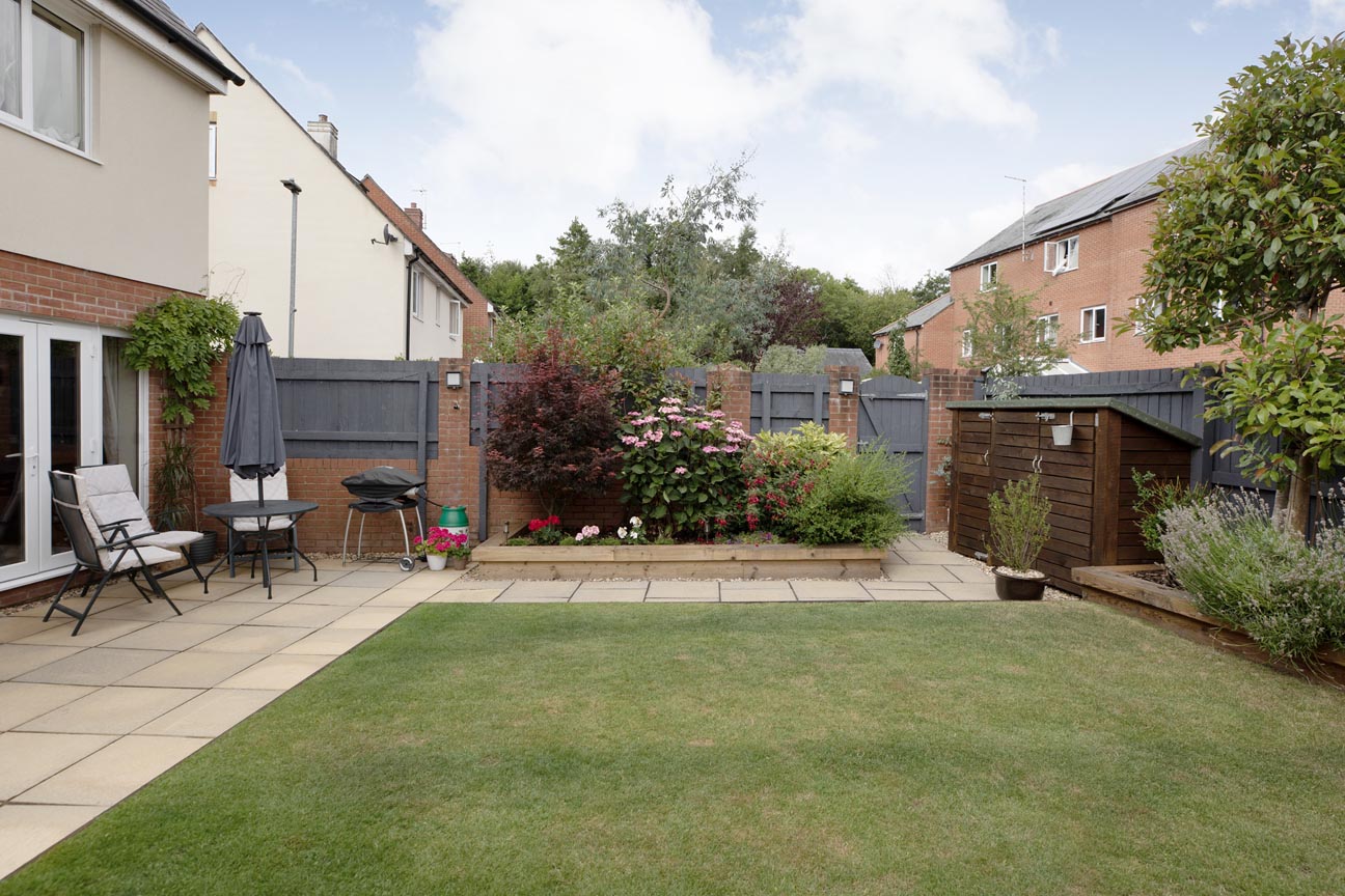 STEP OUTSIDE: To the front of the property a gated pathway leads to the front door and to one side a raised decking area, ideal for relaxing outdoors over looking the pleasant woodland and park views. To the rear, an immaculate garden features a generous patio extending from the living space—perfect for alfresco dining, summer barbecues, or relaxing with family and friends. Beyond the patio is a level lawn bordered by raised flowerbeds, an enclosed bin store and gated access to the tandem driveway parking for two cars in front of the garage with an up-and-over door.