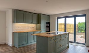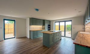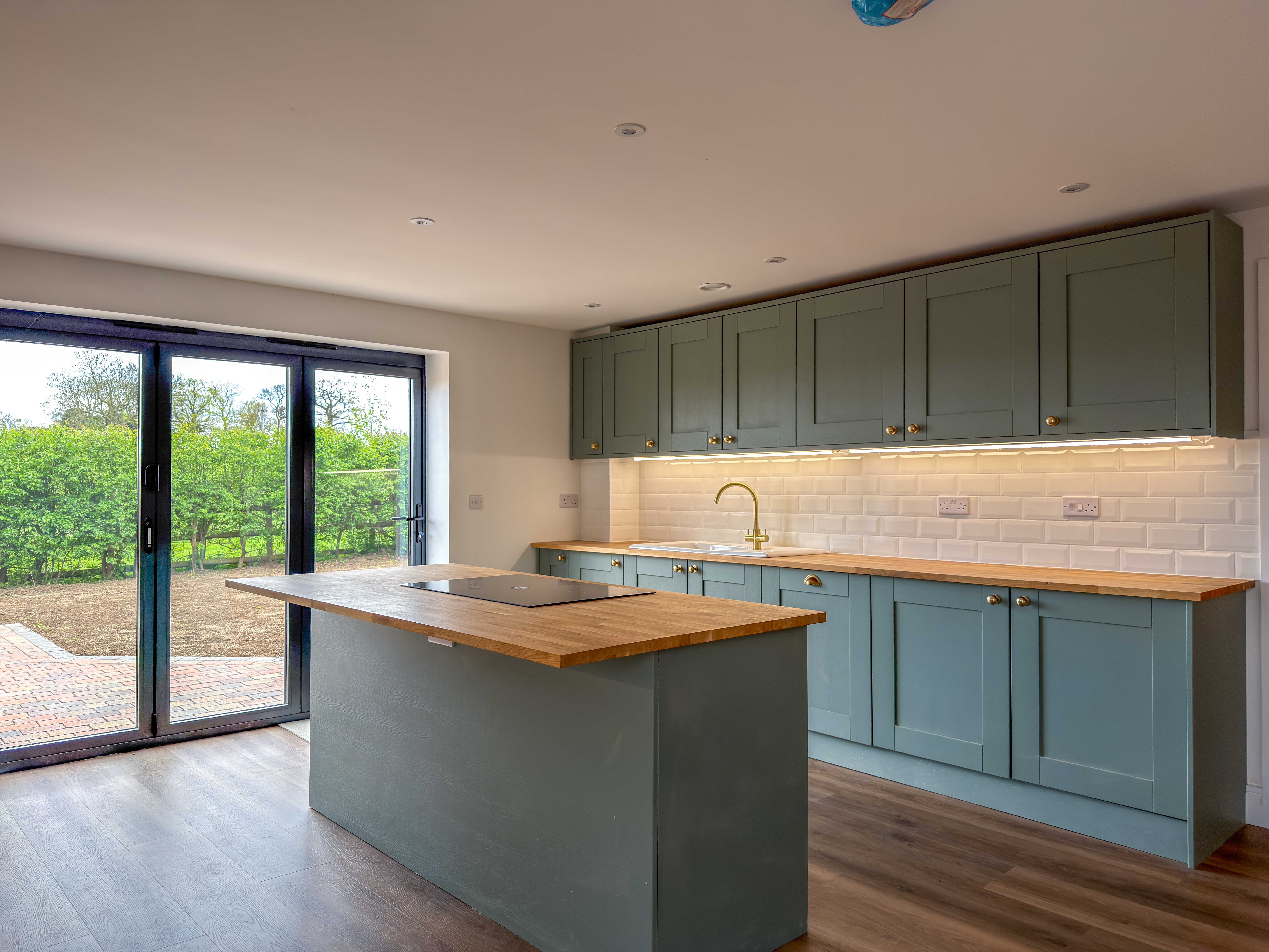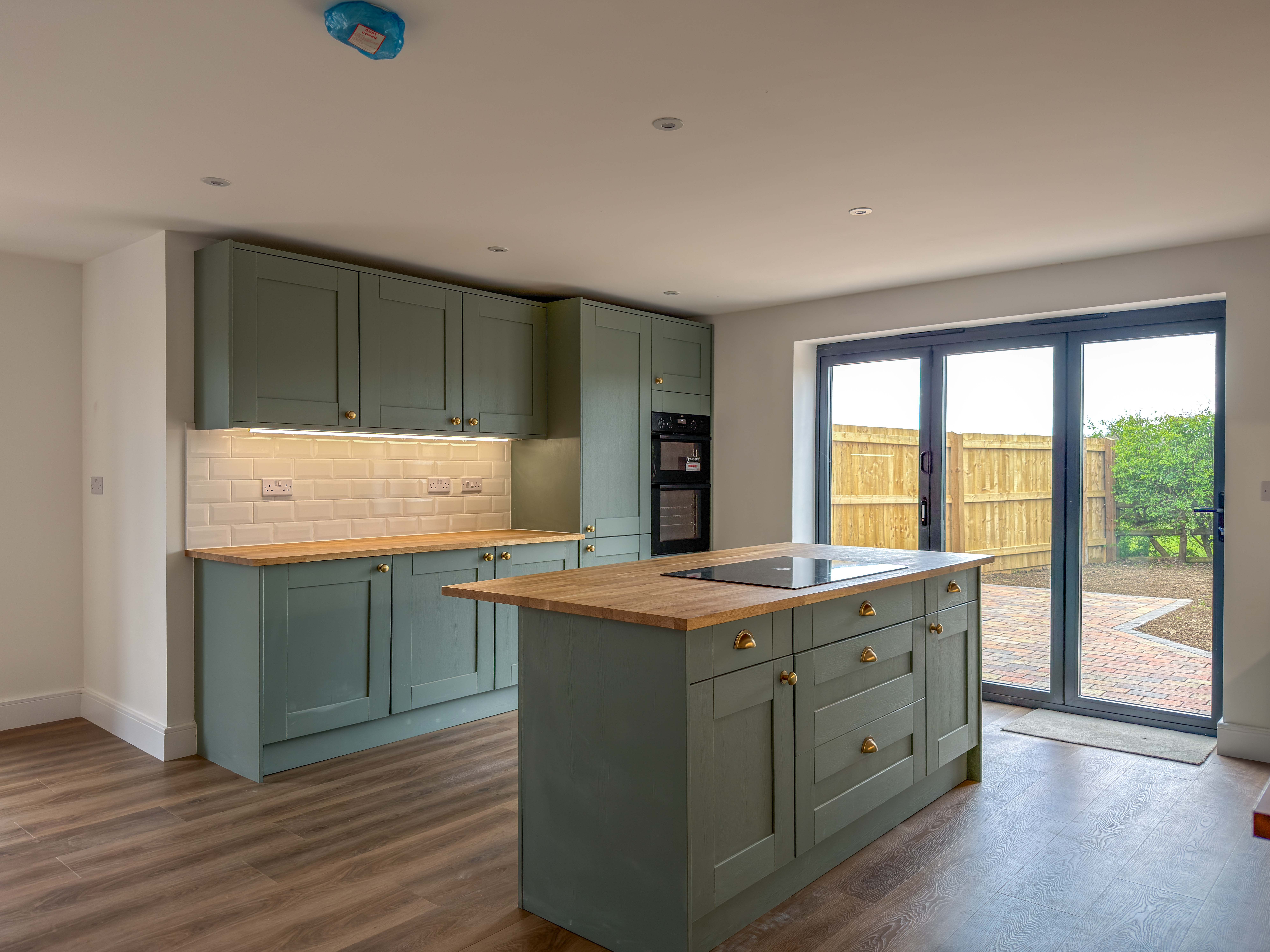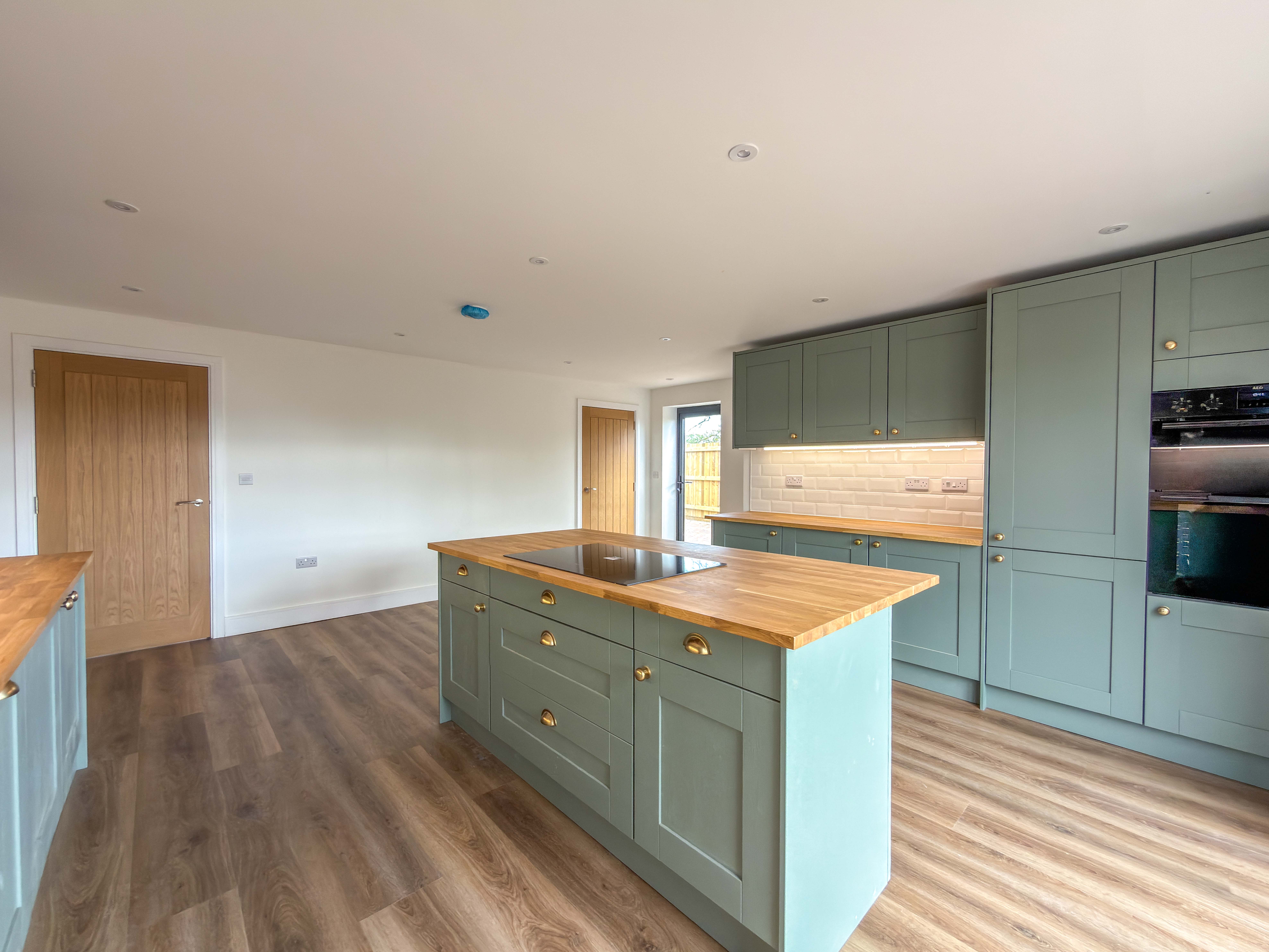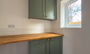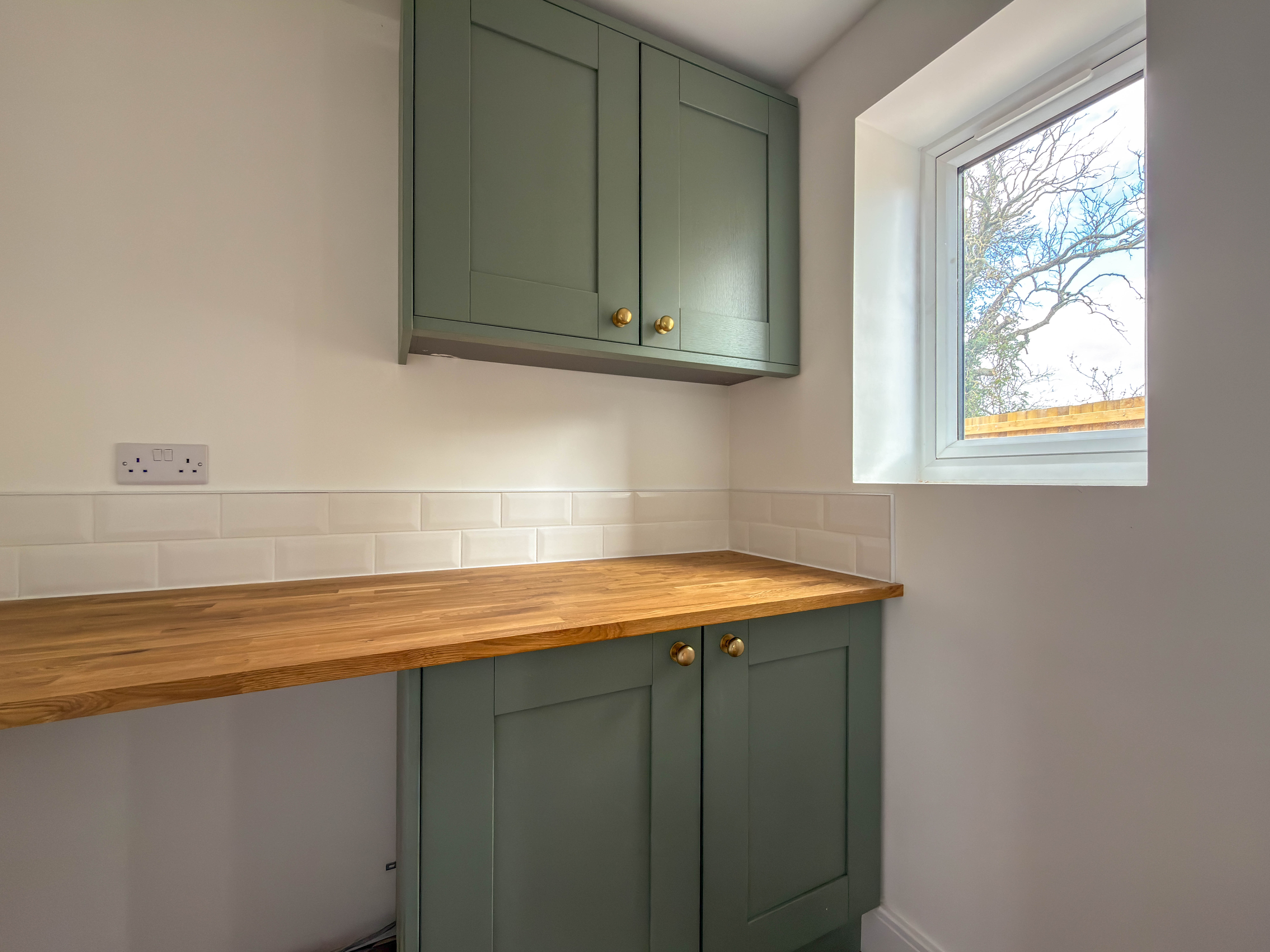 At the heart of the home sits a stunning open-plan kitchen and dining space, beautifully designed with shaker-style wooden cabinetry, complementary wooden worktops and a full range of integrated appliances. Both elegant and highly functional, this is a space made for everyday family life as well as entertaining on a grander scale. Bi-fold doors open directly onto the enclosed and lawned rear garden, creating a seamless connection between inside and out, while a separate utility room with matching units and worktops provides additional practicality with plumbing for a washing machine / tumble dryer.