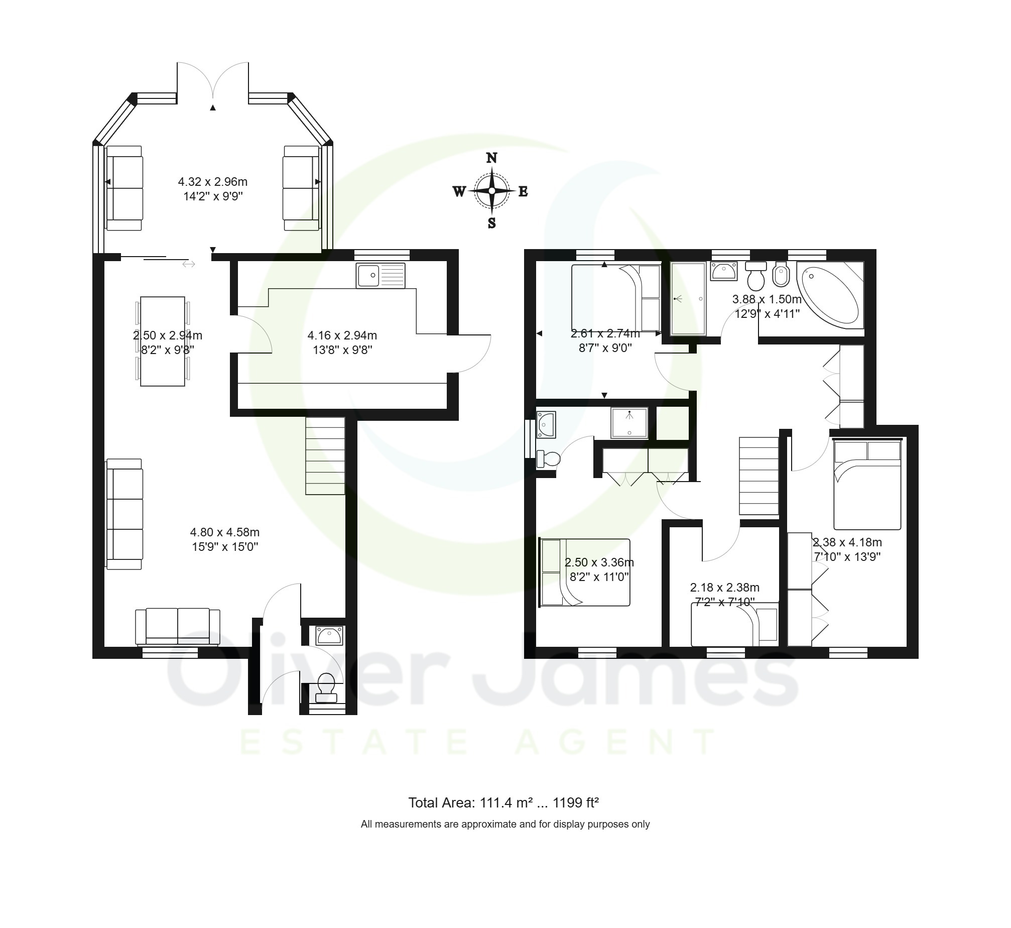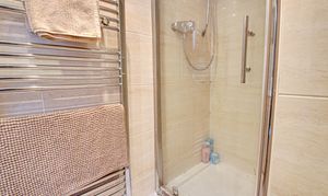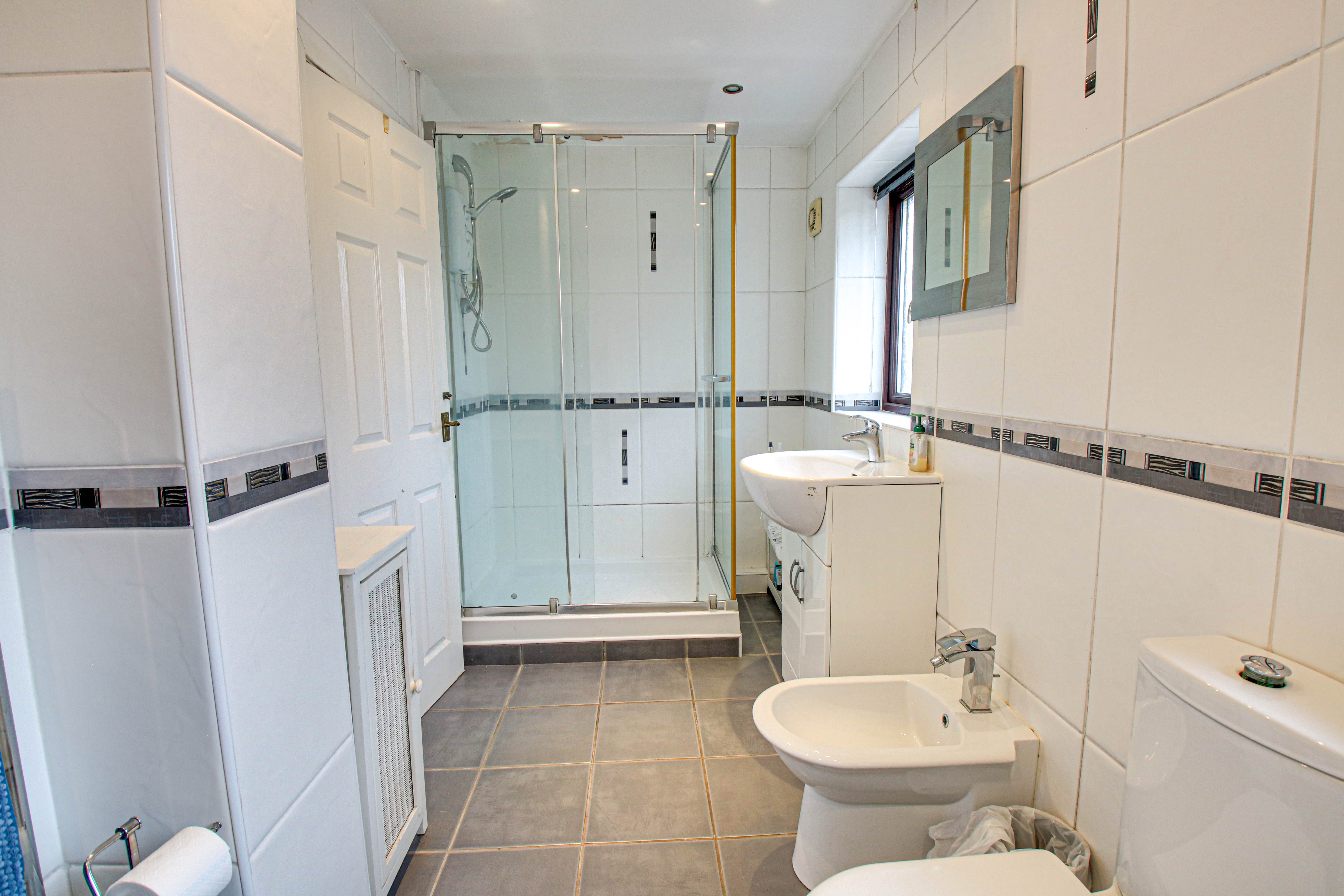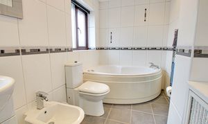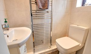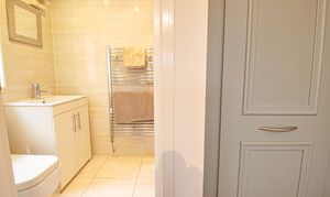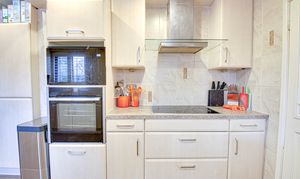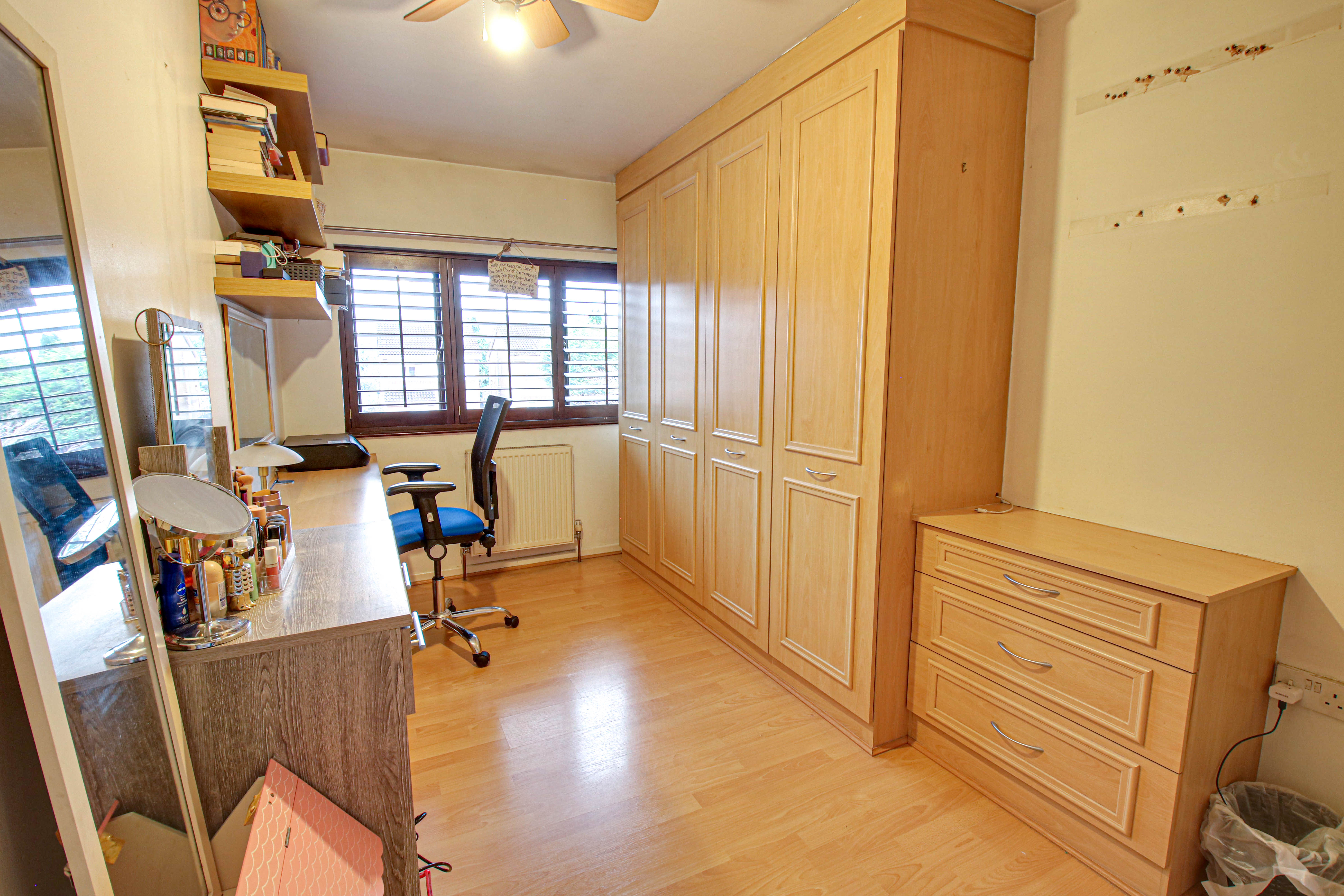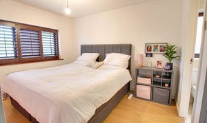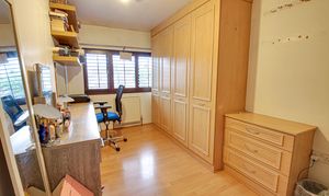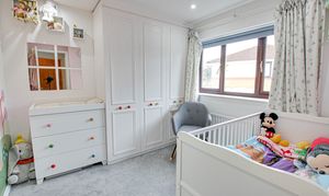 The spacious kitchen is thoughtfully designed with sleek cabinetry, integrated appliances, and ample countertop space, illuminated by large windows that fill the space with natural light. Two bathrooms feature contemporary fixtures, including stylish walk-in showers, heated towel rails, corner bath-tubs, and sleek vanity units with practical storage solutions. The bedrooms are generously proportioned, many with built-in wardrobes, laminate or wooden flooring, and large windows with shutters for adjustable natural light and privacy. One bedroom benefits from an en-suite bathroom, and there is a dedicated nursery with charming child-friendly décor and soft carpeting. Additional built-in storage throughout the home ensures clutter-free living.