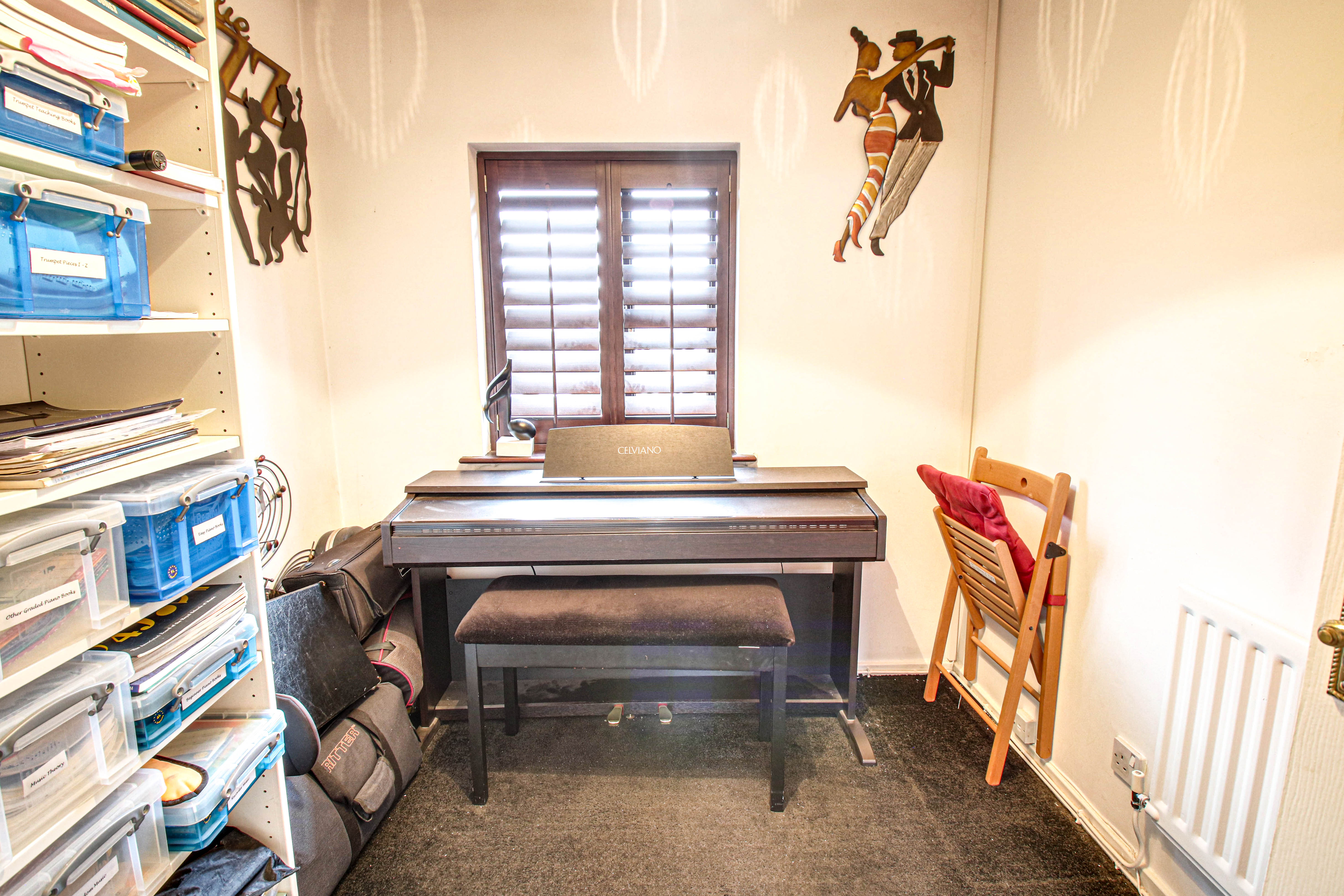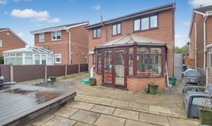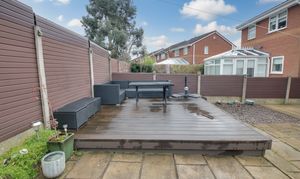 Outdoor living is a true highlight of this property. The private, fenced rear garden offers a spacious decked seating area and a paved patio, ideal for alfresco dining or entertaining guests. The conservatory’s garden access and the seamless indoor-outdoor flow provide the perfect backdrop for family gatherings or peaceful retreats. The garage offers secure vehicle storage or additional space for hobbies, while dedicated rooms with built-in shelving are ideal for use as a home office, study, or music room. Thoughtful touches, such as a modern front door with decorative glass, a welcoming entrance hall with wooden flooring, and multiple family-friendly safety features, add to the home’s appeal. This detached house is perfectly designed for modern family living, blending style, comfort, and practicality in every detail.