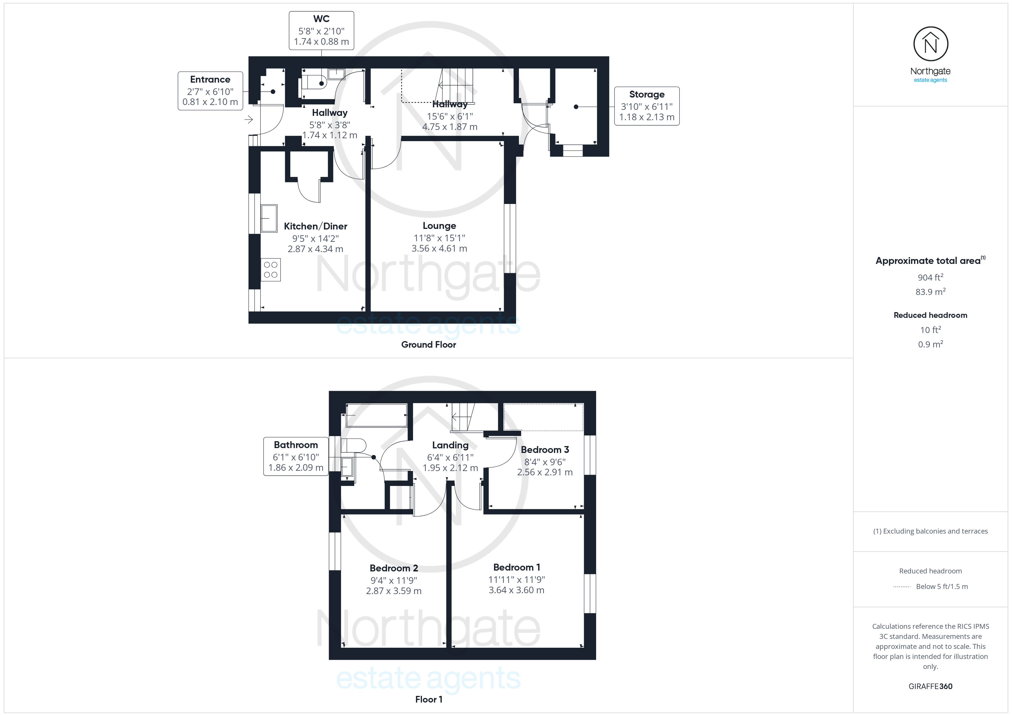 The ground floor features an entrance hallway with cloakroom/WC, a spacious living room, and a fitted kitchen/dining room.