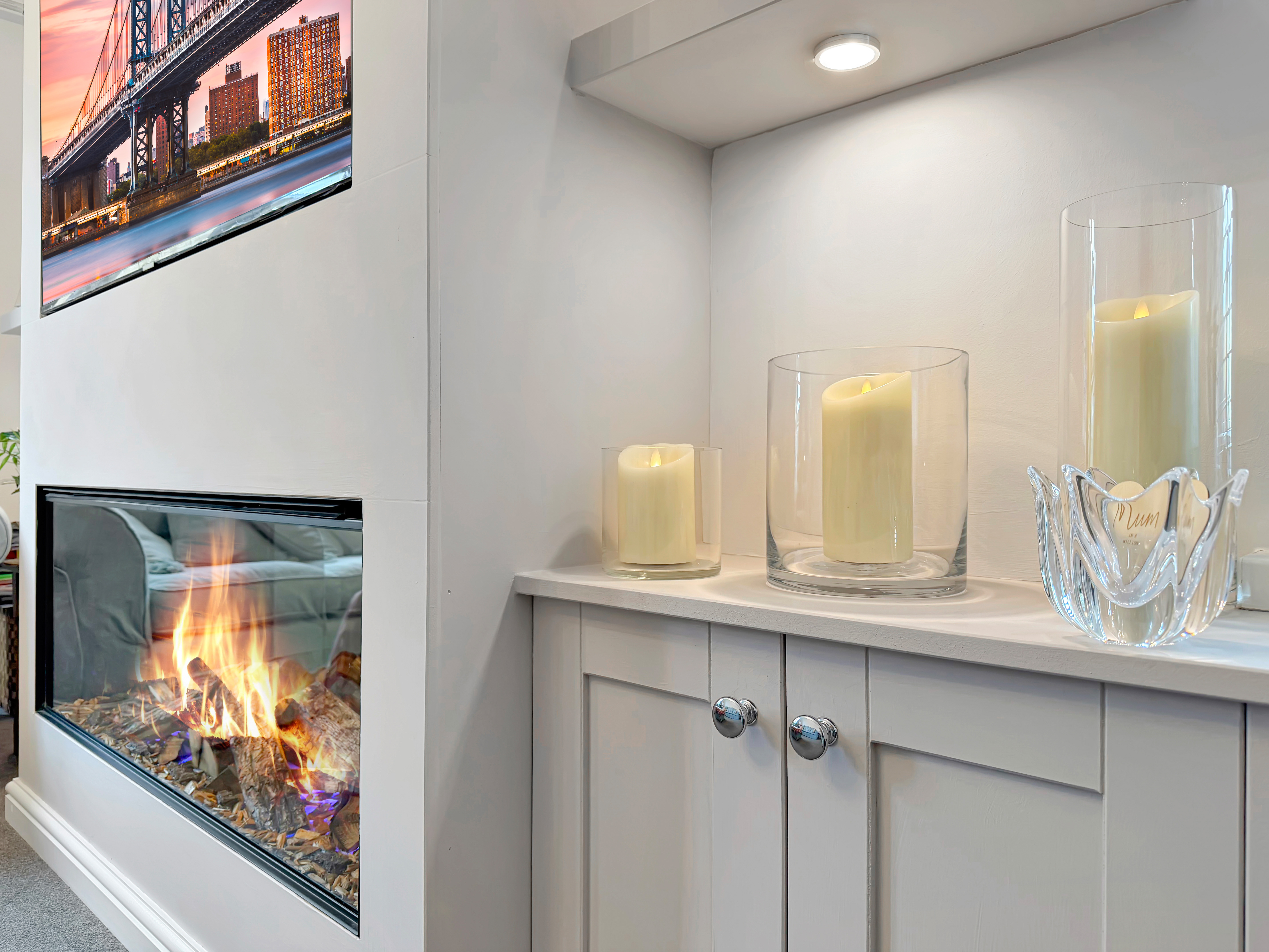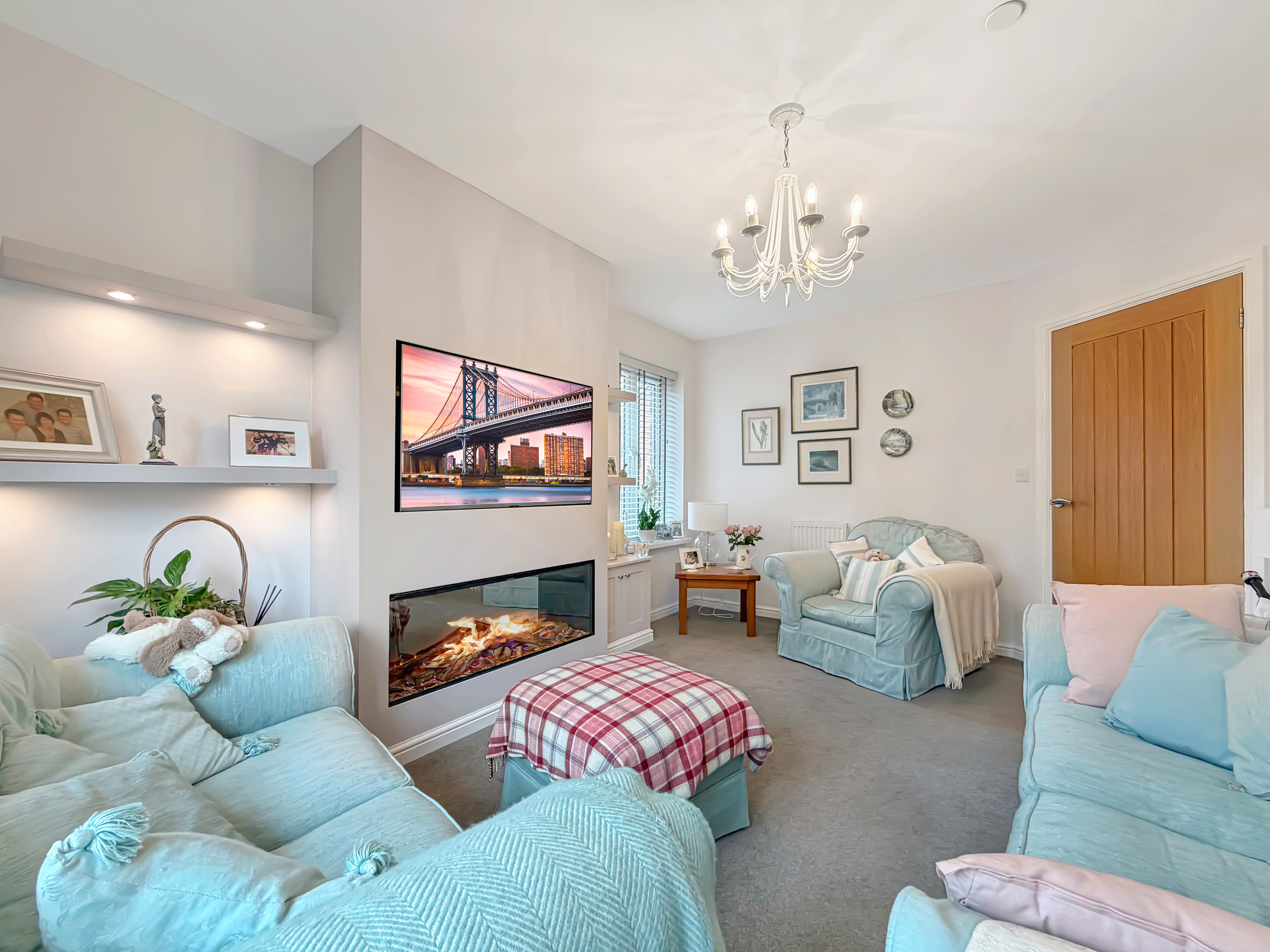 As you step inside, you are greeted by a sense of warmth and comfort, with the cosy lounge featuring double doors that lead out to the garden, dual aspect, media wall with built in fire place and under shelf lighting. This room is inviting and flooded with natural light and fresh air.