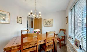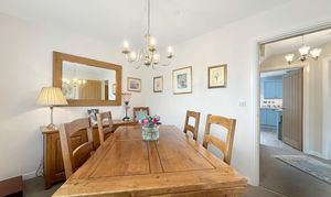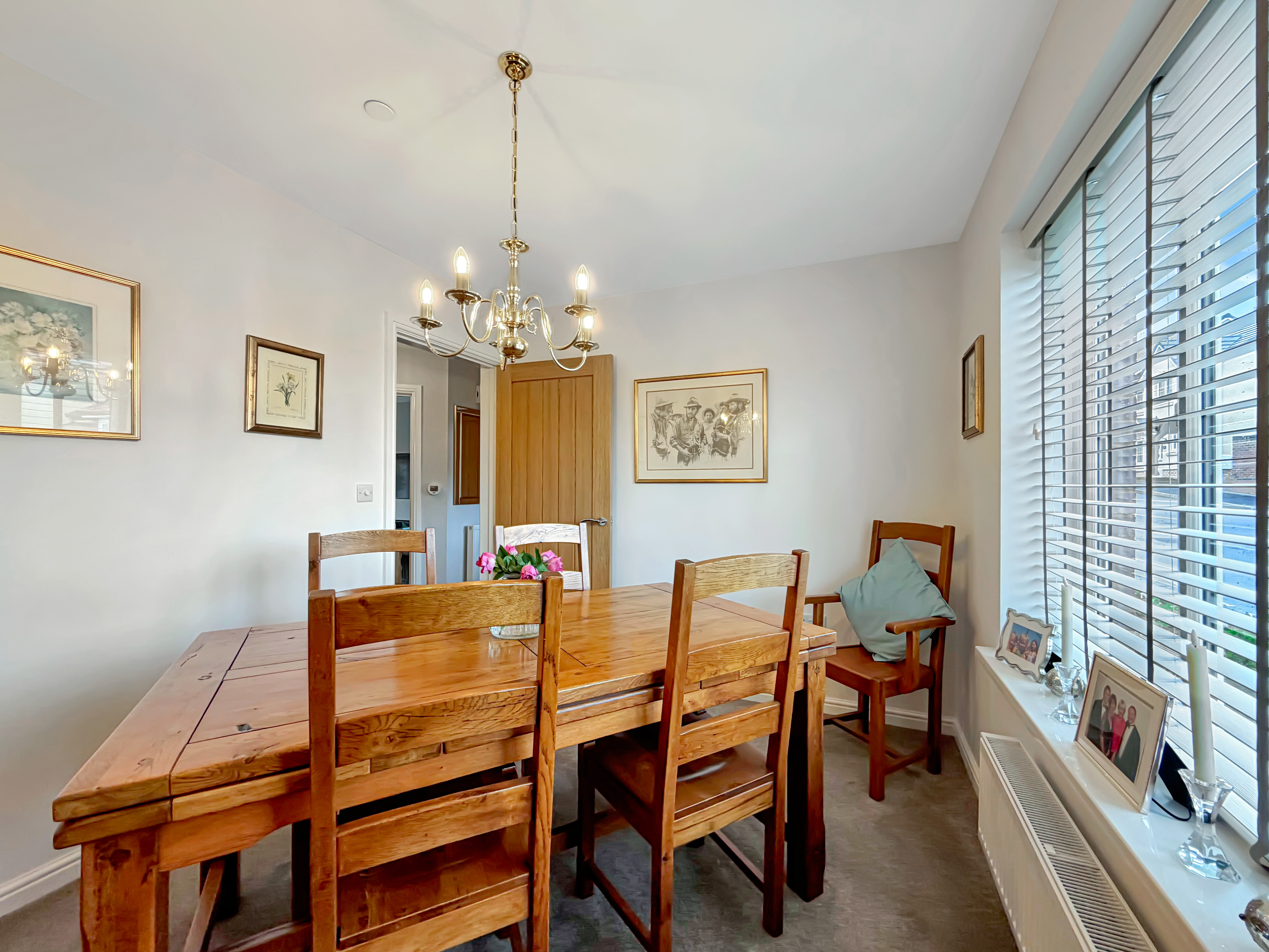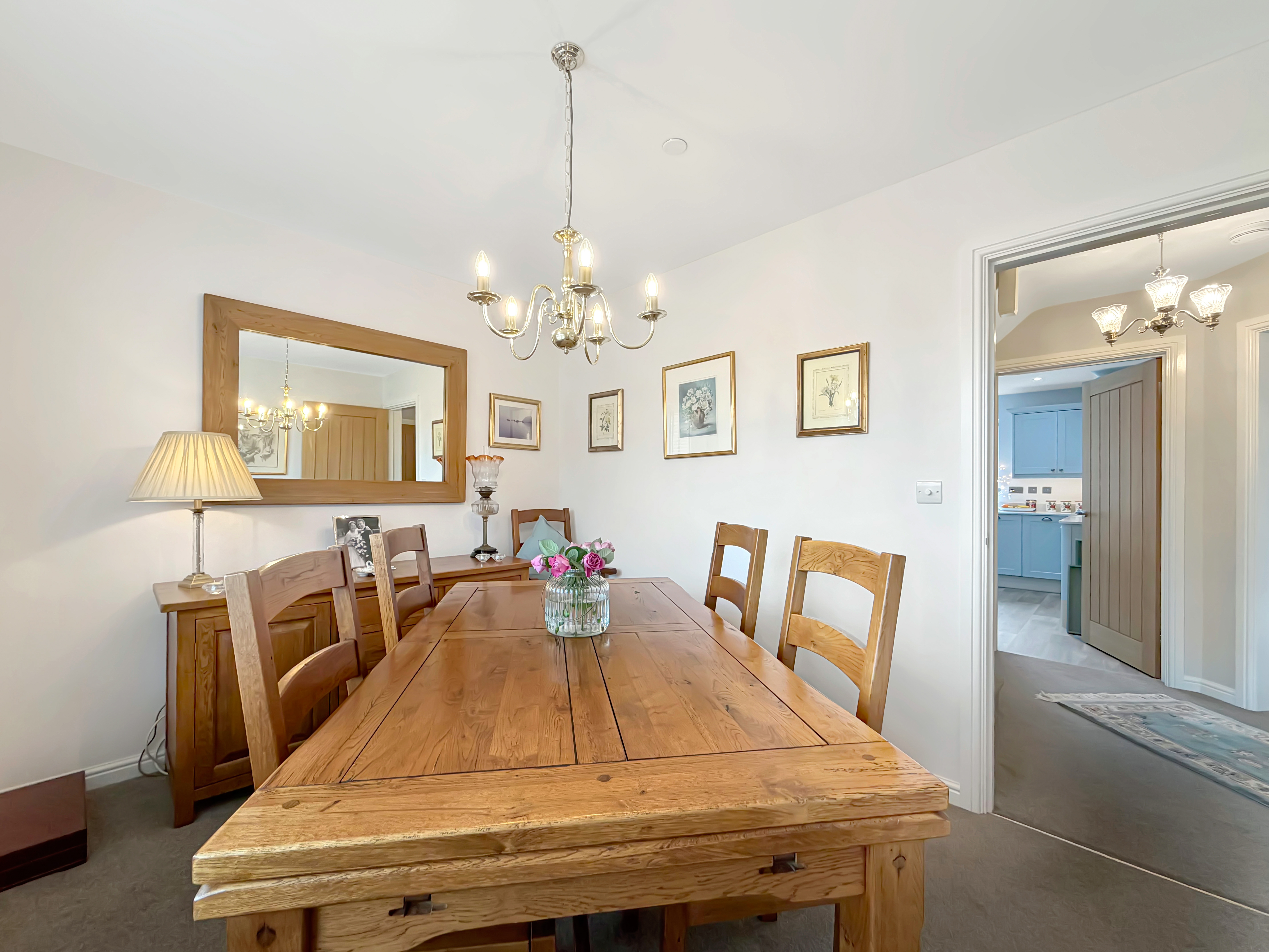 The well-sized dining room overlooks the green, providing a peaceful backdrop for your meals and gatherings.