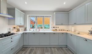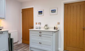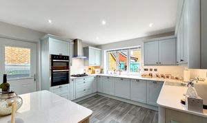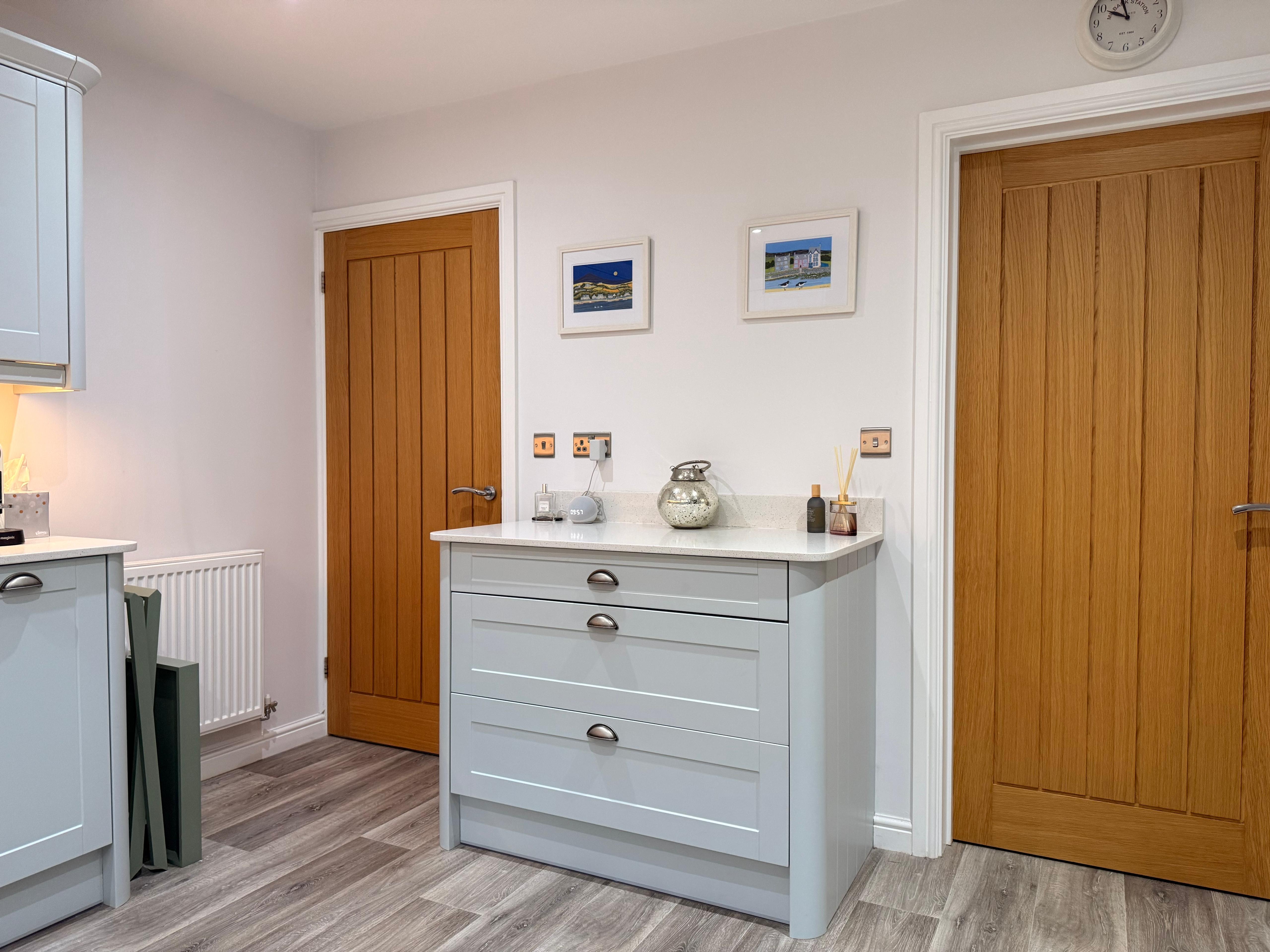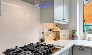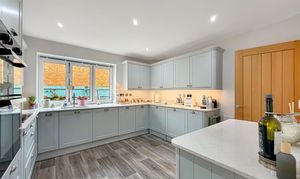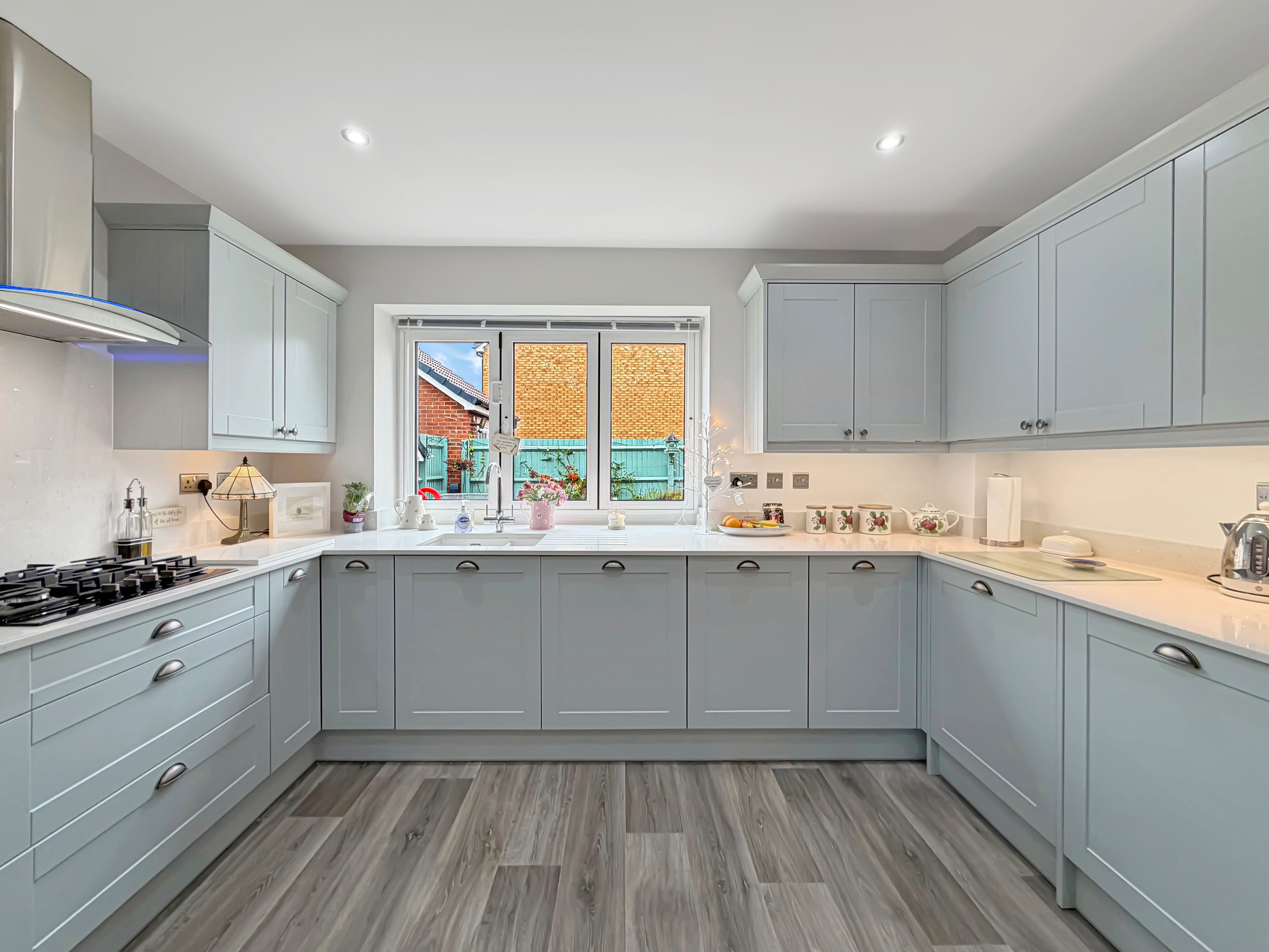 The heart of the home lies in the stunning kitchen, equipped with quartz worktops and built-in appliances that cater to both functionality and style, under unit lighting and ceramic sink.
