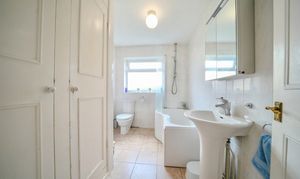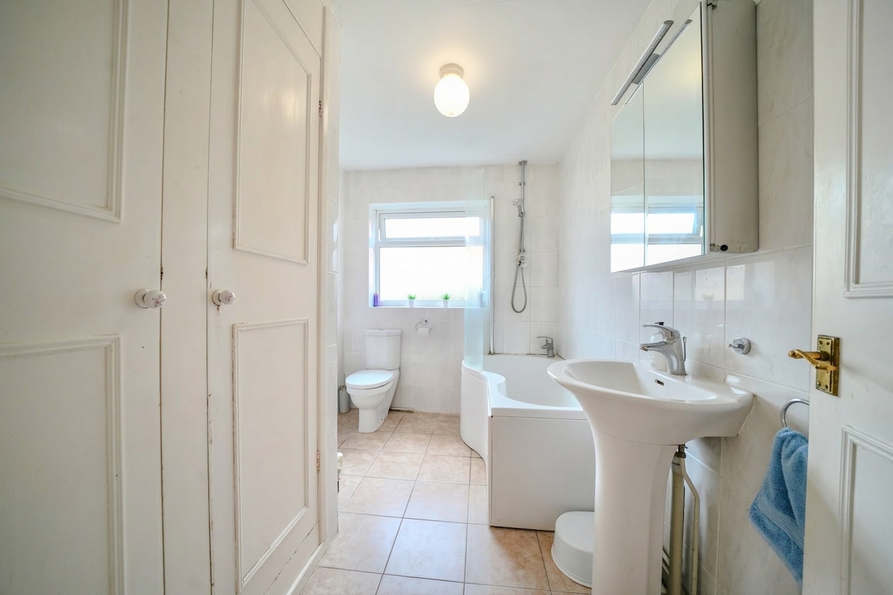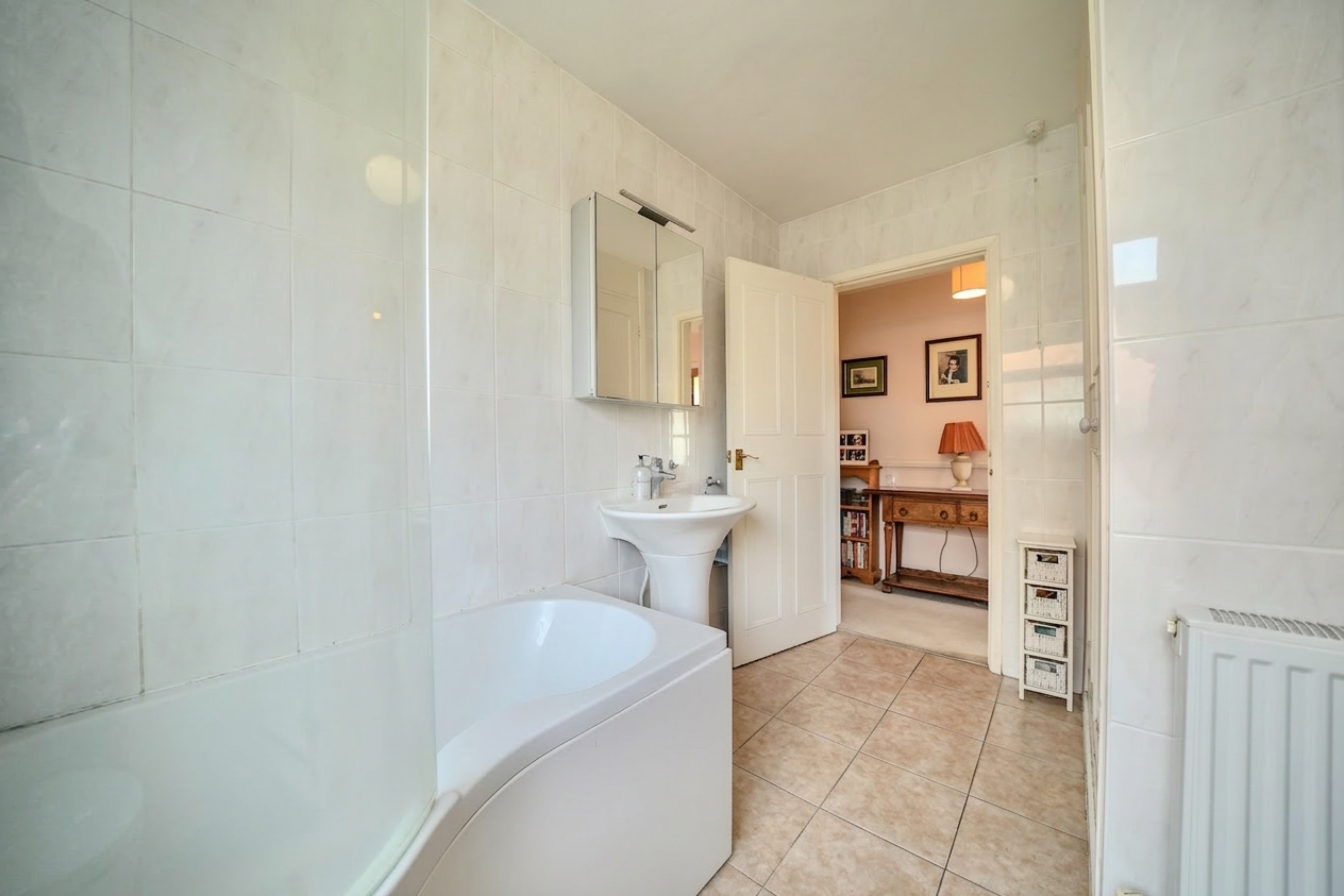 uPVC obscure double glazed window to the side aspect, built-in airing cupboard, panel-enclosed bath with glazed shower screen and shower over, pedestal wash hand basin, dual flush WC, wall mounted radiator, tiled flooring and tiled walls.