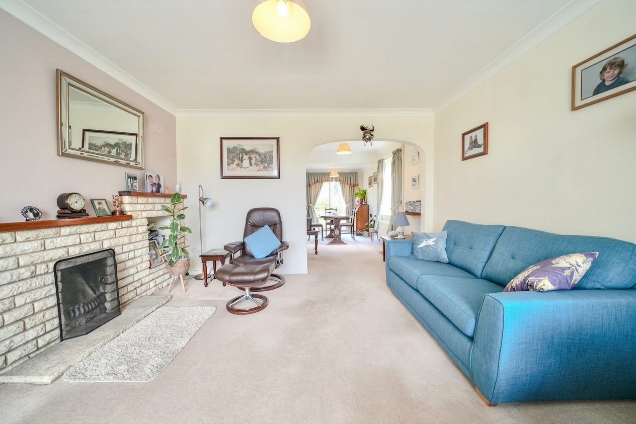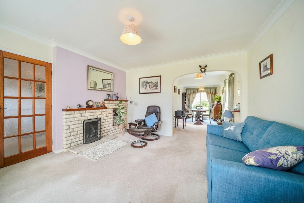 uPVC double glazed window to the front aspect, carpeted flooring, wall mounted radiator, open fire with decorative brick surround and archway opening to the dining room.