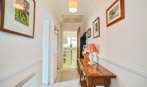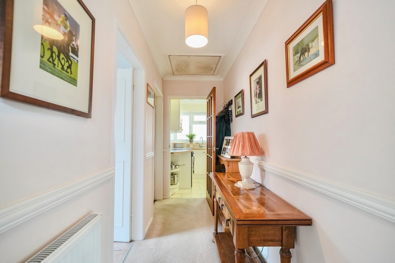 uPVC part double glazed entrance door to the front aspect, carpeted flooring, wall mounted radiator, loft access hatch, part glazed doors to the lounge and kitchen, doors to the bathroom, bedrooms 1 and 2.