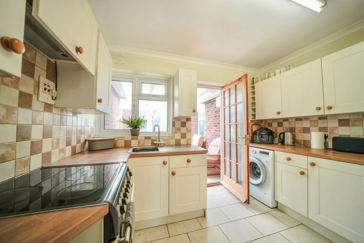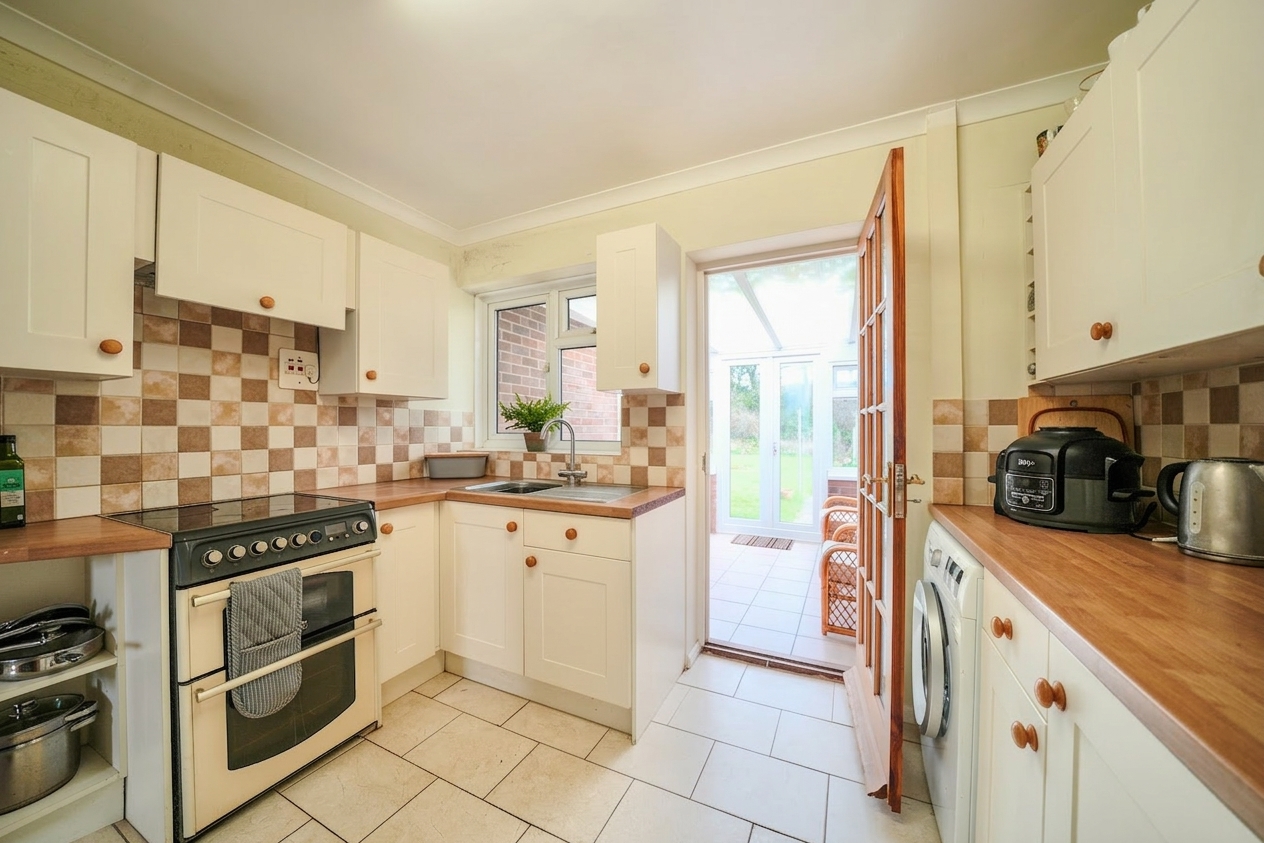 uPVC double glazed window to the rear aspect, a range of fitted base and wall mounted units with work surfaces over, inset stainless steel sink with mixer tap over and side drainer, space for freestanding cooker with filter hood above, tiled splashbacks, tiled flooring, space for fridge freezer, space and plumbing for washing machine, and part glazed door to the conservatory.