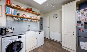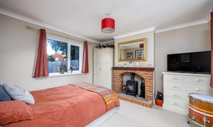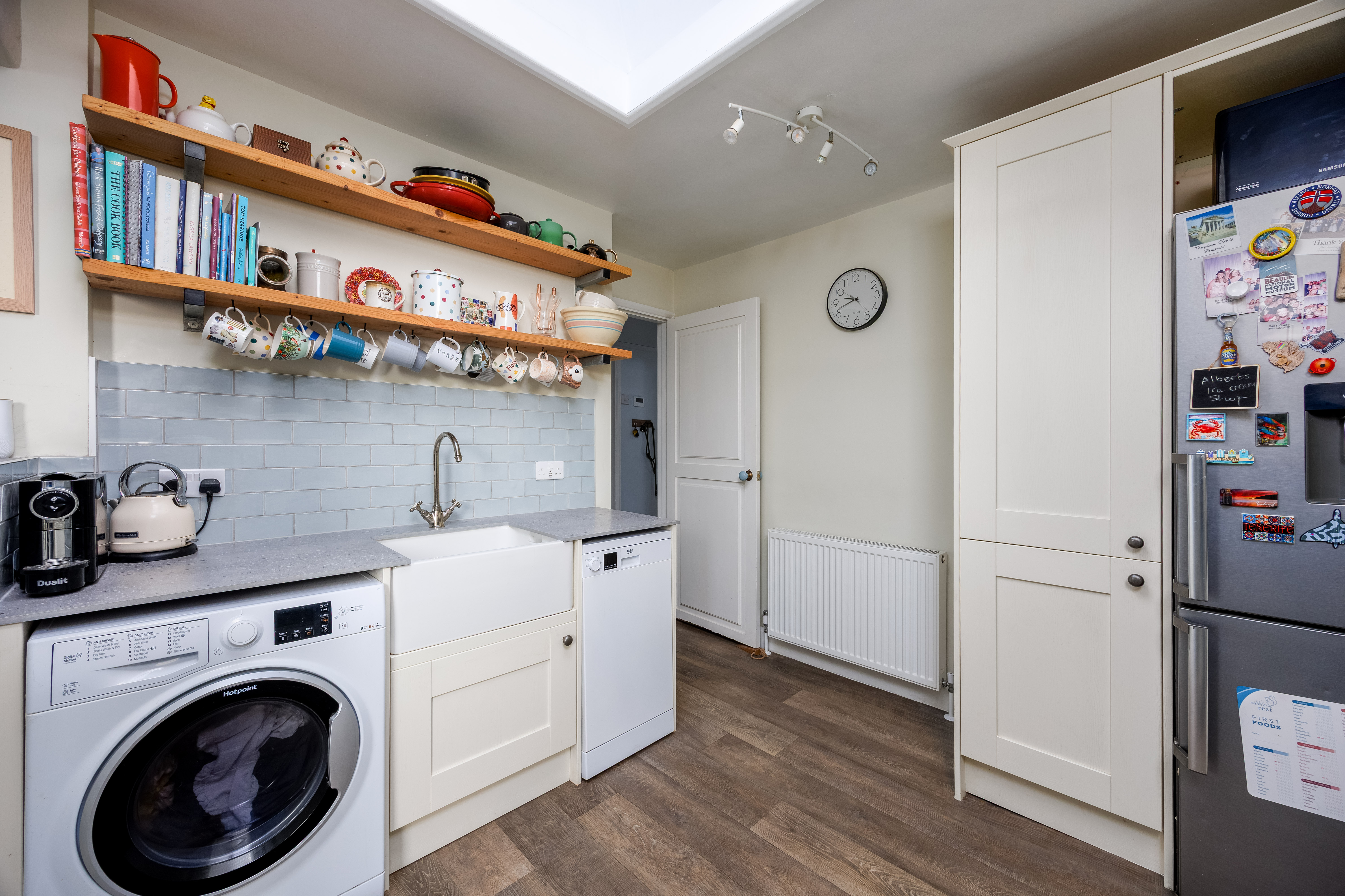 There is also a RE-FITTED BATHROOM with bath with rainfall shower and a skylight. To the front are 2 bedrooms one with fireplace & woodburner. Further benefits include double glazing & gas fired central heating,