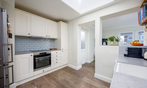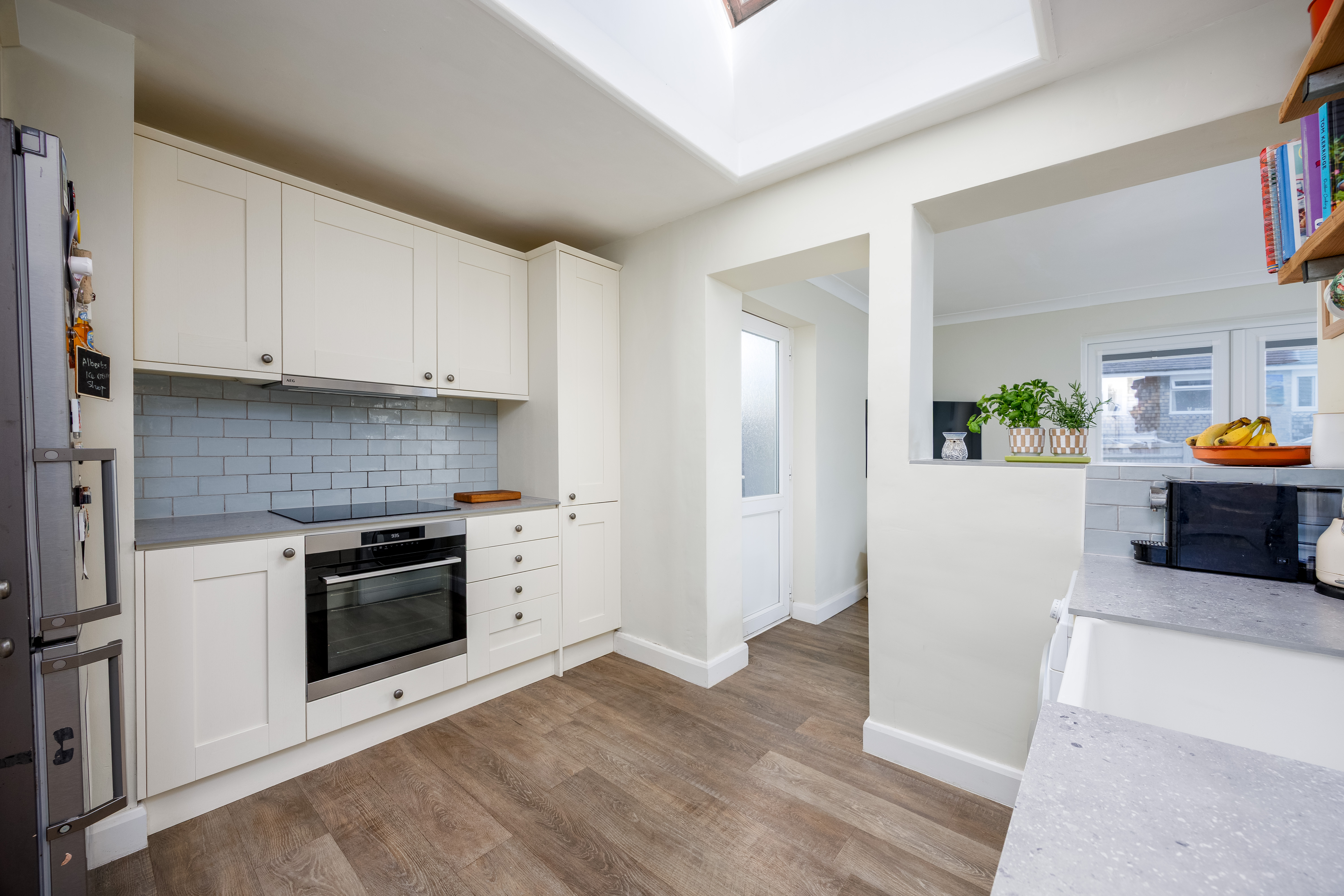 The front door leads into a porch and thence onto the hall which has access to the loft with fitted ladder. The RE-FITTED KITCHEN has a vaulted ceiling with skylight and has a butler sink, AEG electric oven & hob and a fridge/freezer. This room then opens onto the TRIPLE ASPECT LIVING ROOM which has double doors to the rear garden.