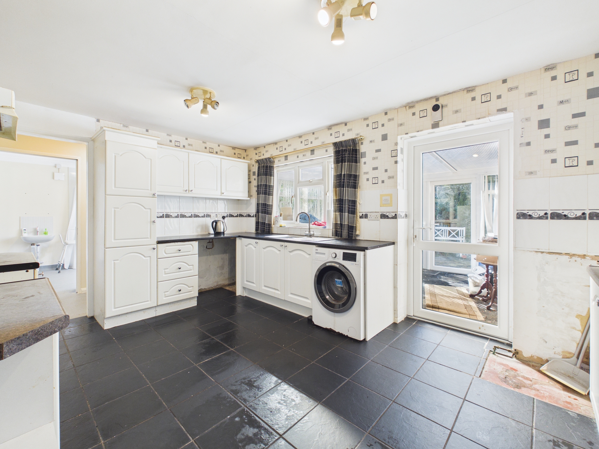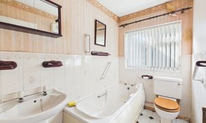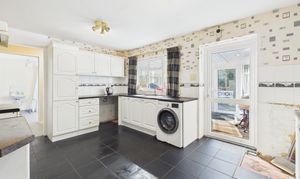 Entered under a storm porch, there is a main hall with an airing cupboard, a sitting/dining room, kitchen with conservatory beyond which includes a low level threshold into the garden, a utility, three-piece bathroom and a wet room (formerly a dining room). Interior doorways to kitchen, living room, wet room and conservatory have been replaced with new wider ones for easy wheelchair access.