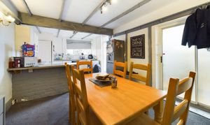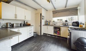 Open-Plan Kitchen Diner, comprising of a matching range of base and wall units, oven with four ring gas hob. Cupboard with plumbing for washing machine.