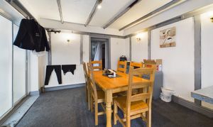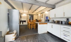 Lean-to leading off the kitchen, space for fridge freezer and storage. Door providing access to rear garden.