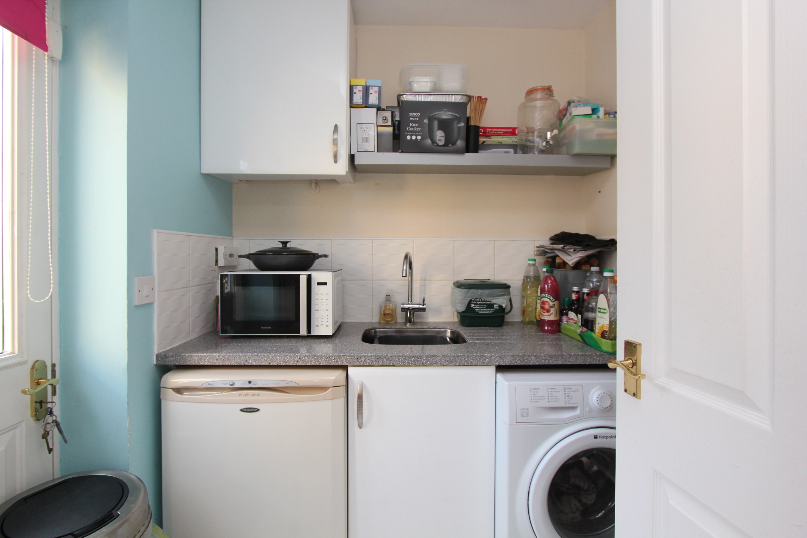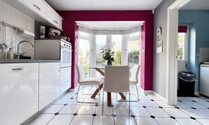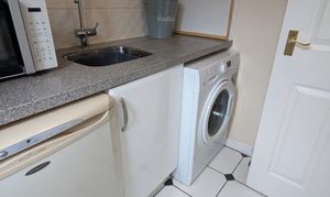 With continuation of the tiled floor. Base level units with work surfaces and secondary sink unit. Concealed boiler. Space and plumbing for appliances. Radiator plus partial glaze door out to the rear garden.