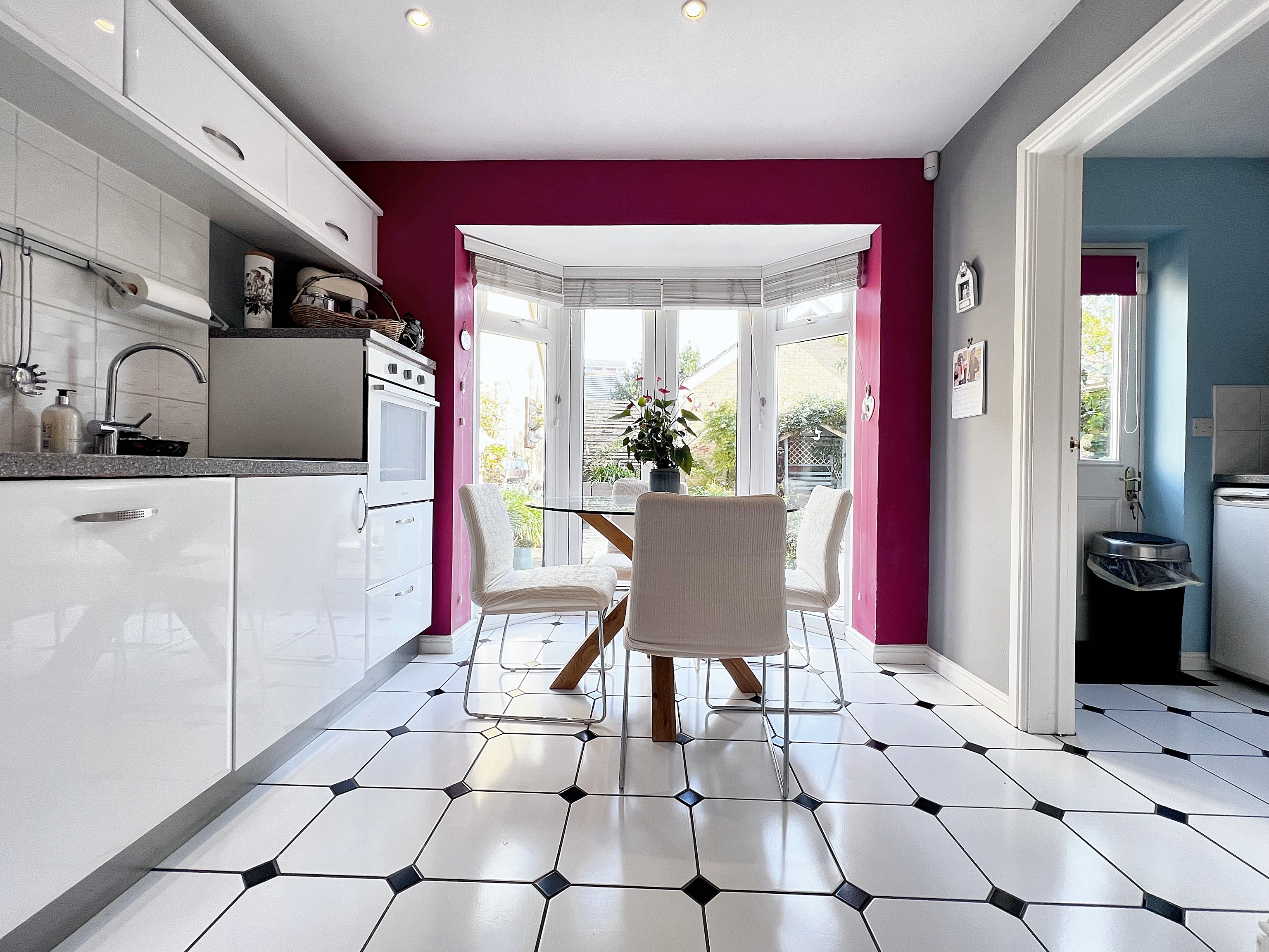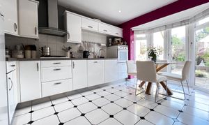 Kitchen in high gloss white with a range of eye and base level units and complementing workspace over. Integrated drainer and inset sink unit. Integrated gas hob, cooker hood and waist level oven plus dishwasher. Ceramic tile splash backs and floor. Plenty of space for table and chairs. Radiator. uPVC double opening doors onto the garden plus door off to the utility.