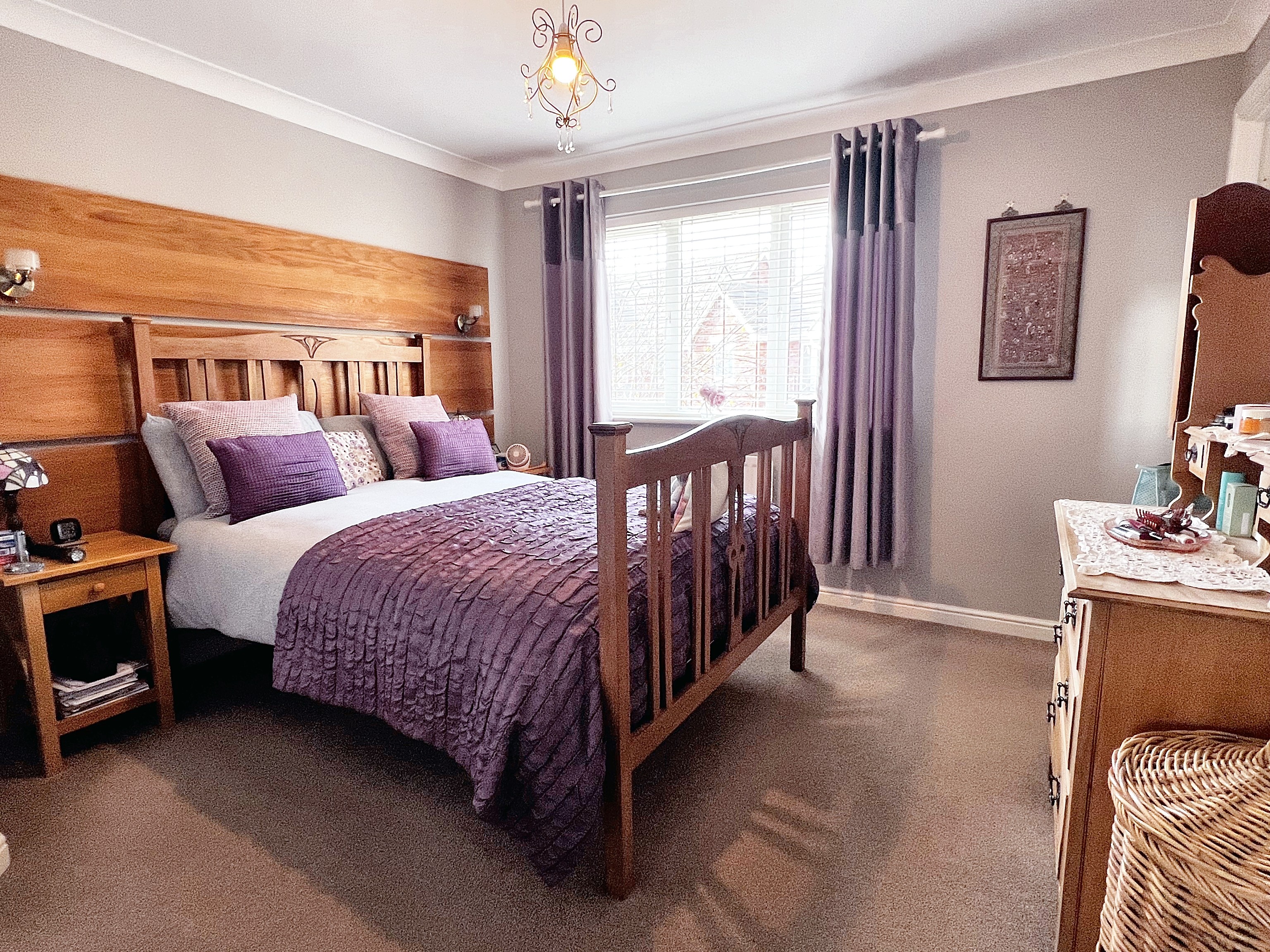 Carpeted double bedroom with front aspect window and radiator. Door to walk-in wardrobe which is carpeted and has plenty of hanging rail space and door off to the ensuite.